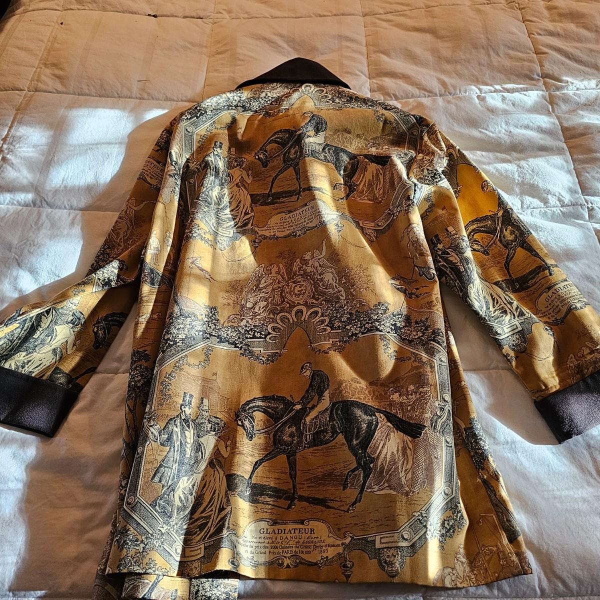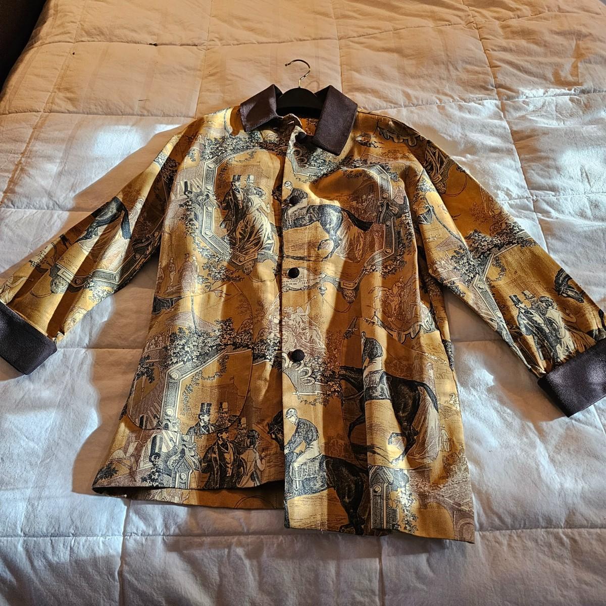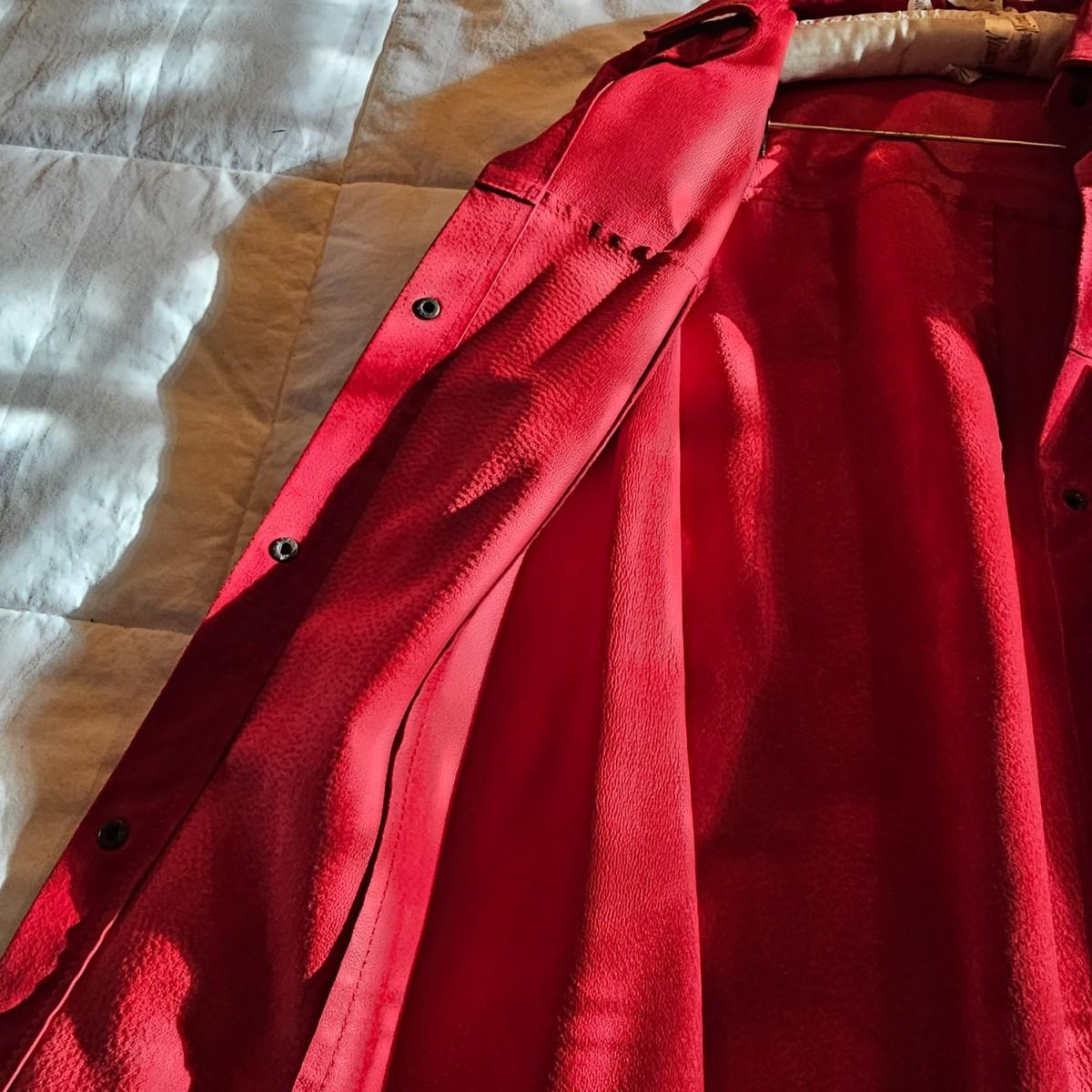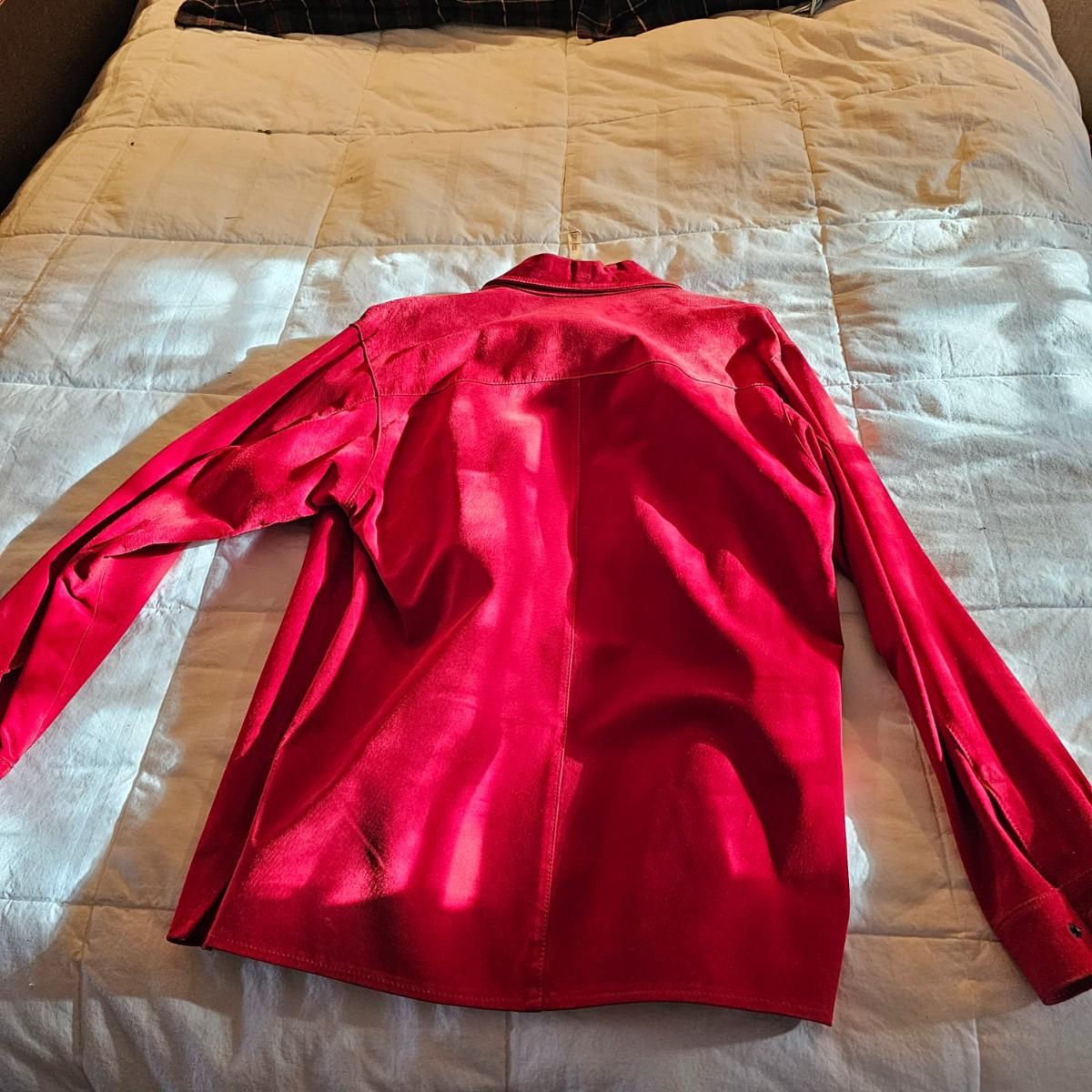 A trio of ladies fine fashion jackets in leather, suede and broadcloth. Camel color item is all leather with polyester lining, size L, by Saks Fifth Ave. Deep red item is by Rossi & Caruso, size L, is suede. Patterned jacket is by Susan McDuffie, is cloth with suede collar and cuffs. See photos for details. Shipping available.
