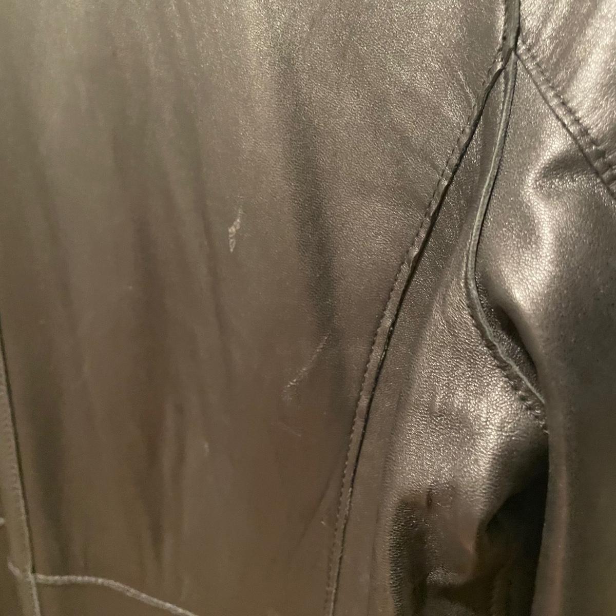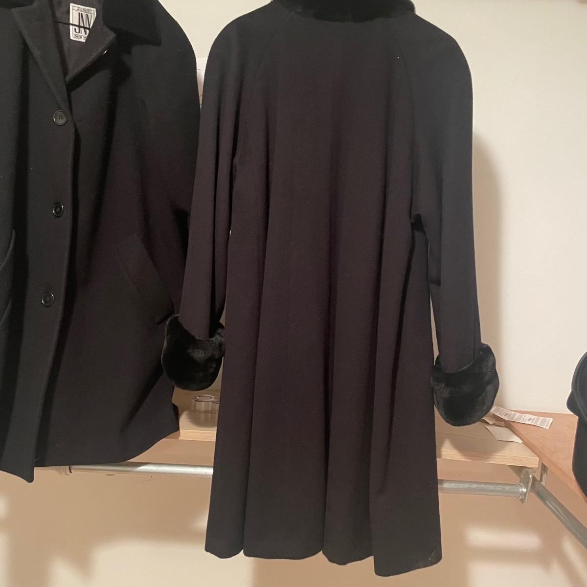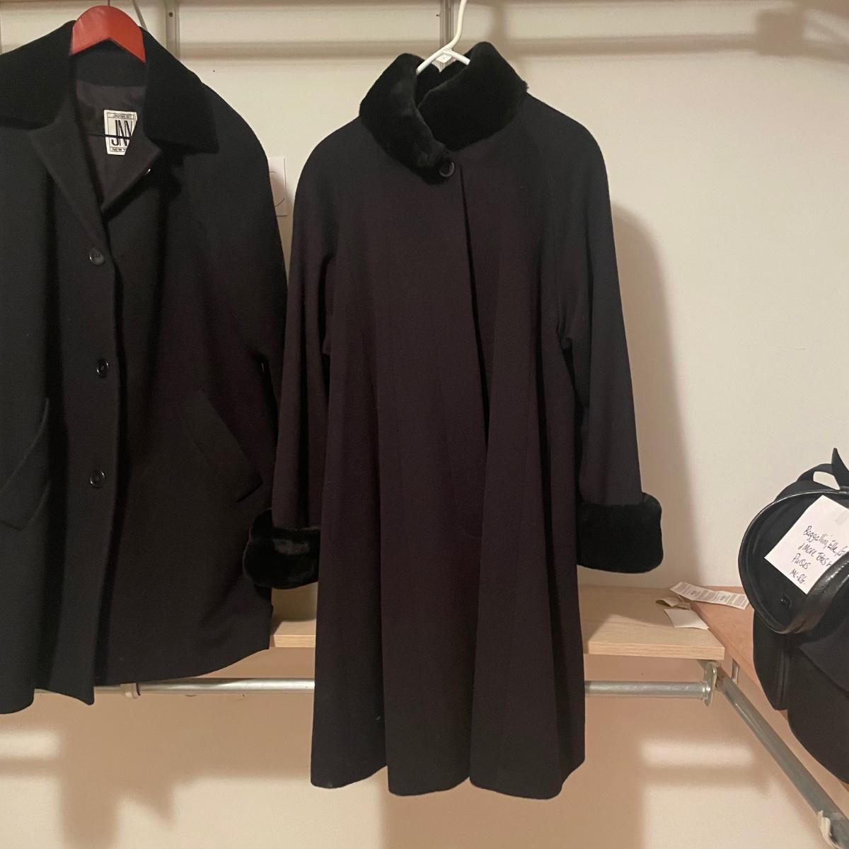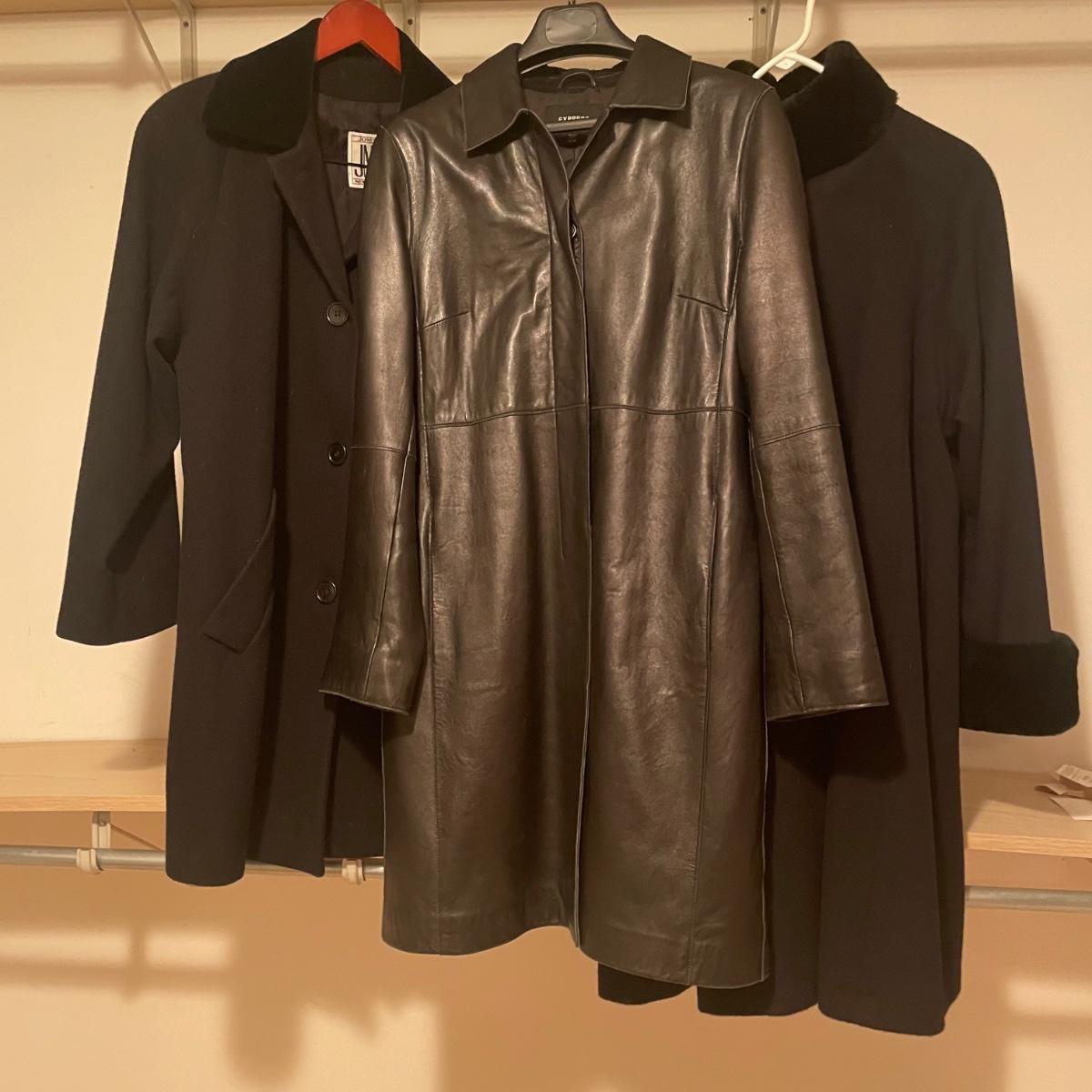 This black 100% leather jacket made by Express is size 13/14. It has a few light scratch marks shown in images. The Jones NY jacket is pure wool and measures 19” shoulder x 44”chest x 52” hips. The Steve & Searle jacket is size 8; it has no label to say what it is made of; it is wool or wool-like with faux fur cuffs and collar.