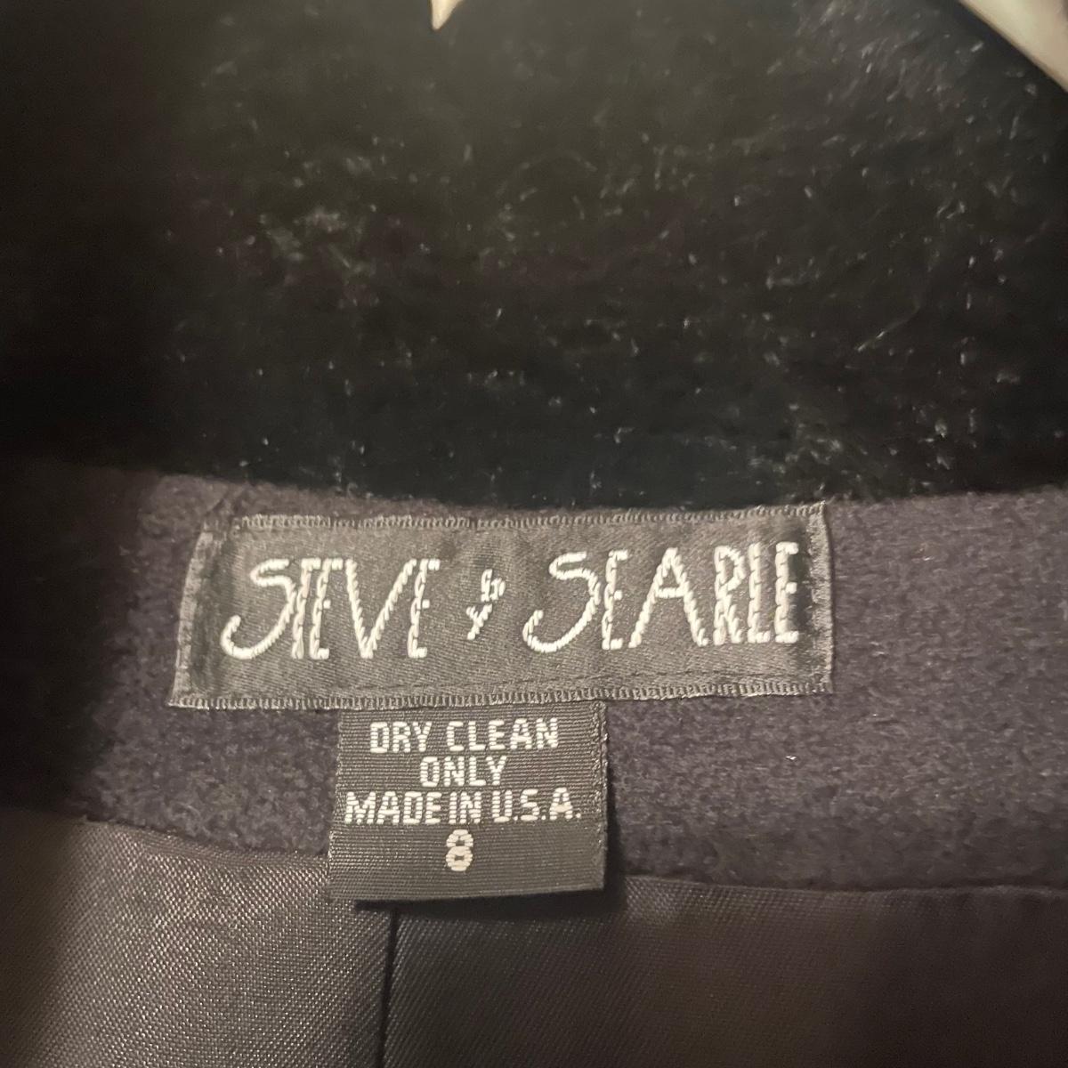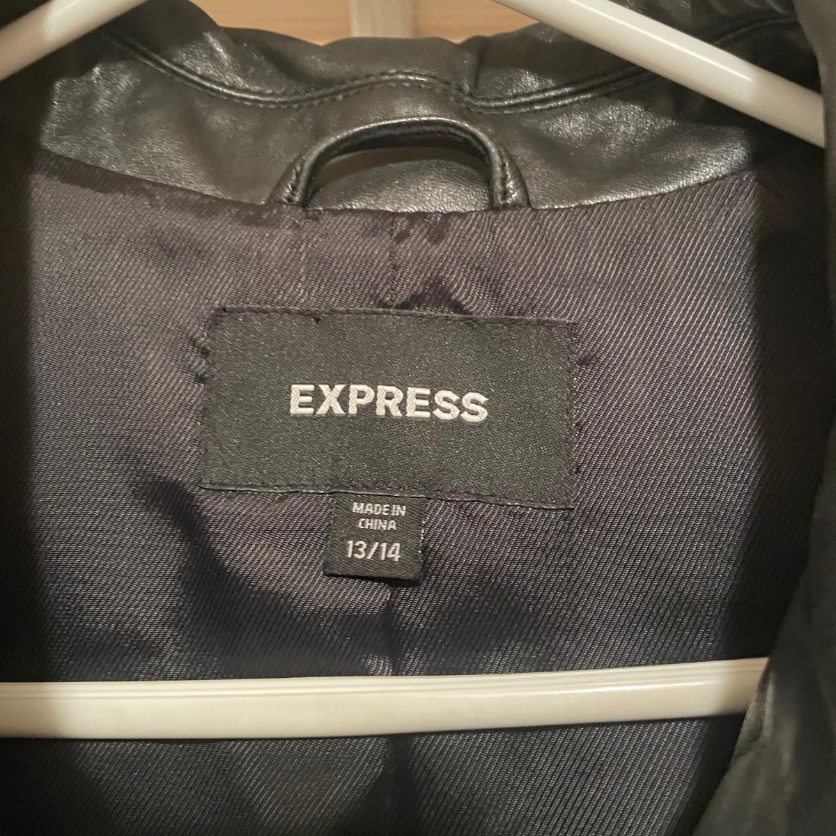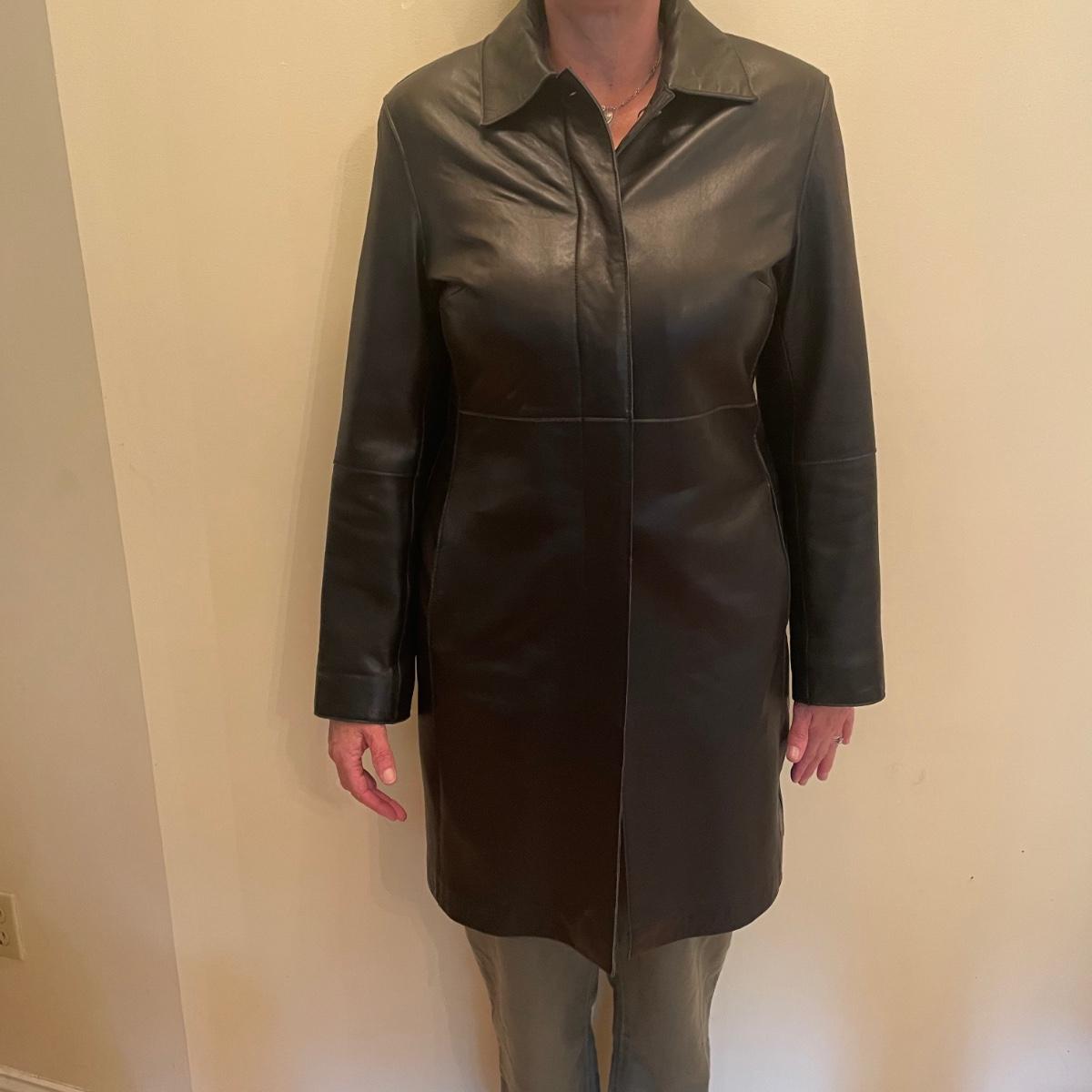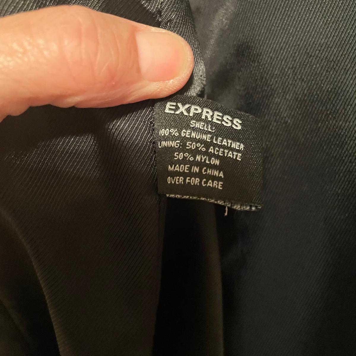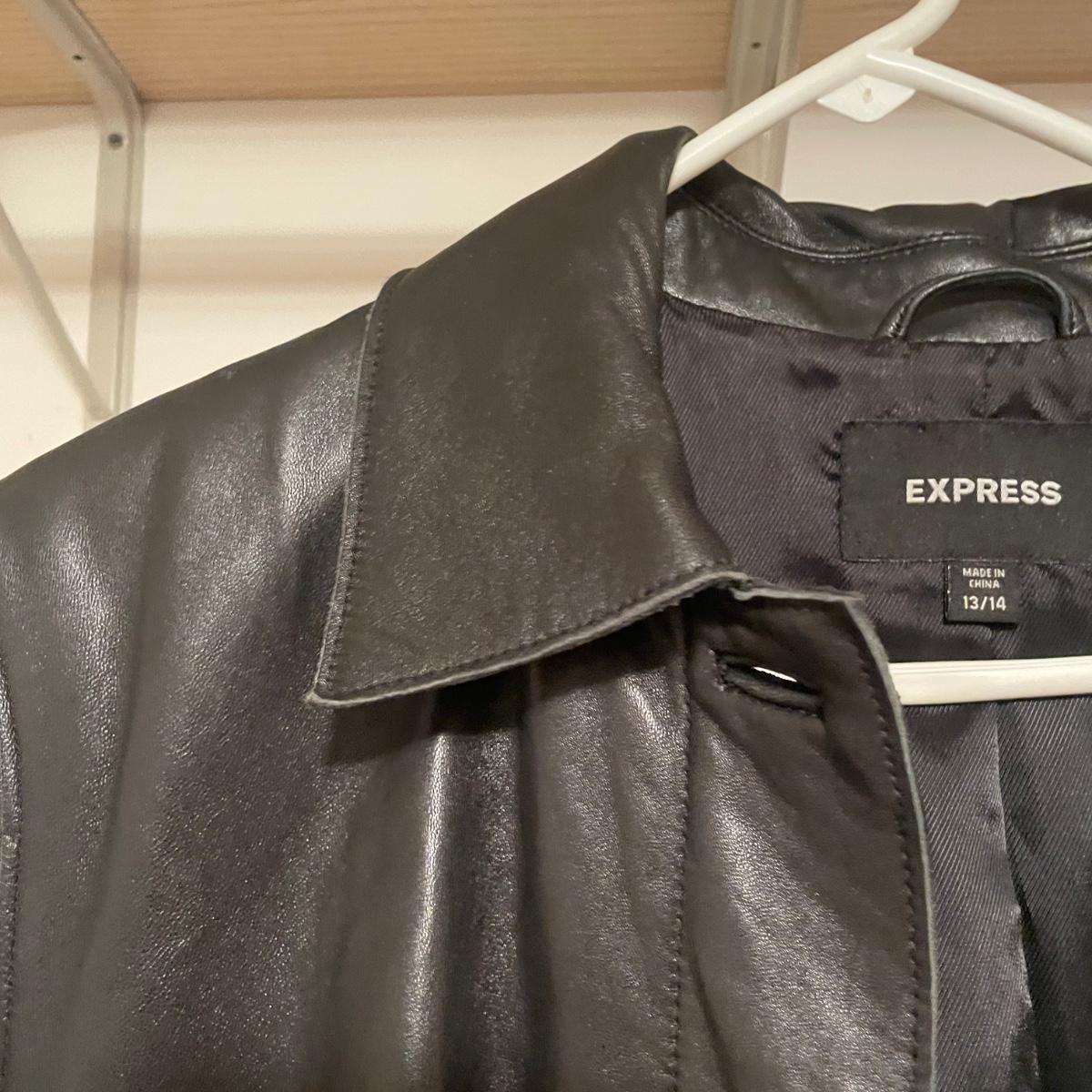 This black 100% leather jacket made by Express is size 13/14. It has a few light scratch marks shown in images. The Jones NY jacket is pure wool and measures 19” shoulder x 44”chest x 52” hips. The Steve & Searle jacket is size 8; it has no label to say what it is made of; it is wool or wool-like with faux fur cuffs and collar.