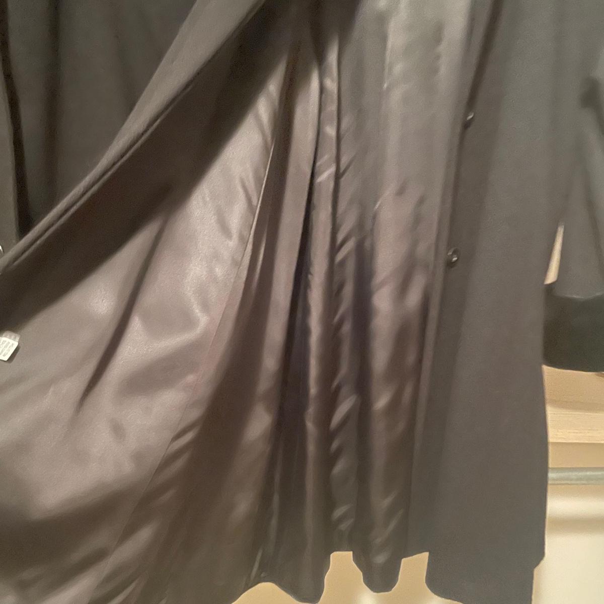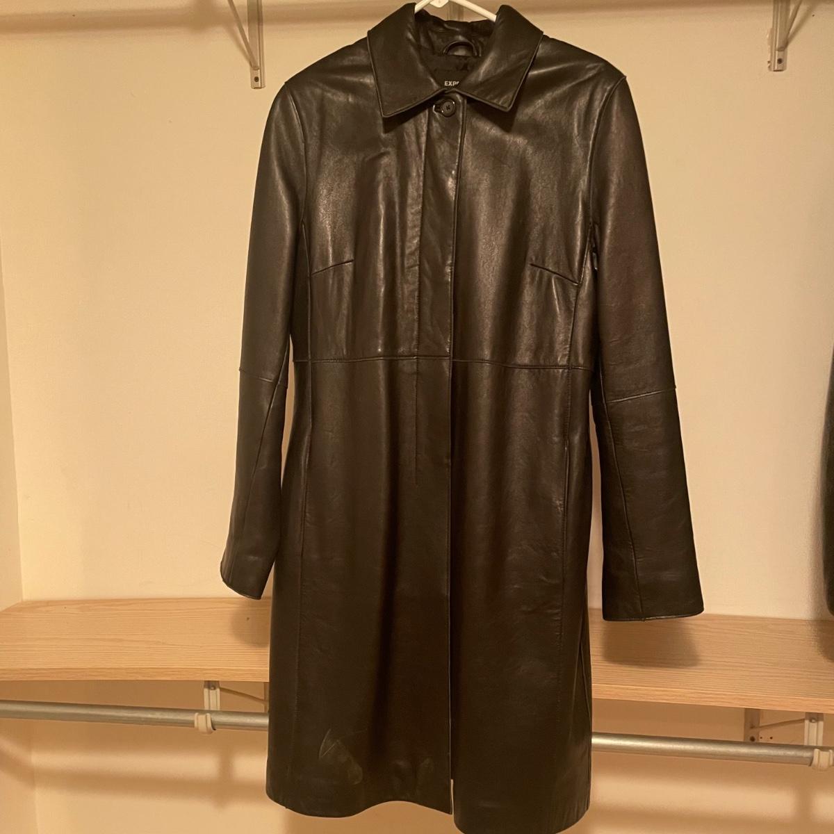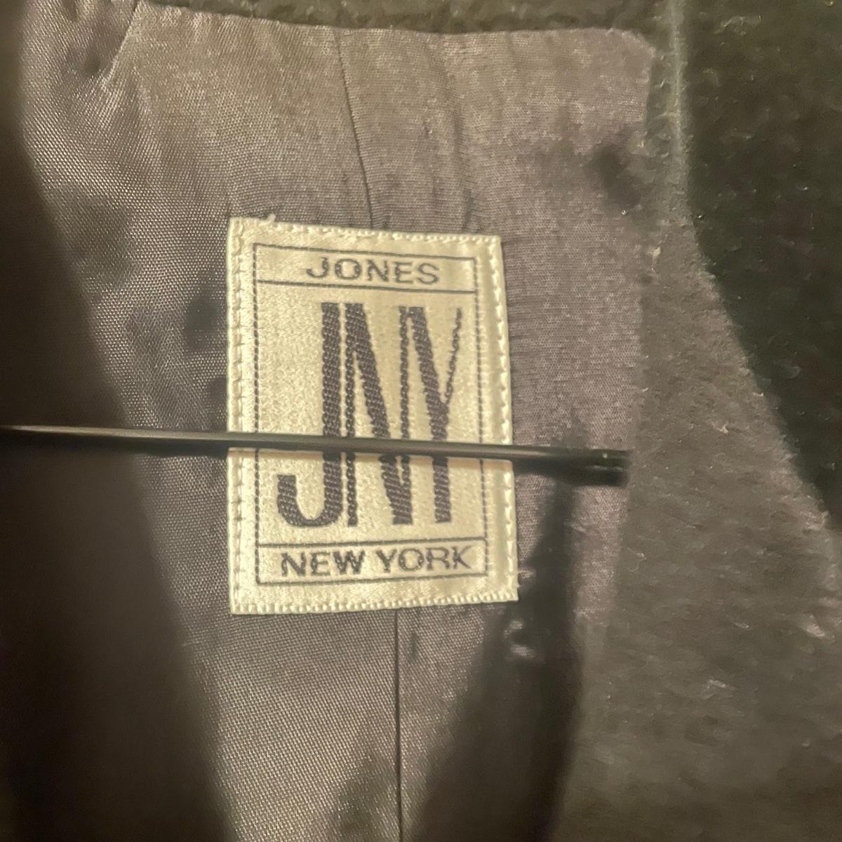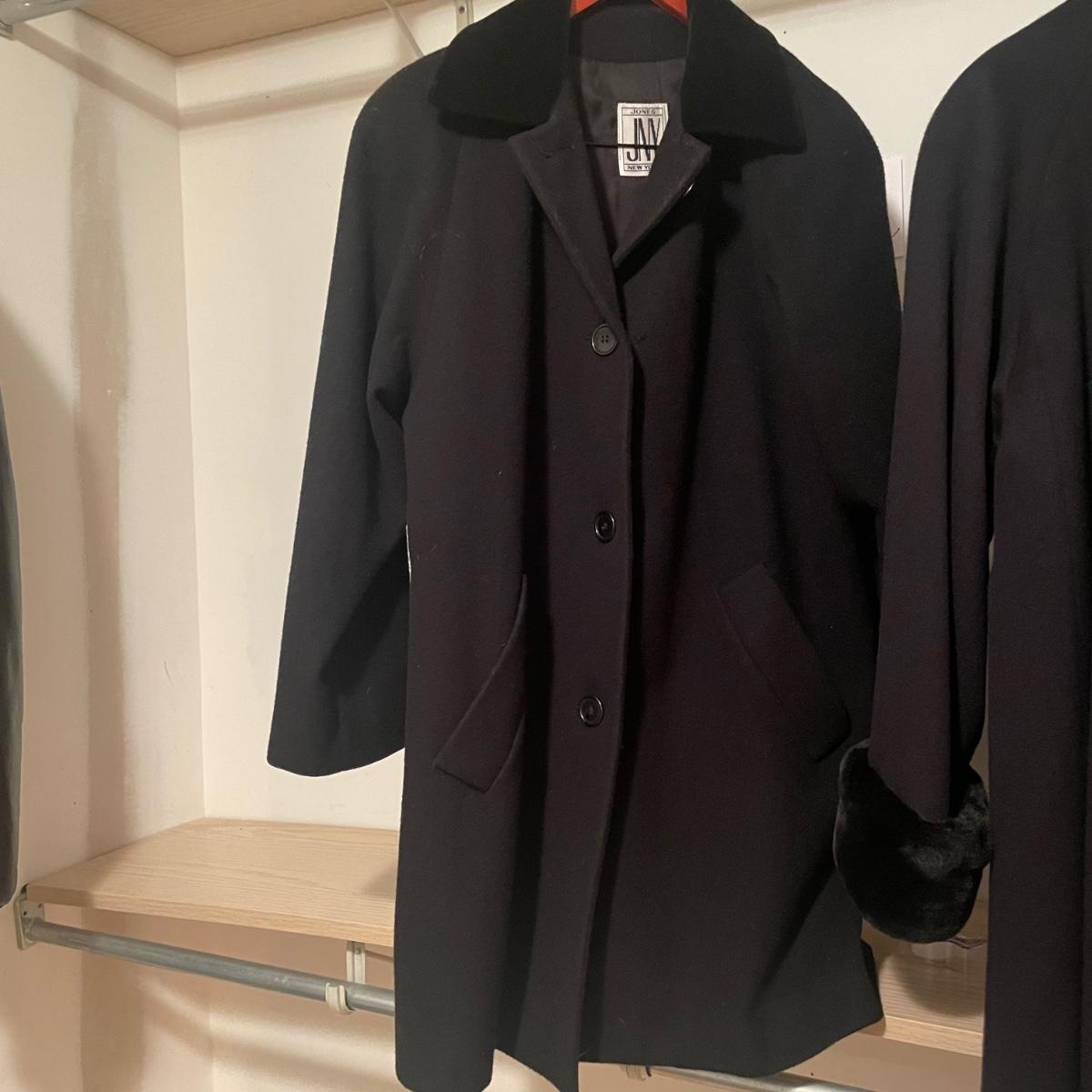 This black 100% leather jacket made by Express is size 13/14. It has a few light scratch marks shown in images. The Jones NY jacket is pure wool and measures 19” shoulder x 44”chest x 52” hips. The Steve & Searle jacket is size 8; it has no label to say what it is made of; it is wool or wool-like with faux fur cuffs and collar.