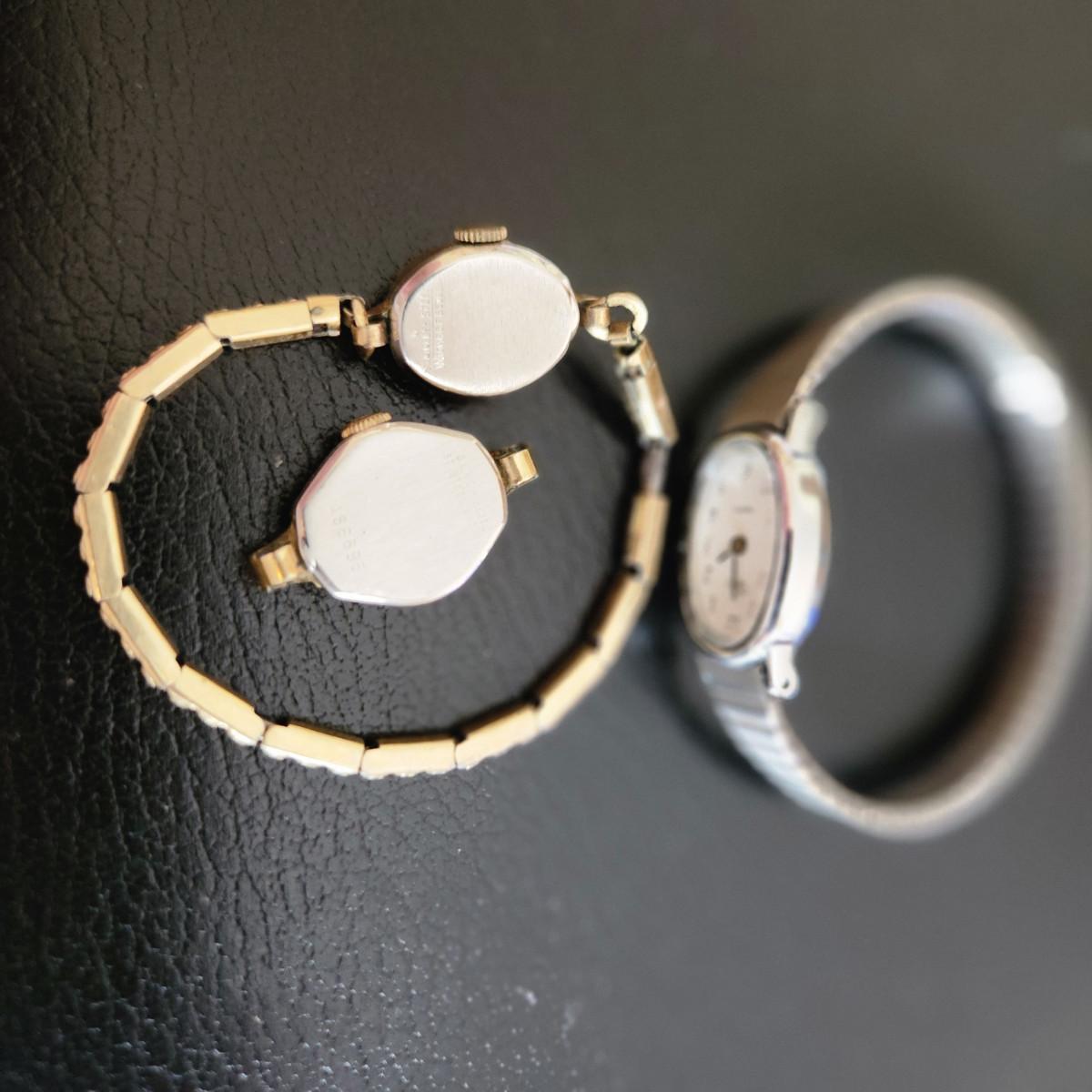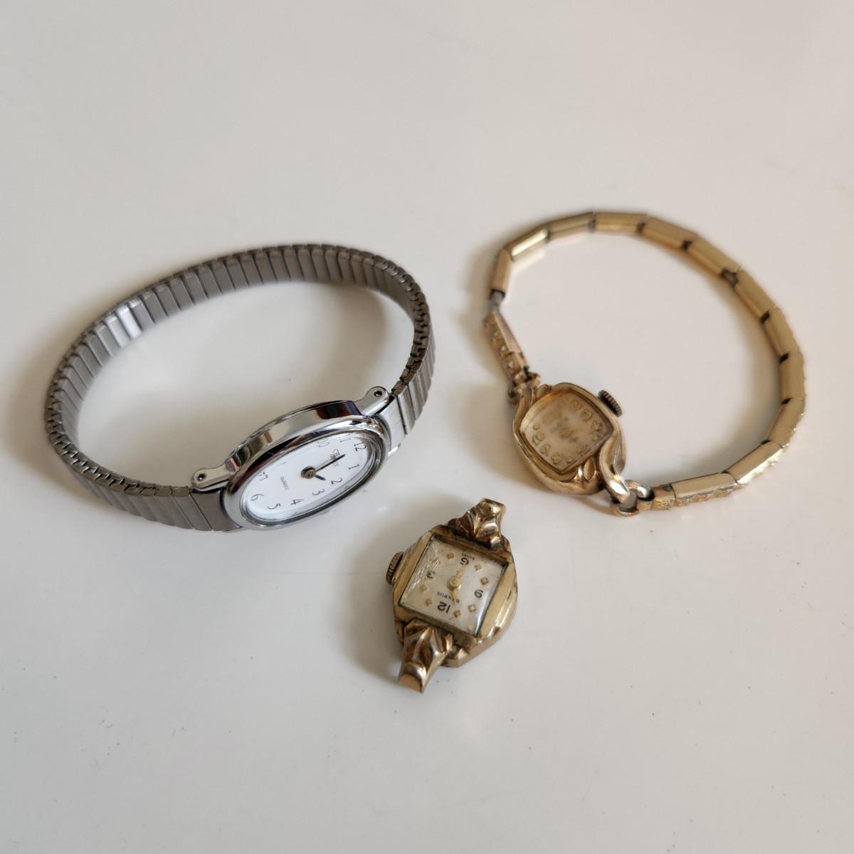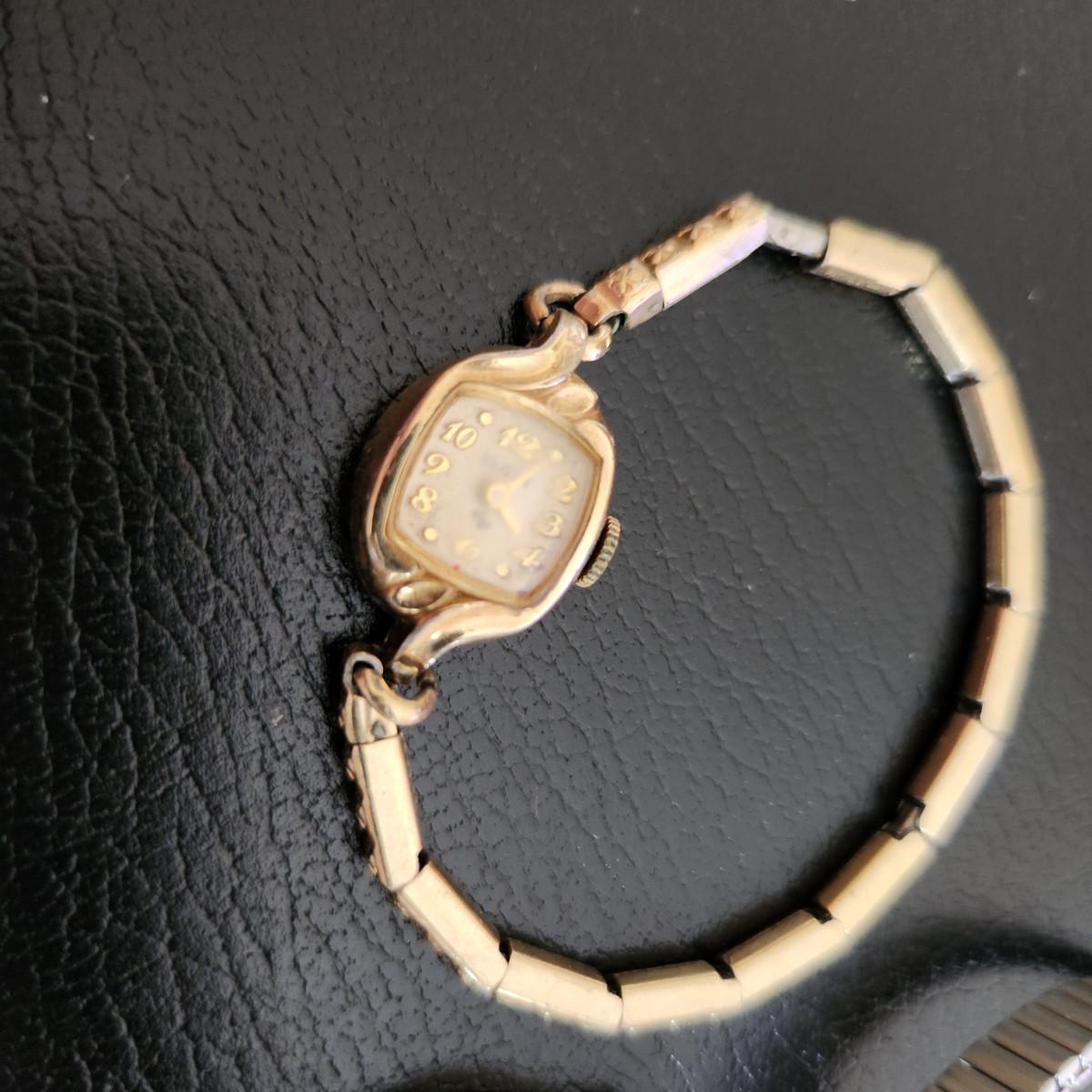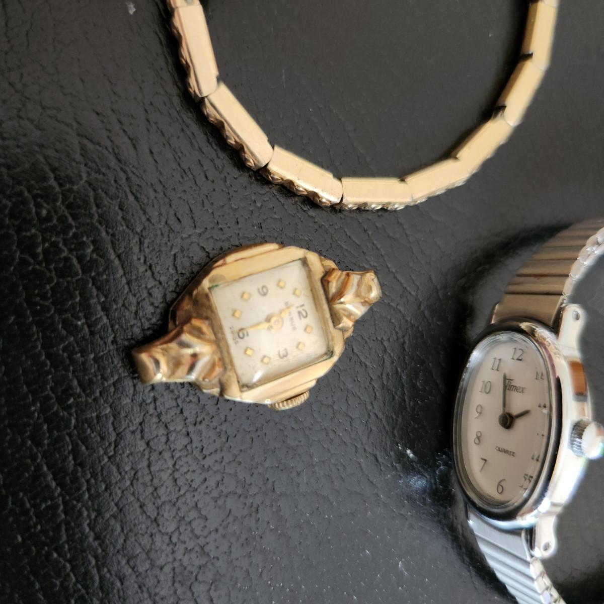This auction lot is for Three Ladies Watches. From our latest estate there is an everyday wear Timex - appears to only need a new battery to be ready to wear. There is an old Benrus watch marked Swiss made and show 10K RPG on the verso. The third watch is an Elgin - it is marked 10K RPG and comes with a nice band that is also marked 1/20 10K GF. Nice vintage watches.