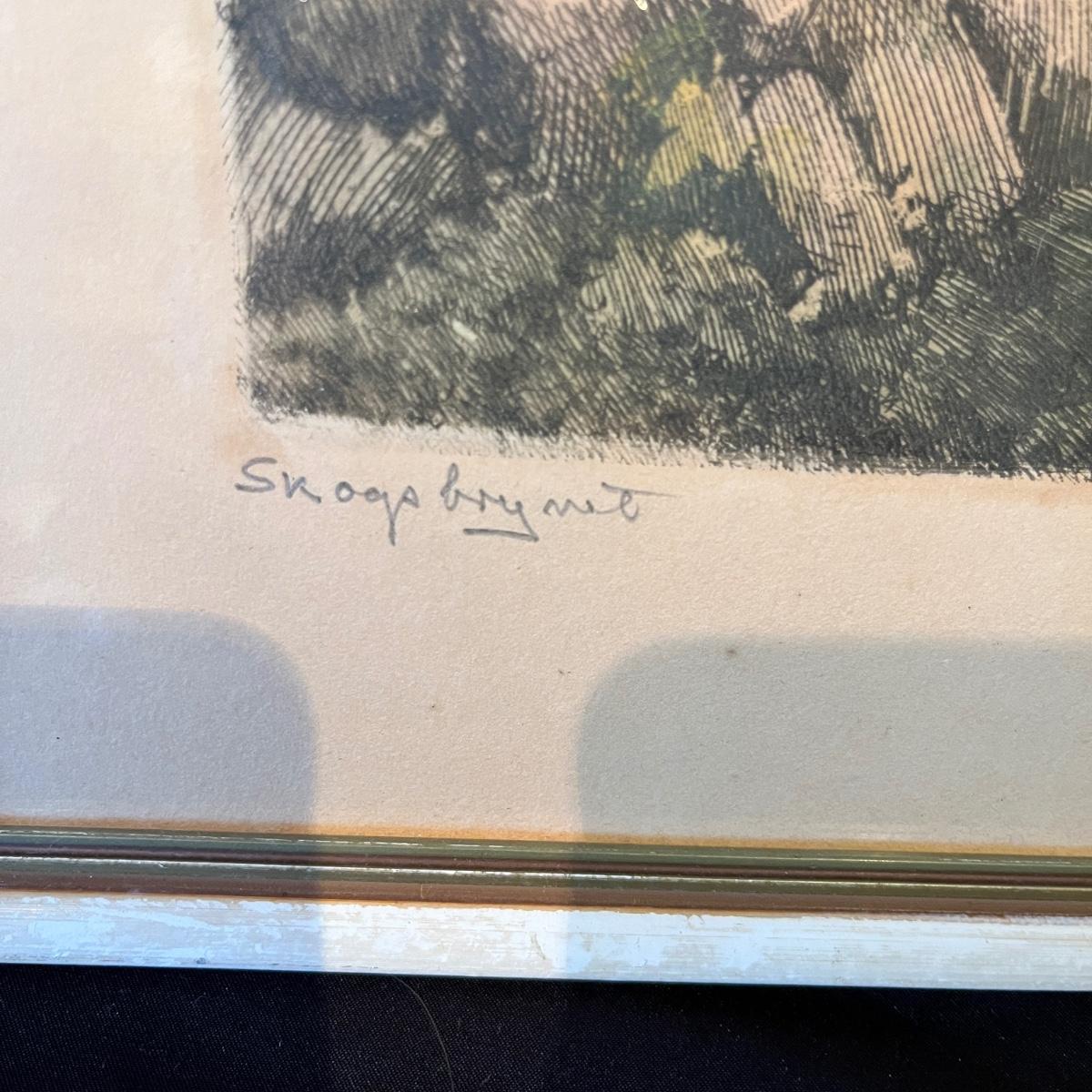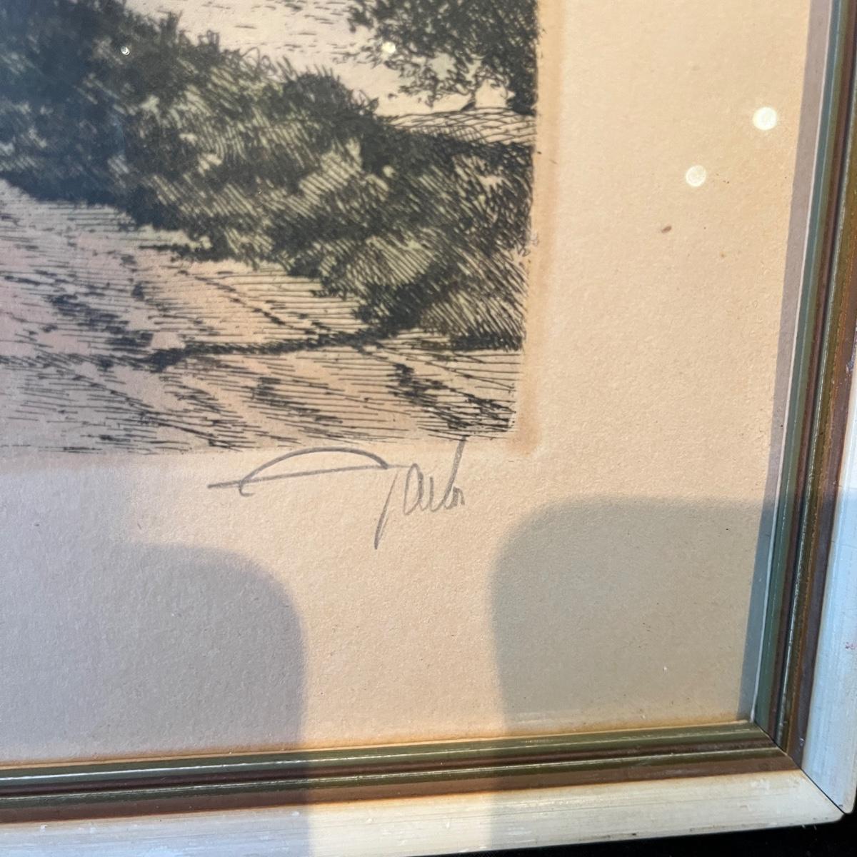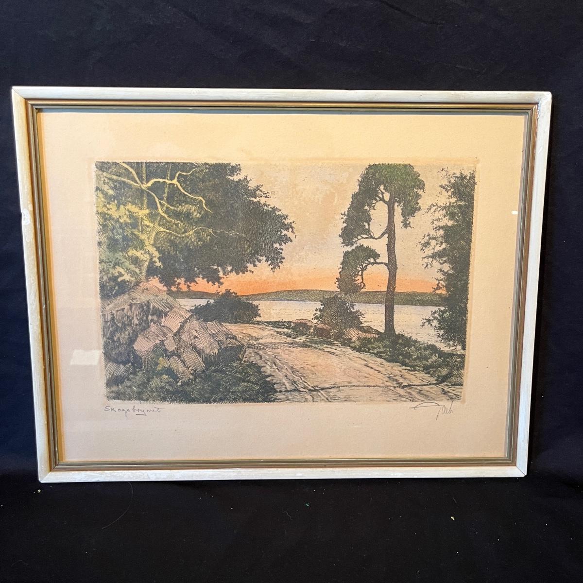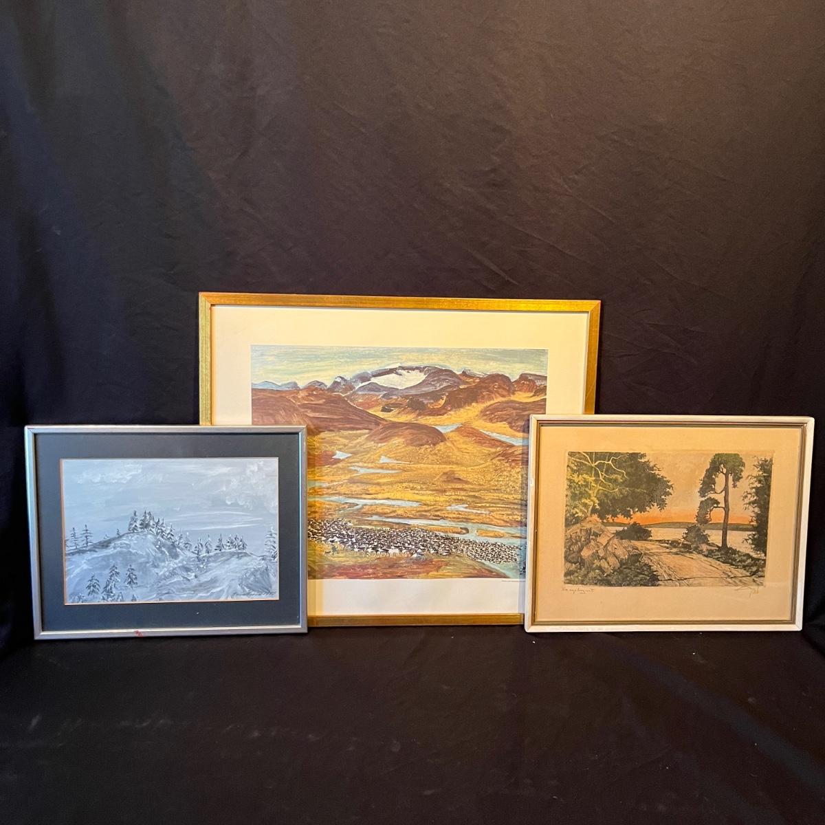Lot includes a metal framed print, metal framed and pencil signed painting, and a wooden framed pencil signed art that appears to be an etching. Language seems to be Swedish. Largest frame measures 20” x 17”H.