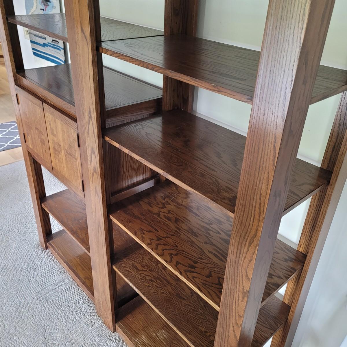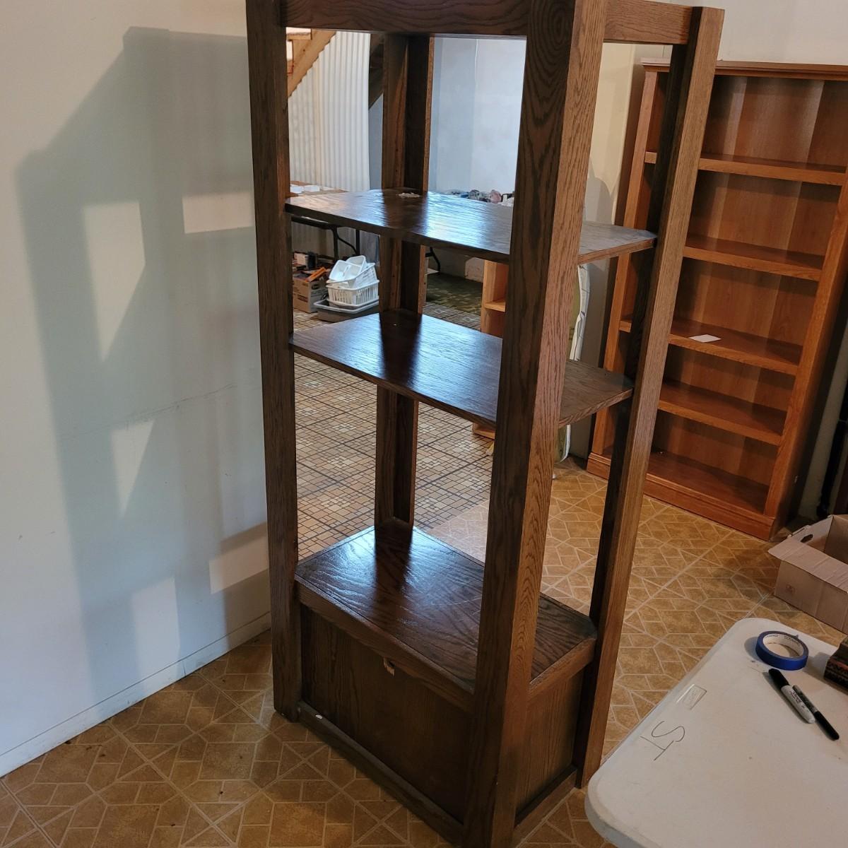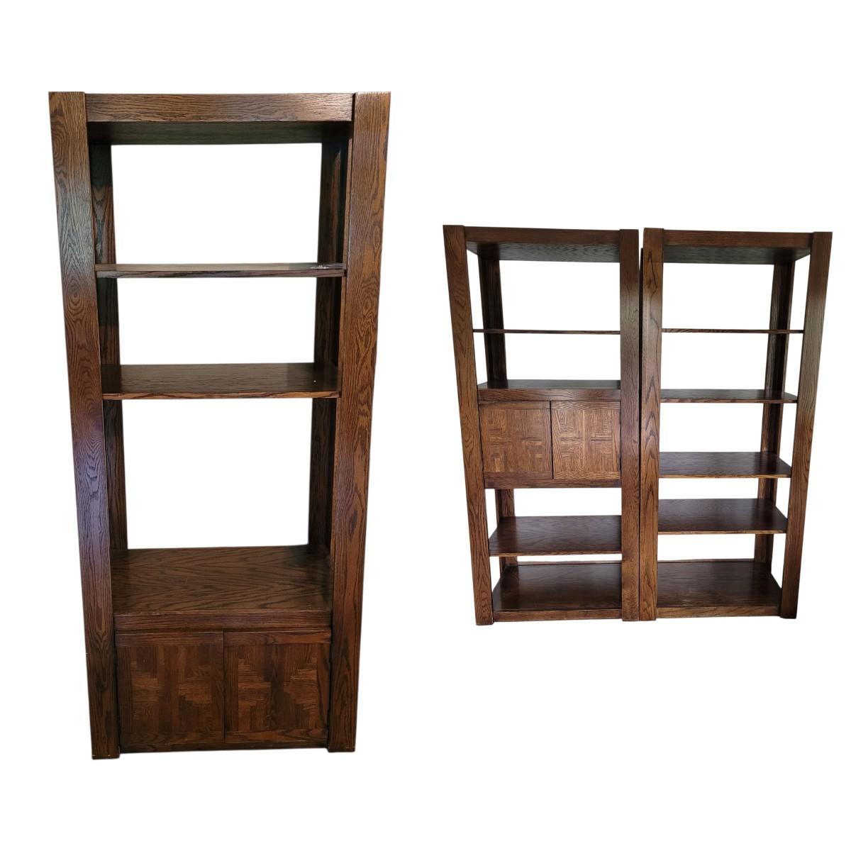 This lot includes three large wooden display shelves. The shelves are matching, but not identical. Two of the shelves have a built in cabinet, one is located in the center of the shelf, and the other is located on the bottom or base of the shelf. The third shelf does not feature a cabinet. All units include adjustable wooden shelves, and there is an included spare as a backup. Individually the shelves measure 33" x 19.5" x 76"H.