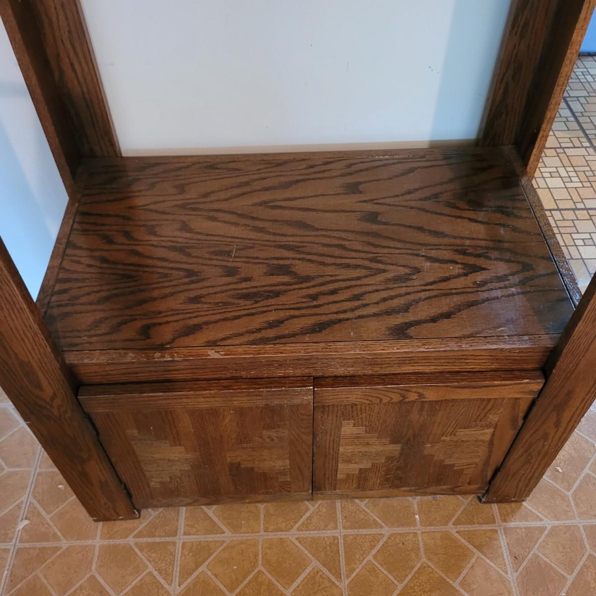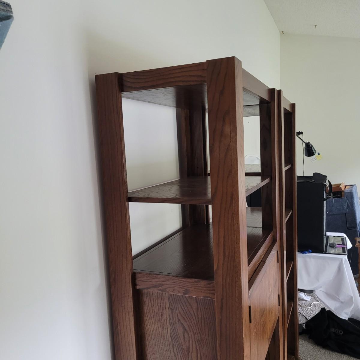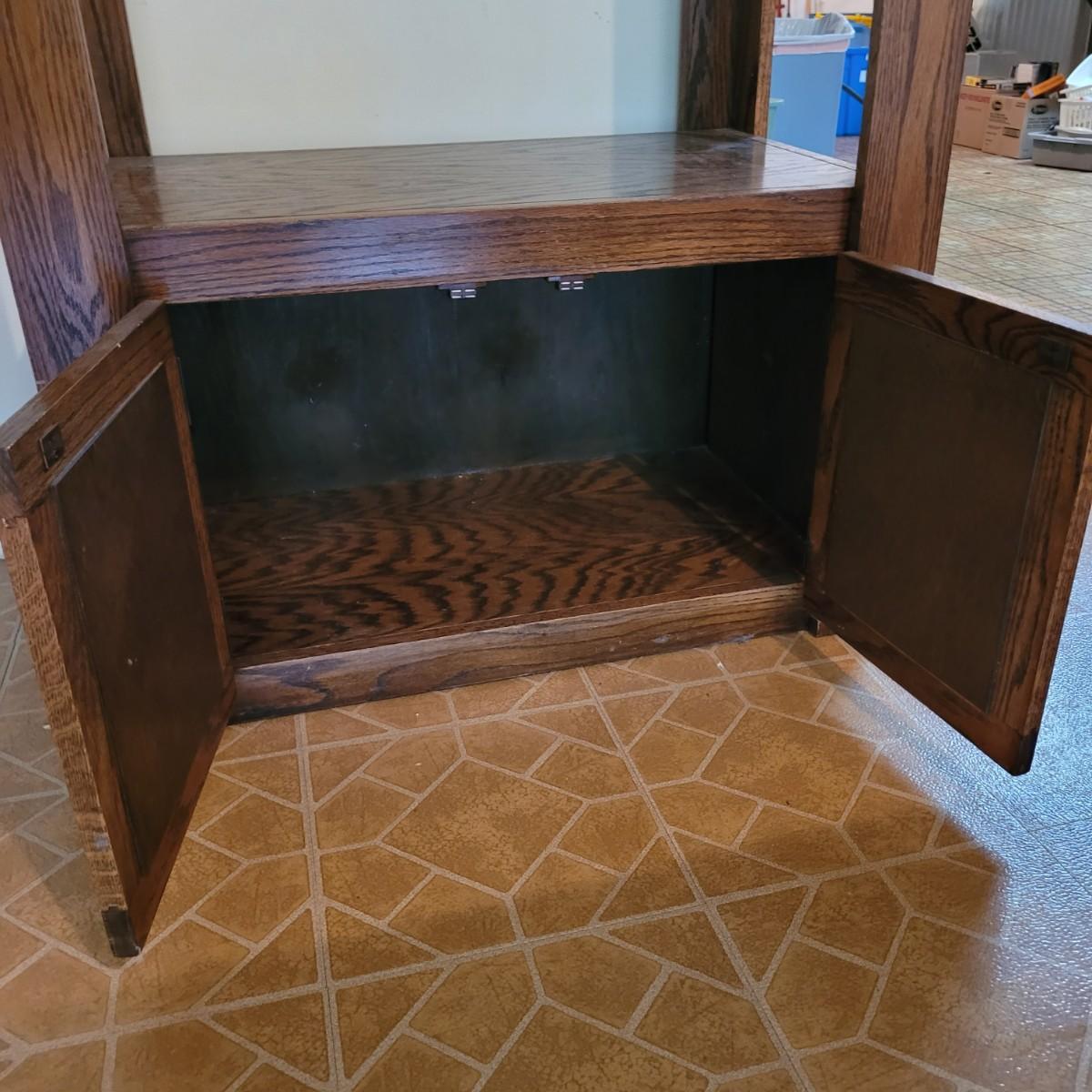This lot includes three large wooden display shelves. The shelves are matching, but not identical. Two of the shelves have a built in cabinet, one is located in the center of the shelf, and the other is located on the bottom or base of the shelf. The third shelf does not feature a cabinet. All units include adjustable wooden shelves, and there is an included spare as a backup. Individually the shelves measure 33" x 19.5" x 76"H.