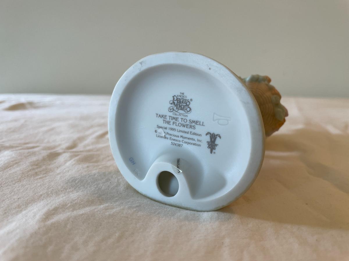 Precious Moments figurine titled 'Take Time To Smell The Flowers.' The figurine, made of porcelain, measures about 5 inches tall and 3 inches wide.
