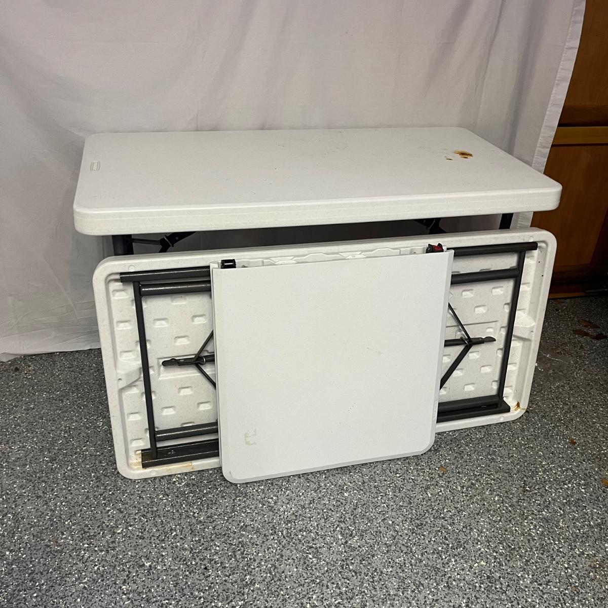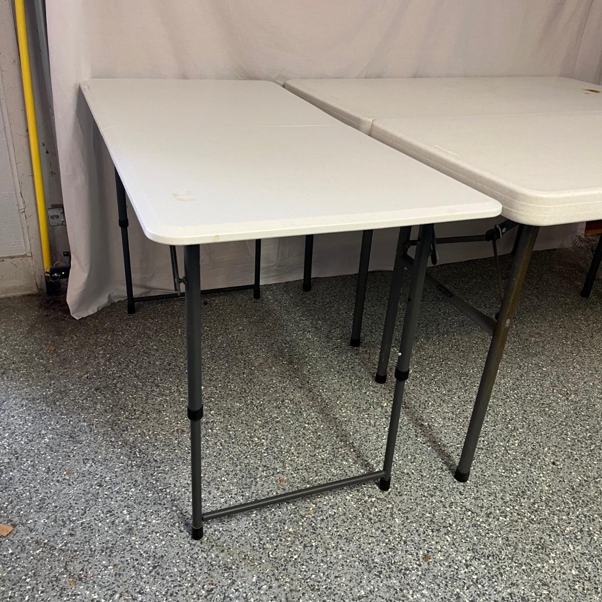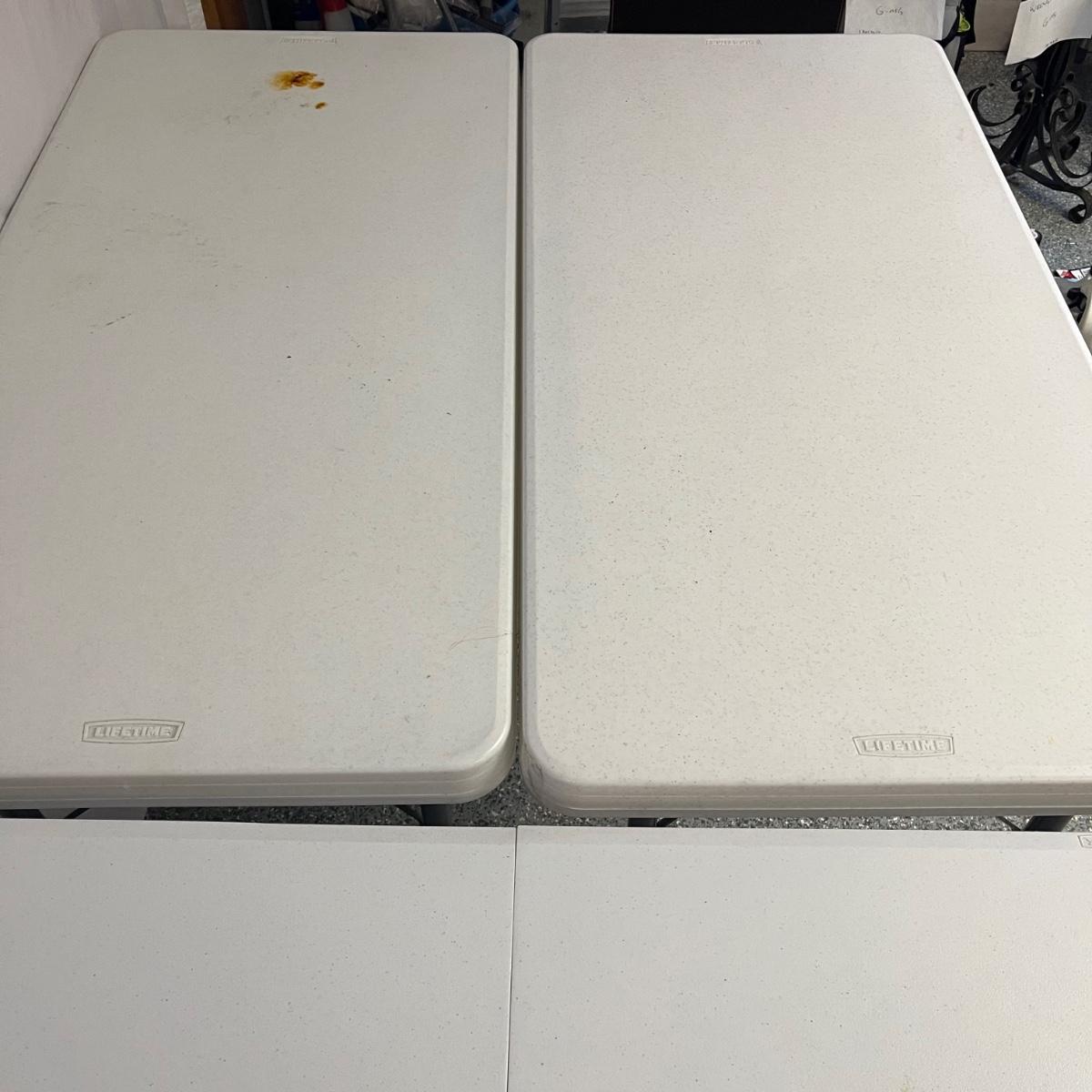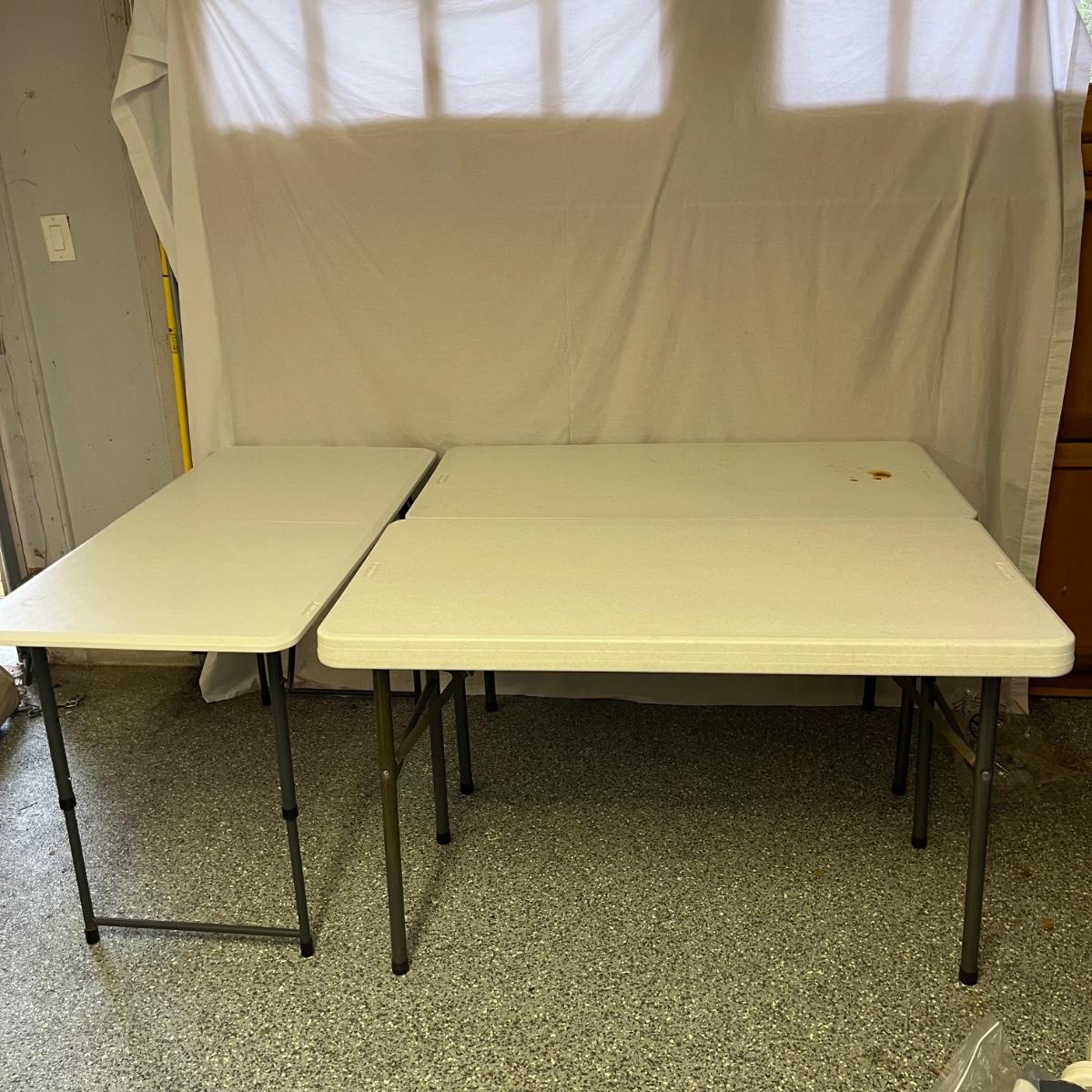 Lot includes three Lifetime tables with folding legs. Tables measure 24” x 48” x 30”. One table has stains and a gouge, see pictures.