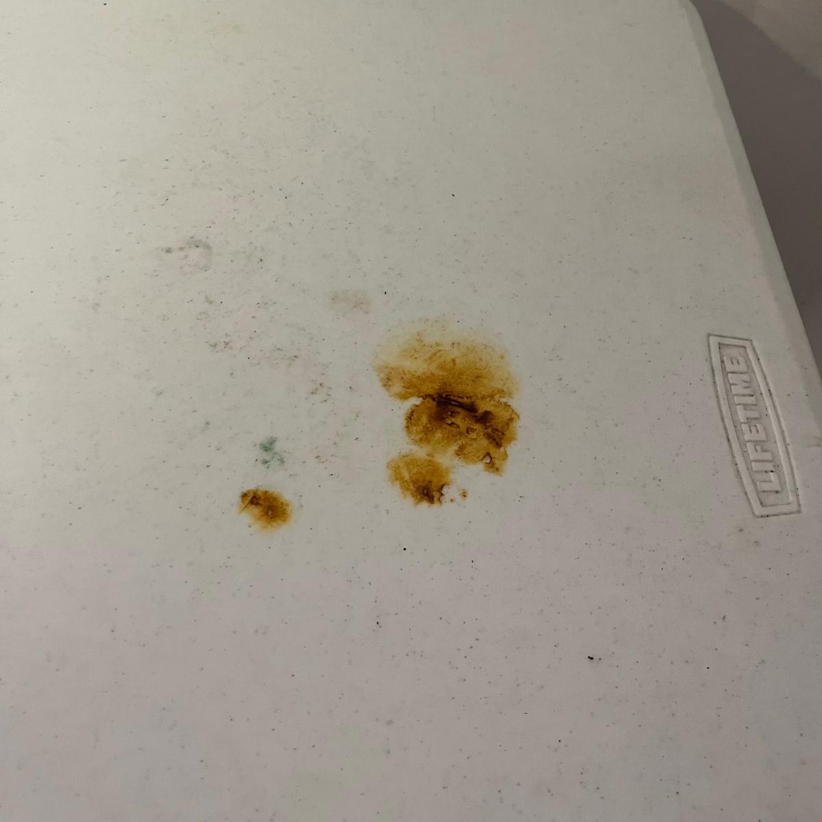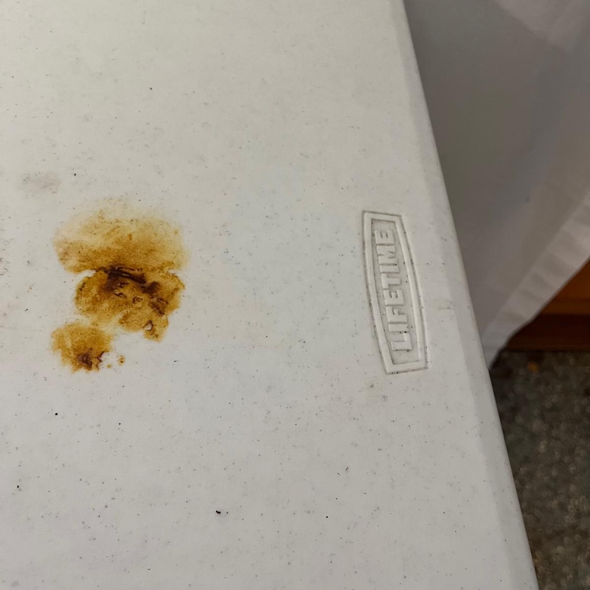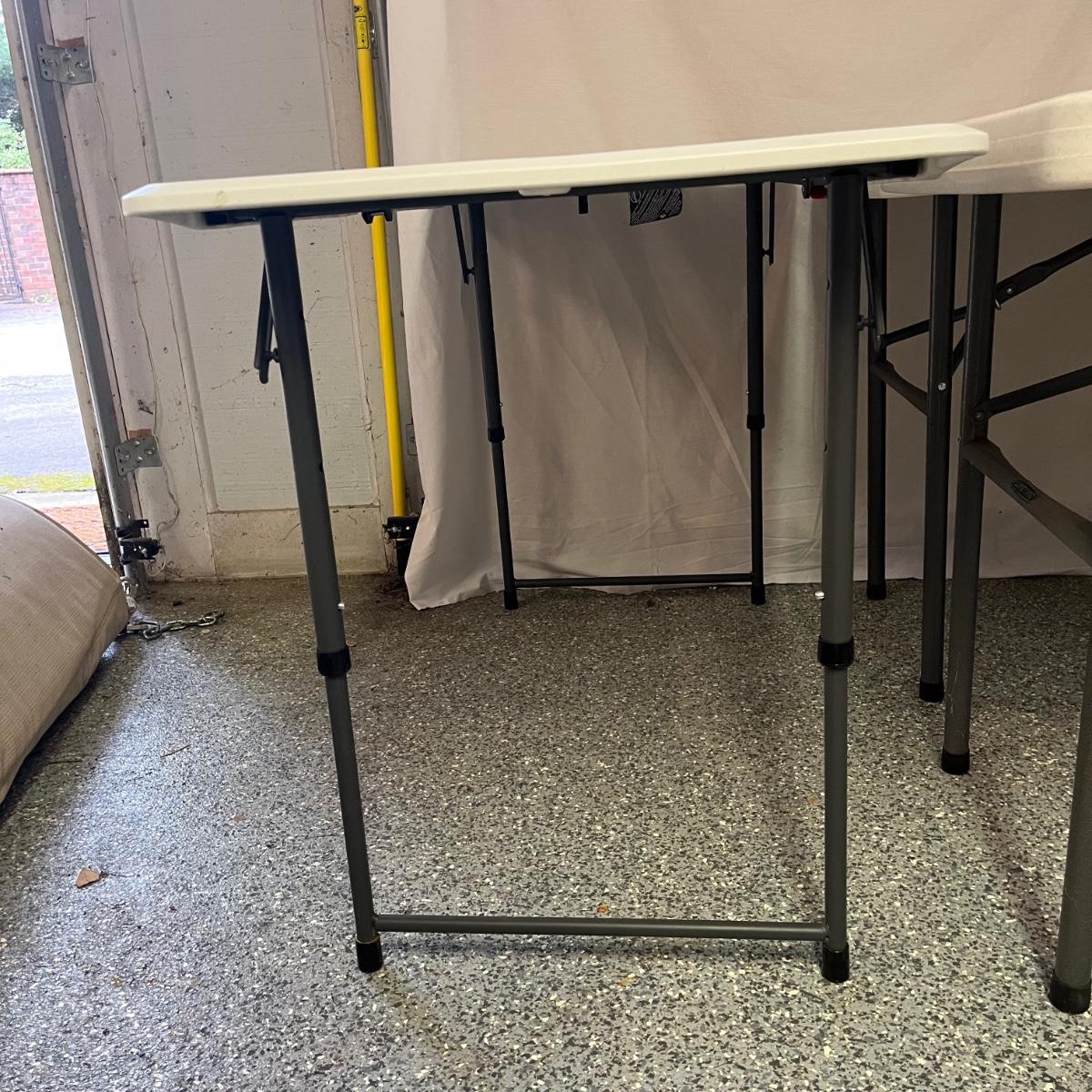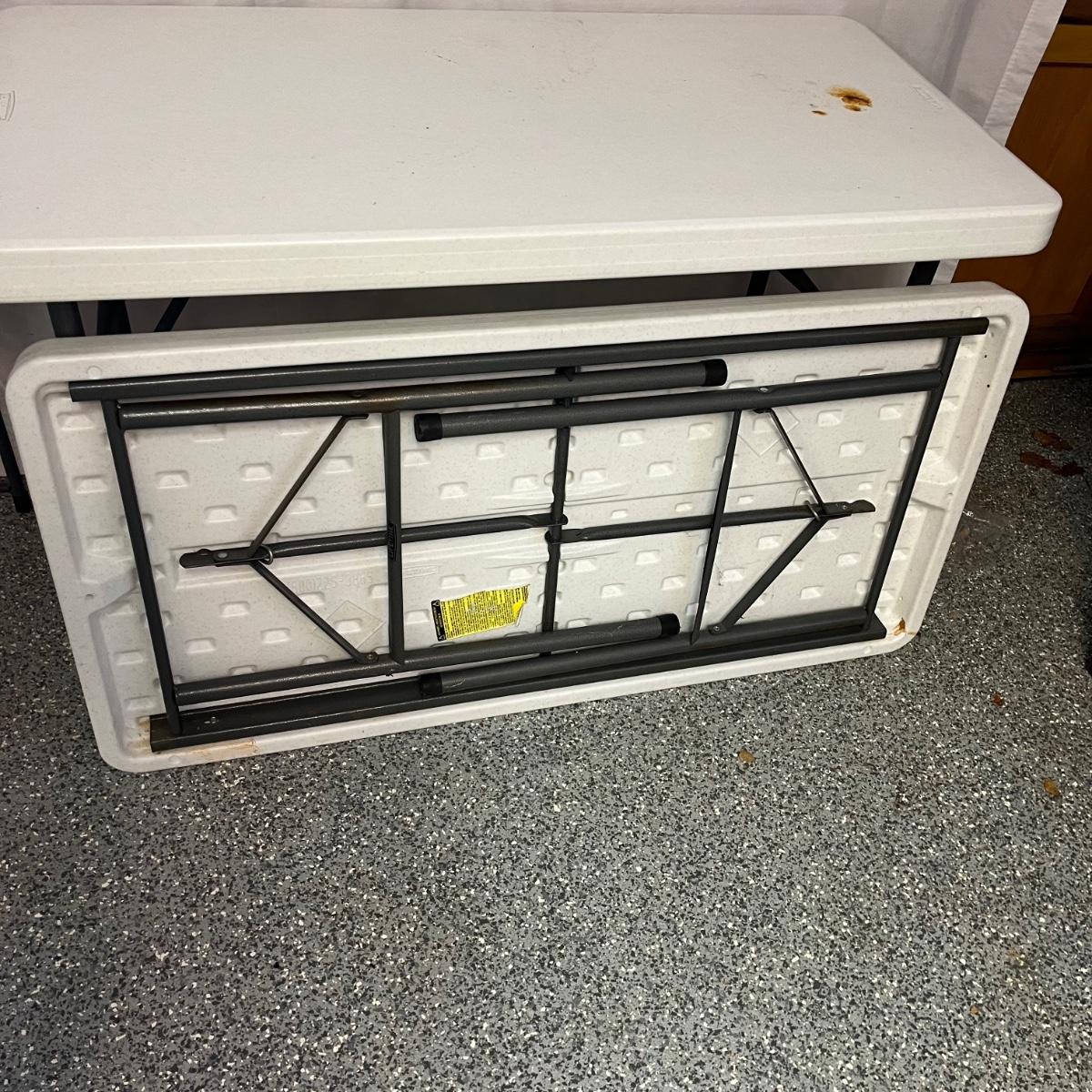Lot includes three Lifetime tables with folding legs. Tables measure 24” x 48” x 30”. One table has stains and a gouge, see pictures.