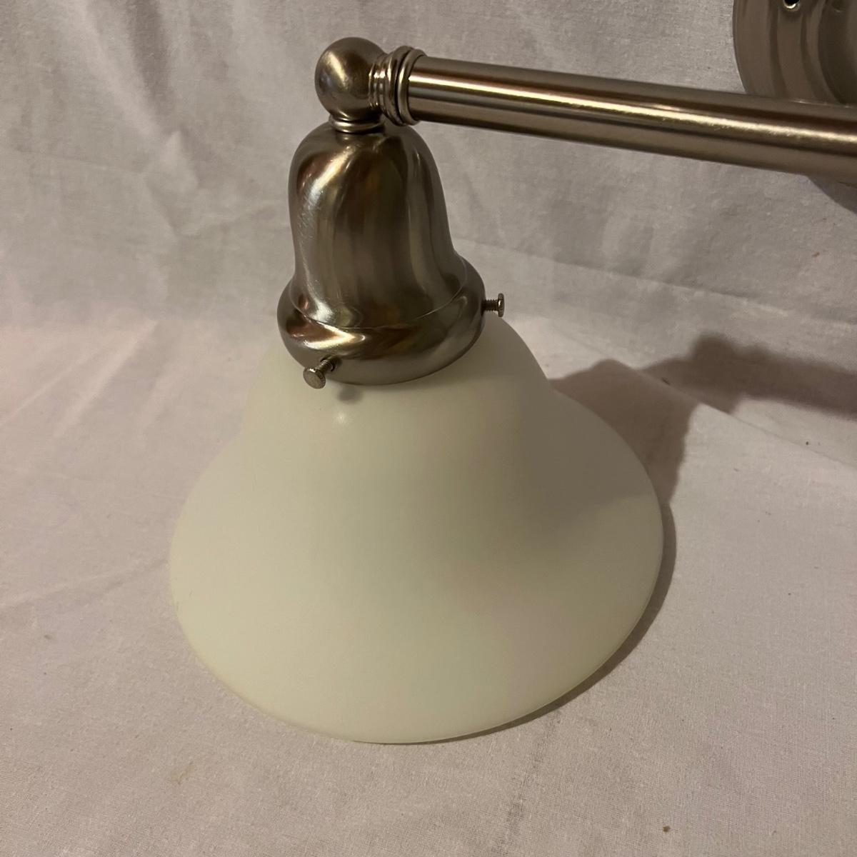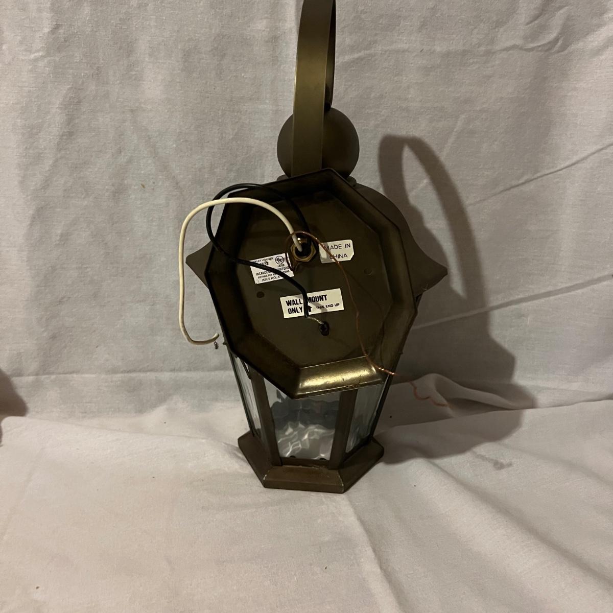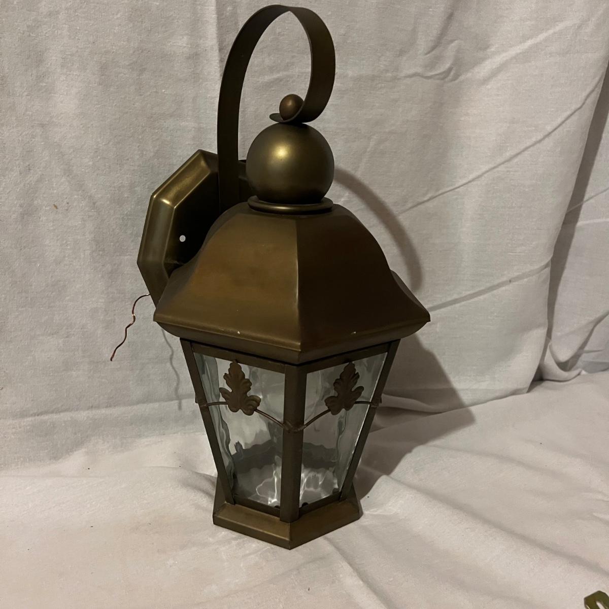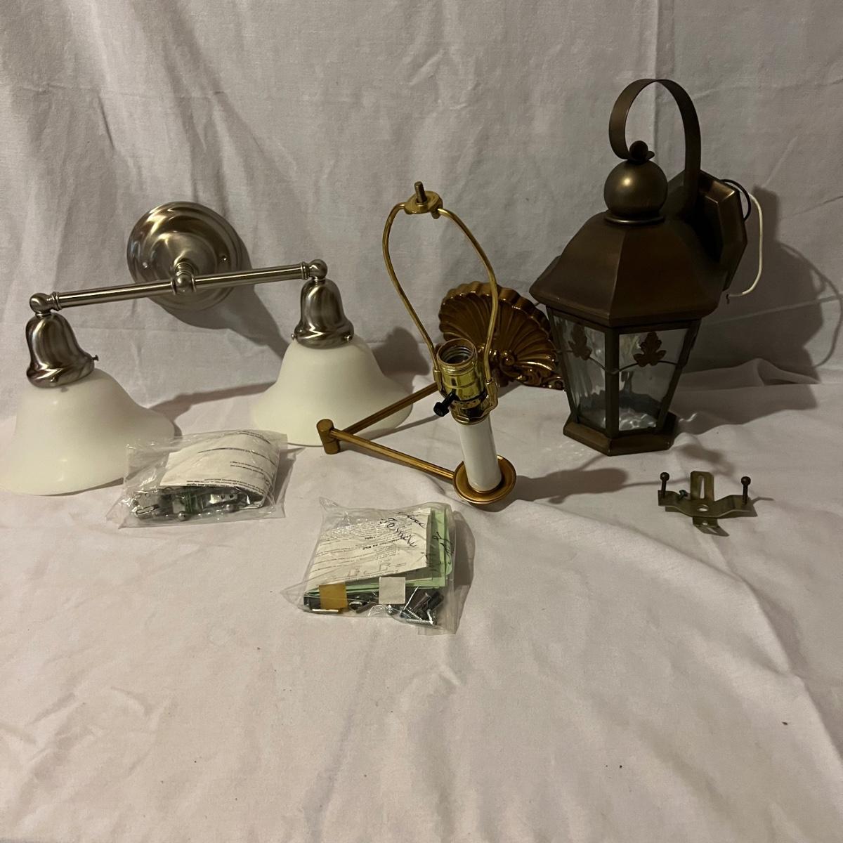 Three light fixtures. One antique, brass, slim line sconce, measures approximately 19” when arm is fully extended. The base plate that connects to the wall is approximately 7”D. The switch is three-way. It comes with a bag of hardware, believed to be what is necessary to hang on the wall. An exterior wall mount lantern with an oil rubbed bronze like finish with glass sides measures approximately 9”D x 14” H. The base plate that attaches to the wall is approximately. 5”D. The fixture comes with a mounting bracket that is believed to be needed to mount to the wall. Lastly, a two light wall-mount bathroom fixture. includes mounting instructions, and a bag of hardware believed to be necessary to mount to the wall. The finish is brushed nickel, and the piece measures approximately. 19” x 9.5” x 7”H. The glass shades are frosted white.