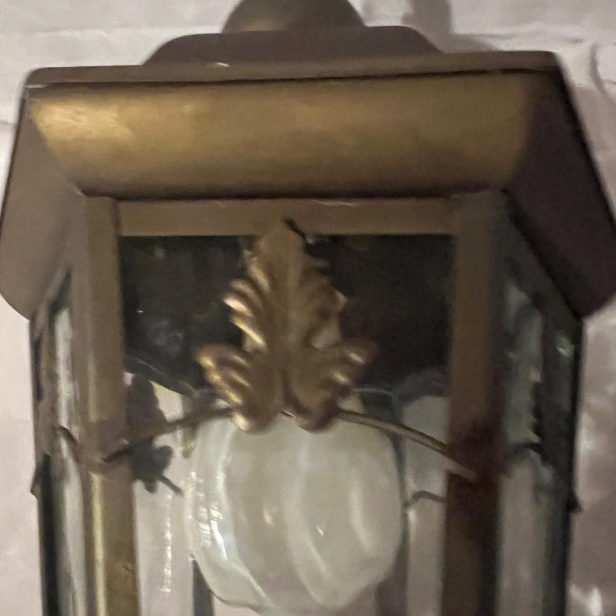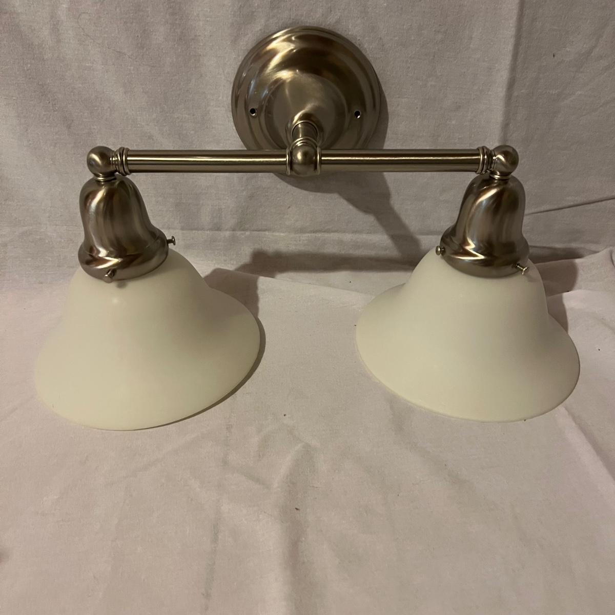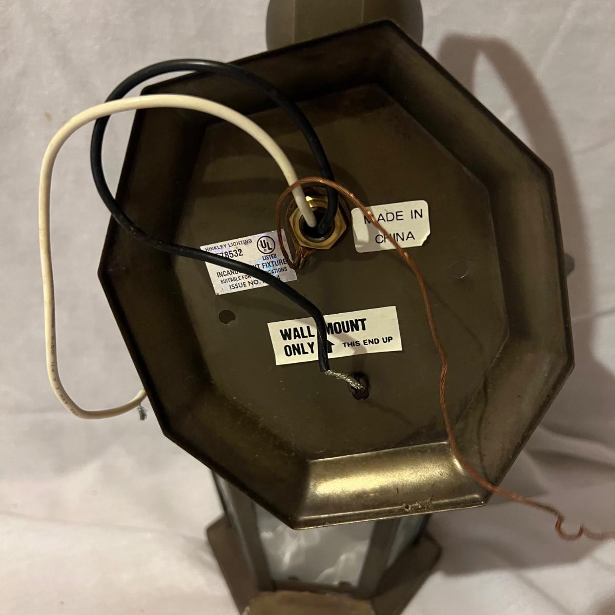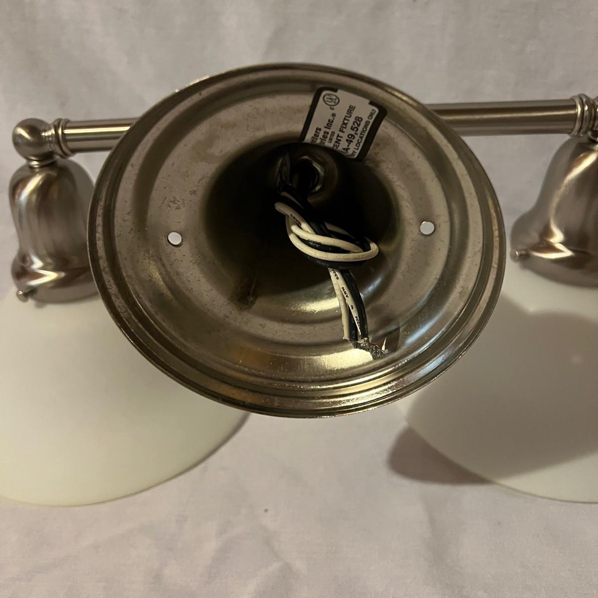 Three light fixtures. One antique, brass, slim line sconce, measures approximately 19” when arm is fully extended. The base plate that connects to the wall is approximately 7”D. The switch is three-way. It comes with a bag of hardware, believed to be what is necessary to hang on the wall. An exterior wall mount lantern with an oil rubbed bronze like finish with glass sides measures approximately 9”D x 14” H. The base plate that attaches to the wall is approximately. 5”D. The fixture comes with a mounting bracket that is believed to be needed to mount to the wall. Lastly, a two light wall-mount bathroom fixture. includes mounting instructions, and a bag of hardware believed to be necessary to mount to the wall. The finish is brushed nickel, and the piece measures approximately. 19” x 9.5” x 7”H. The glass shades are frosted white.