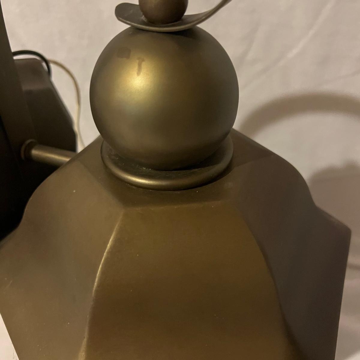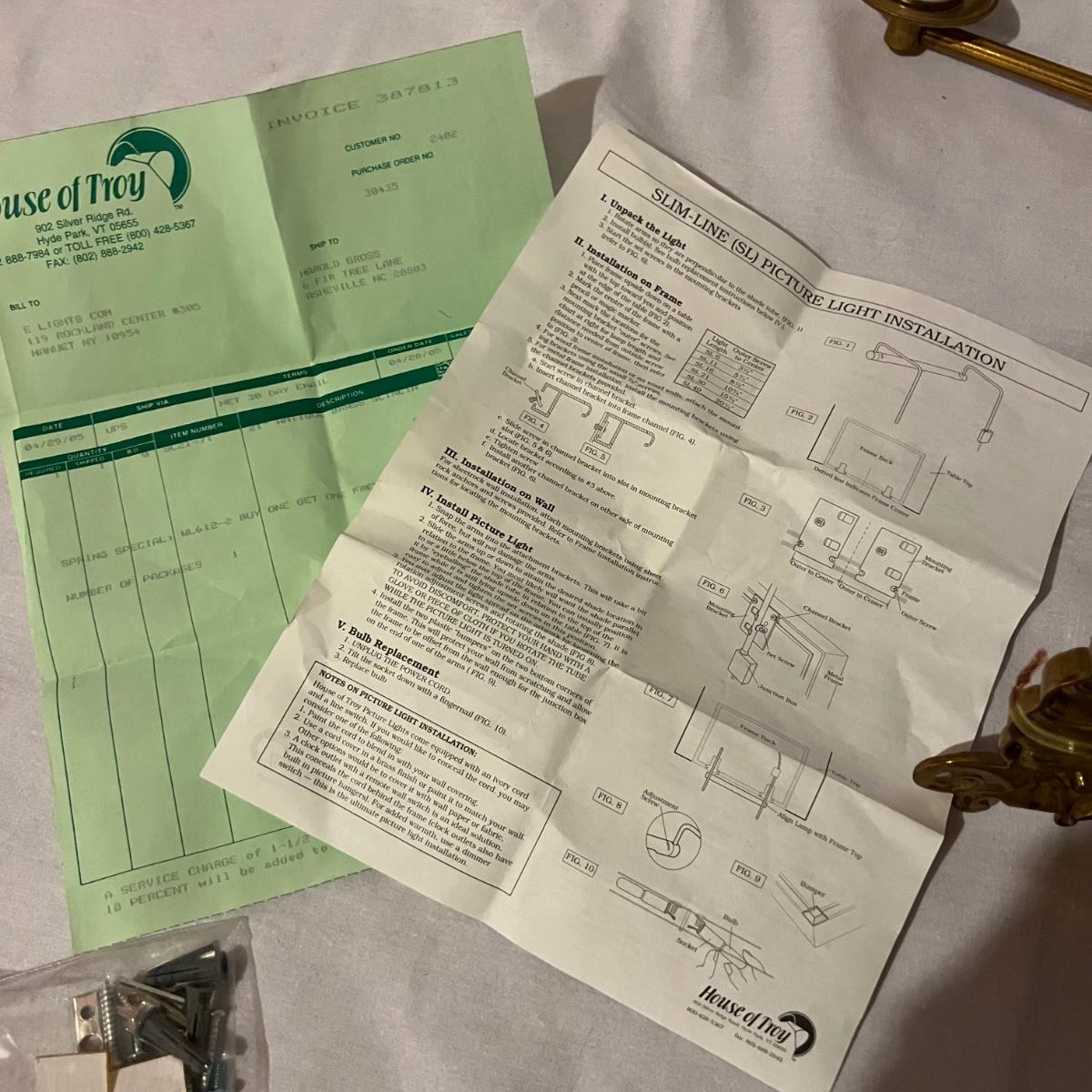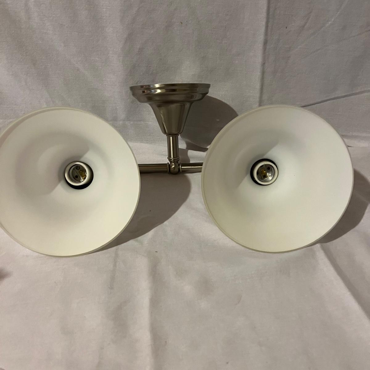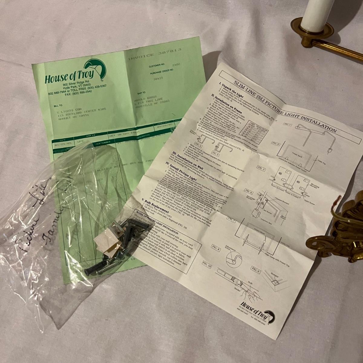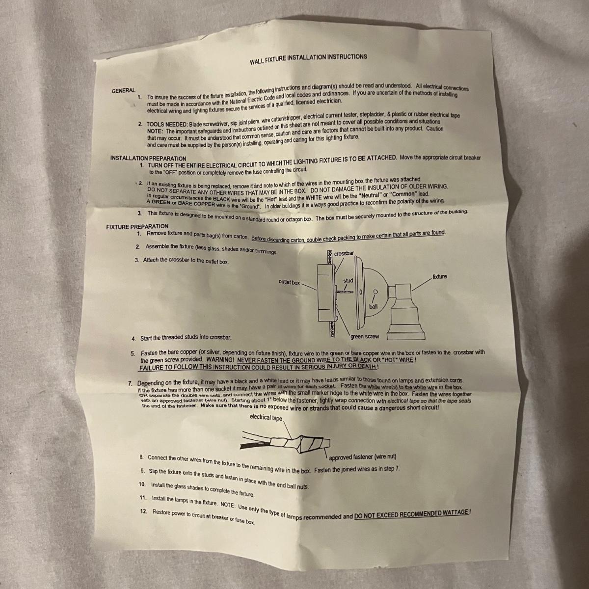 Three light fixtures. One antique, brass, slim line sconce, measures approximately 19” when arm is fully extended. The base plate that connects to the wall is approximately 7”D. The switch is three-way. It comes with a bag of hardware, believed to be what is necessary to hang on the wall. An exterior wall mount lantern with an oil rubbed bronze like finish with glass sides measures approximately 9”D x 14” H. The base plate that attaches to the wall is approximately. 5”D. The fixture comes with a mounting bracket that is believed to be needed to mount to the wall. Lastly, a two light wall-mount bathroom fixture. includes mounting instructions, and a bag of hardware believed to be necessary to mount to the wall. The finish is brushed nickel, and the piece measures approximately. 19” x 9.5” x 7”H. The glass shades are frosted white.