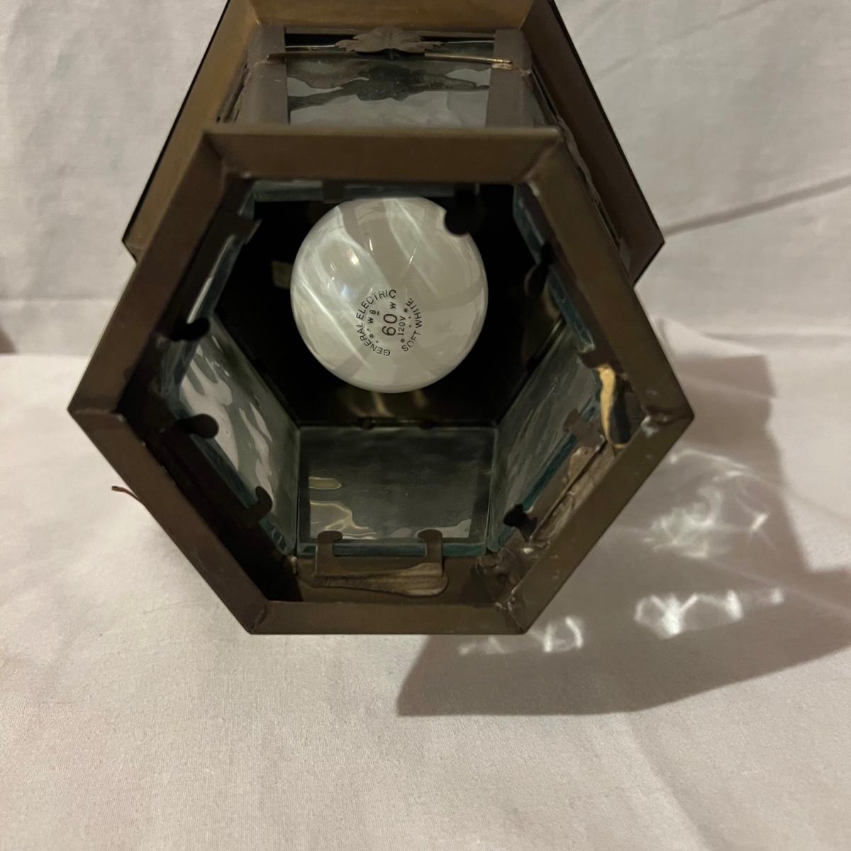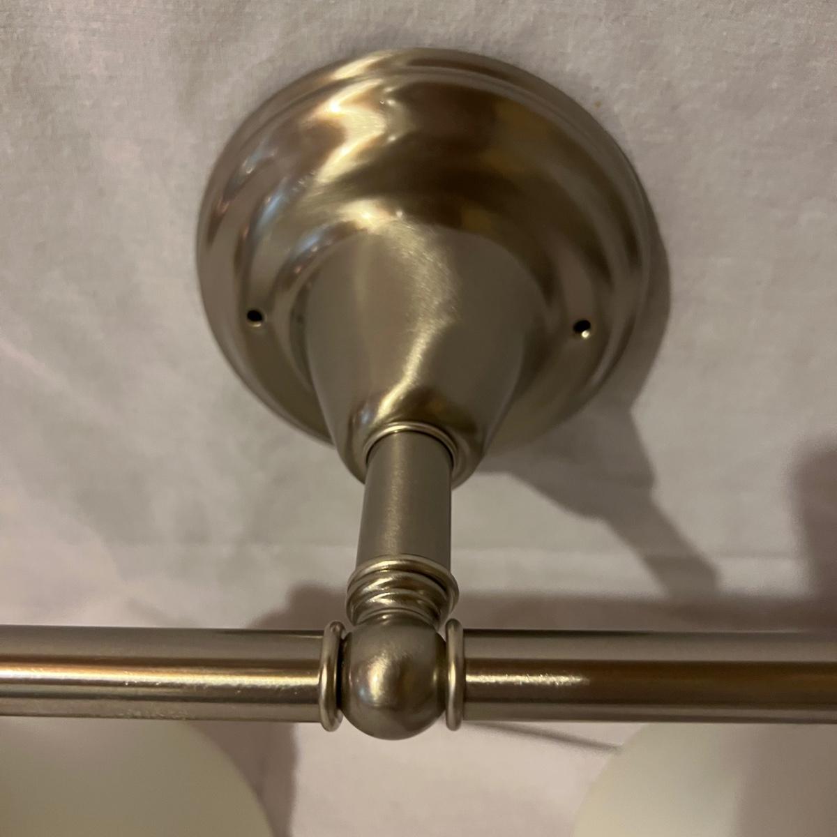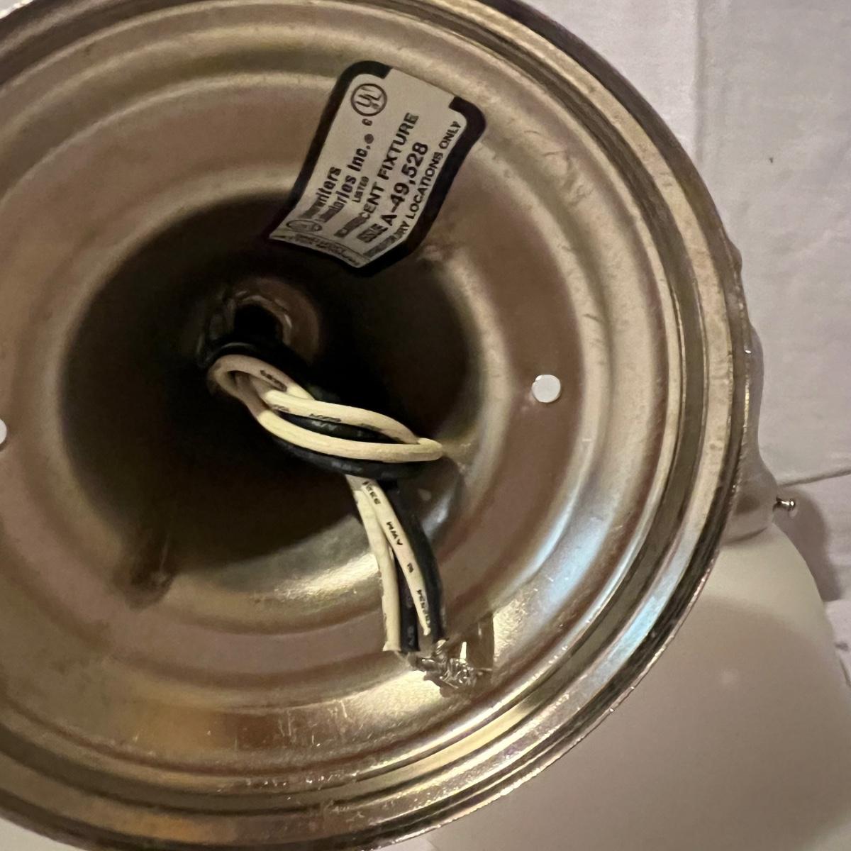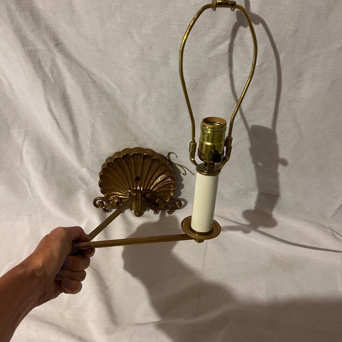 Three light fixtures. One antique, brass, slim line sconce, measures approximately 19” when arm is fully extended. The base plate that connects to the wall is approximately 7”D. The switch is three-way. It comes with a bag of hardware, believed to be what is necessary to hang on the wall. An exterior wall mount lantern with an oil rubbed bronze like finish with glass sides measures approximately 9”D x 14” H. The base plate that attaches to the wall is approximately. 5”D. The fixture comes with a mounting bracket that is believed to be needed to mount to the wall. Lastly, a two light wall-mount bathroom fixture. includes mounting instructions, and a bag of hardware believed to be necessary to mount to the wall. The finish is brushed nickel, and the piece measures approximately. 19” x 9.5” x 7”H. The glass shades are frosted white.
