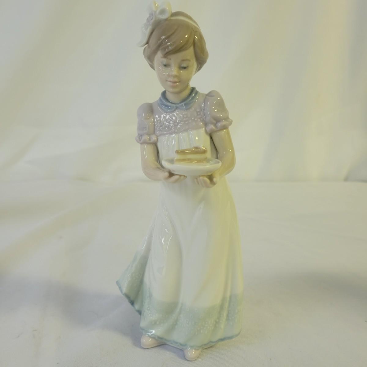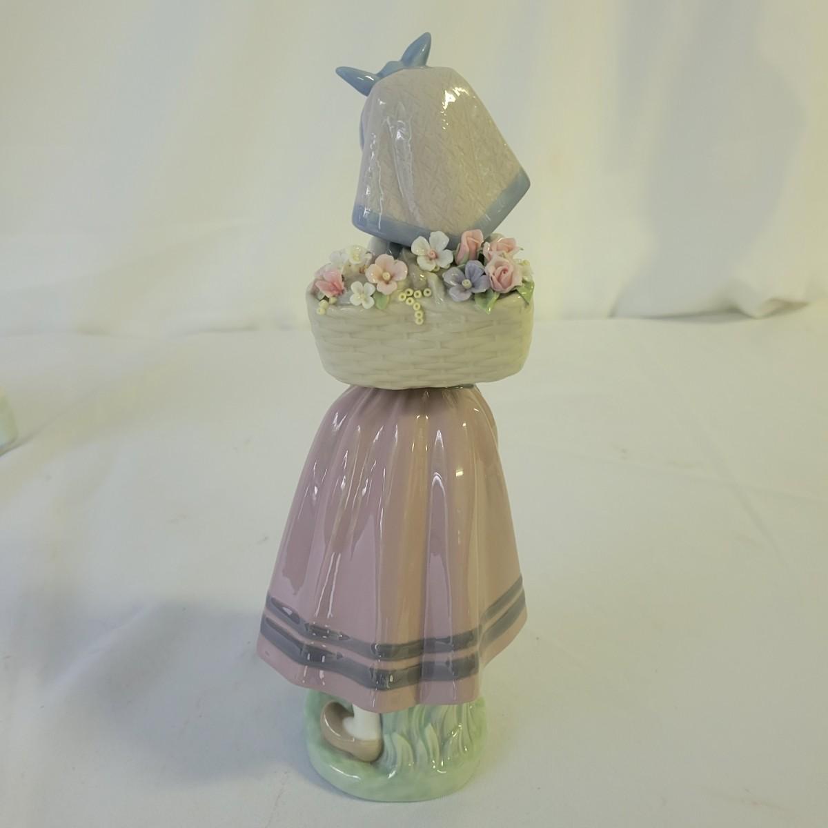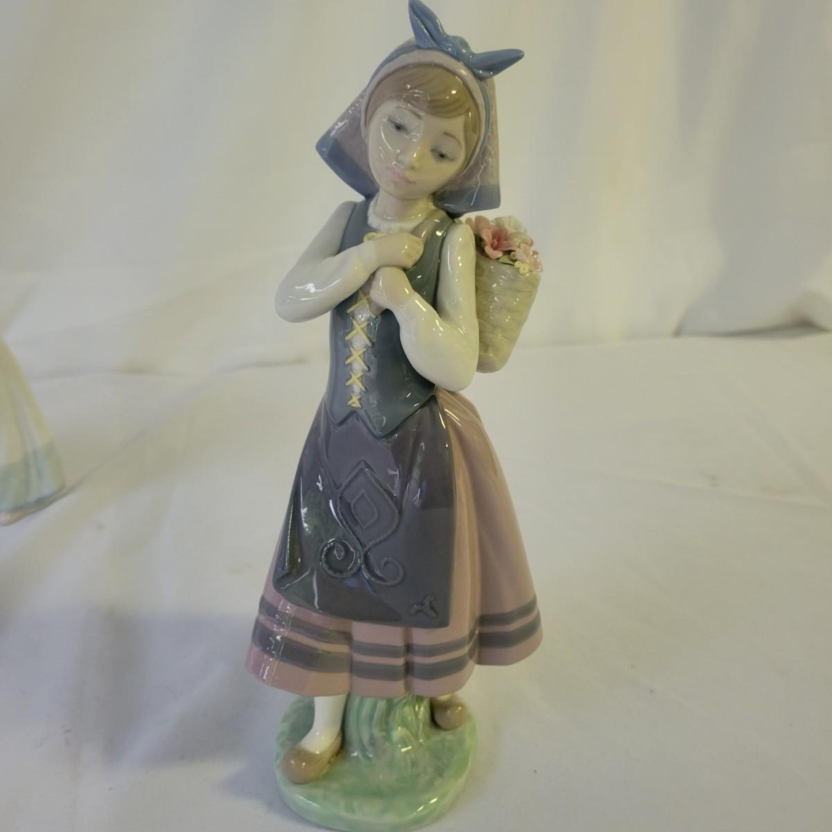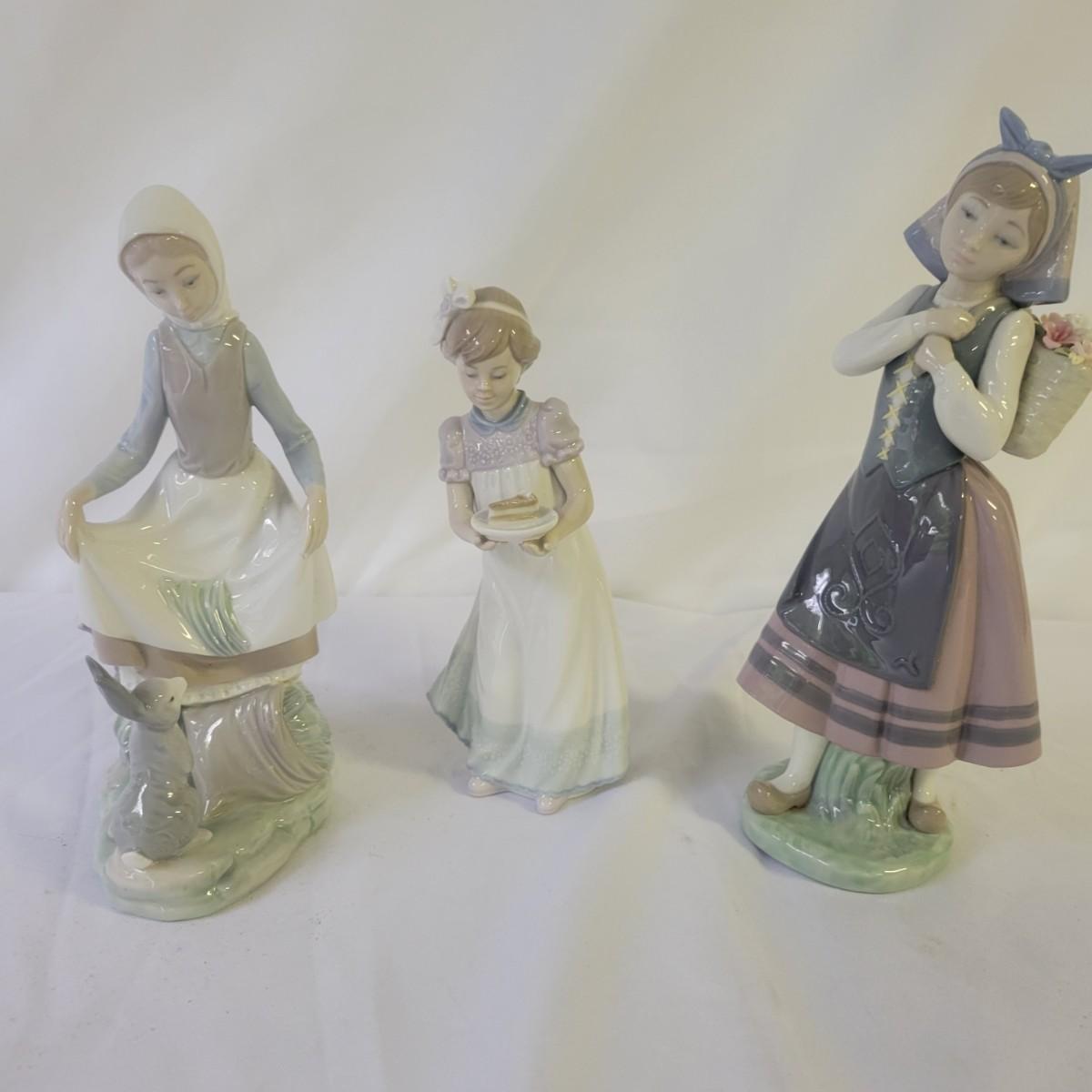 A collection of three Lladros statuettes. All three pieces are constructed of porcelain. One piece is a girl in an apron with a bunny rabbit, another is a girl with a basket of flowers that measures approximately 4.5" x 3.5" x 10.5"H. Also included is a girl holding a plate with pie. The plate is not permanently attached to the statuette and the plate has a minor chip in it. Shipping available. Shipping can be costly. We suggest contacting our preferred local shipping provider, Postage Express, with dimensions and getting an estimate before bidding: (828) 670-5501 or postageexpress@yahoo.com.