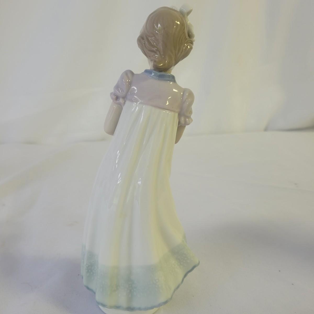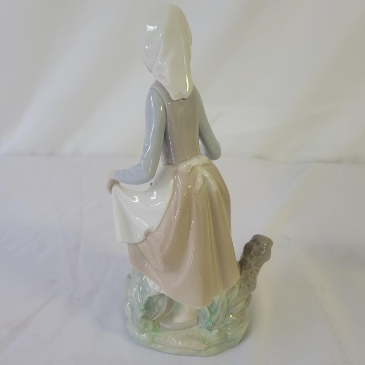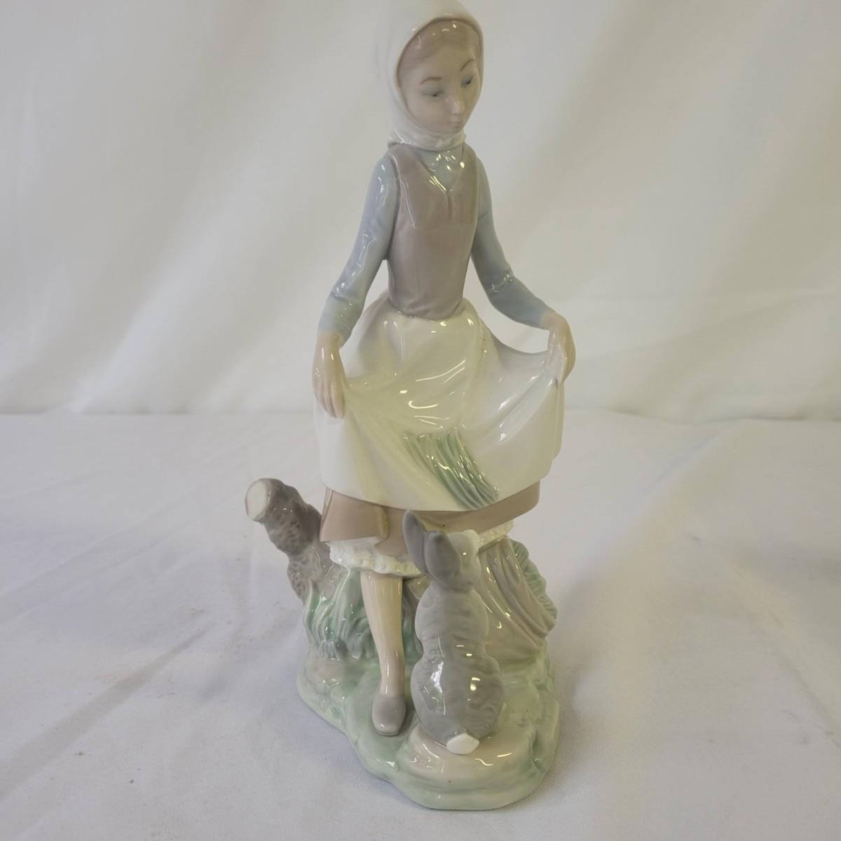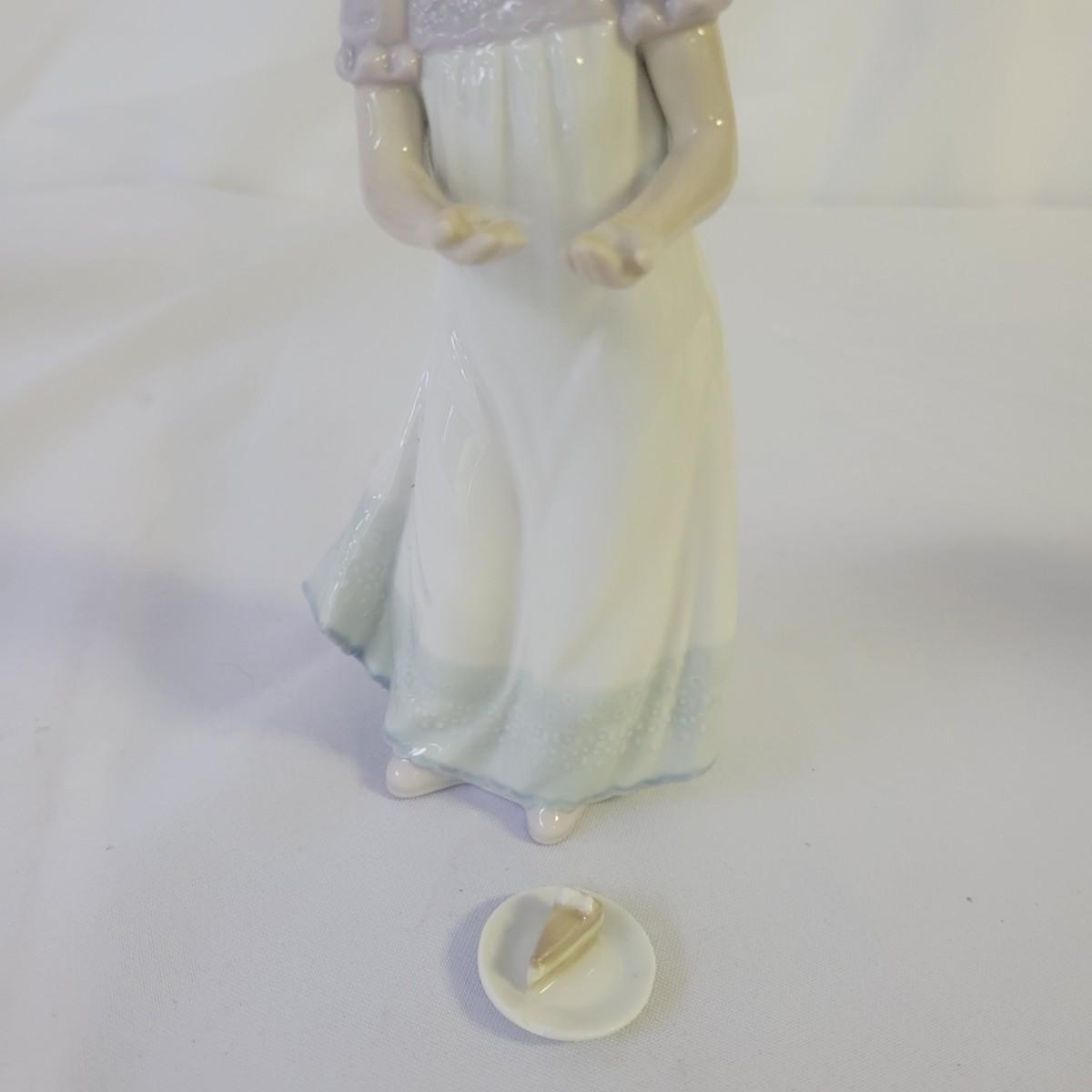 A collection of three Lladros statuettes. All three pieces are constructed of porcelain. One piece is a girl in an apron with a bunny rabbit, another is a girl with a basket of flowers that measures approximately 4.5" x 3.5" x 10.5"H. Also included is a girl holding a plate with pie. The plate is not permanently attached to the statuette and the plate has a minor chip in it. Shipping available. Shipping can be costly. We suggest contacting our preferred local shipping provider, Postage Express, with dimensions and getting an estimate before bidding: (828) 670-5501 or postageexpress@yahoo.com.
