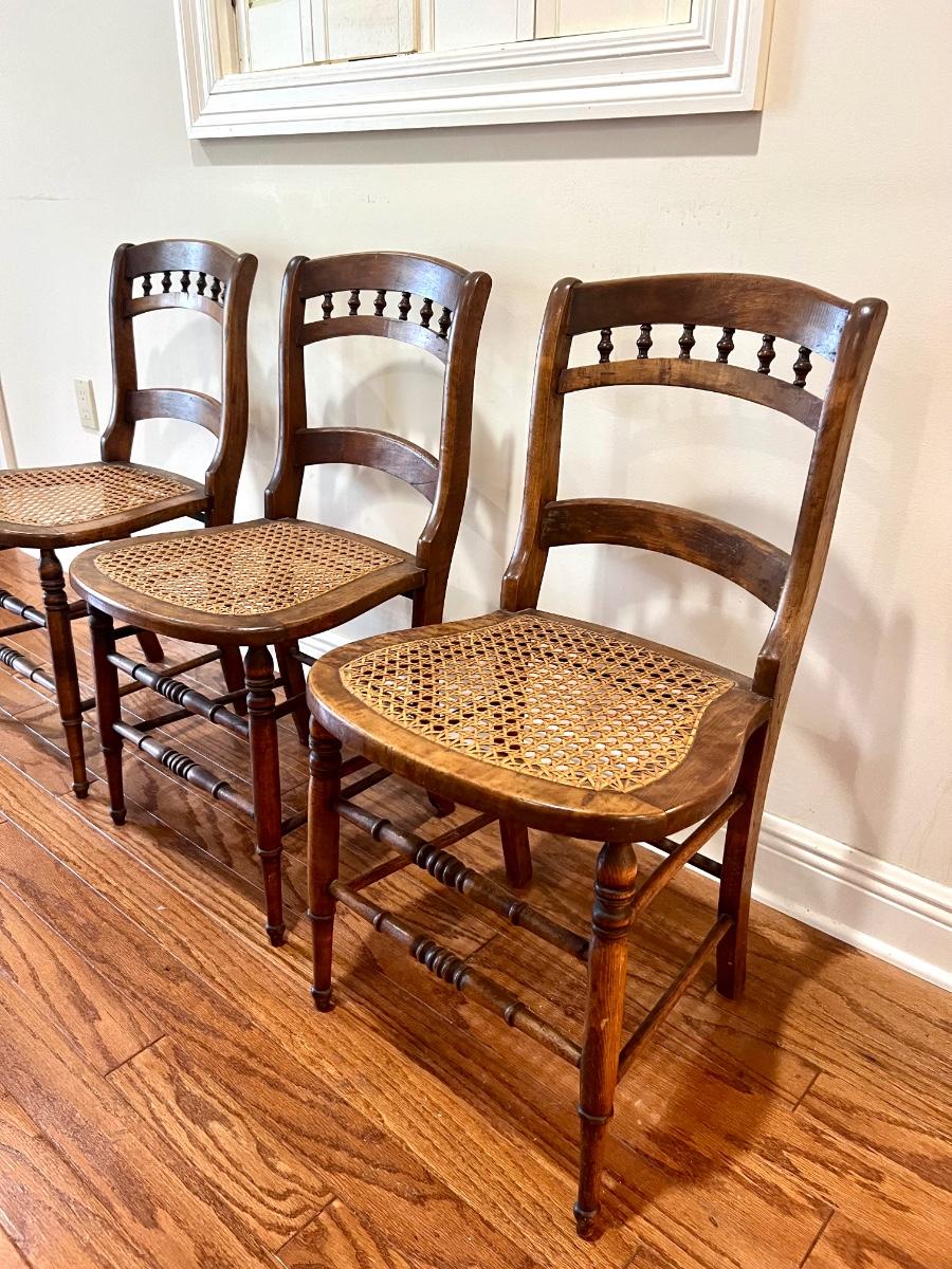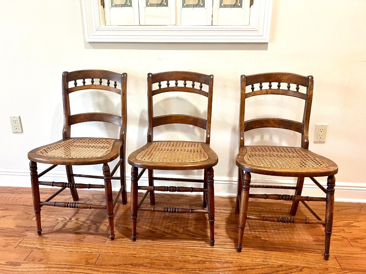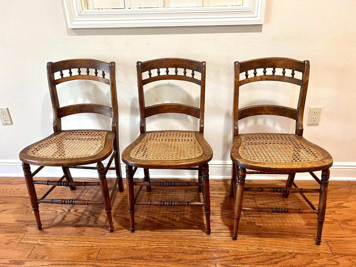 Three Maple (?) Wood Cane Bottom Chairs. Measures 32 inches tall, 16 inches deep and 17 inches wide.