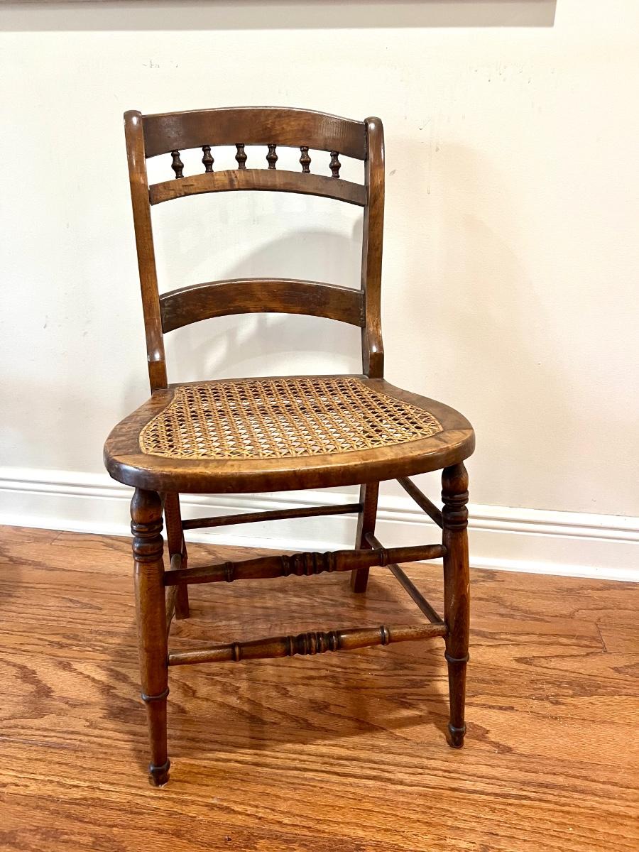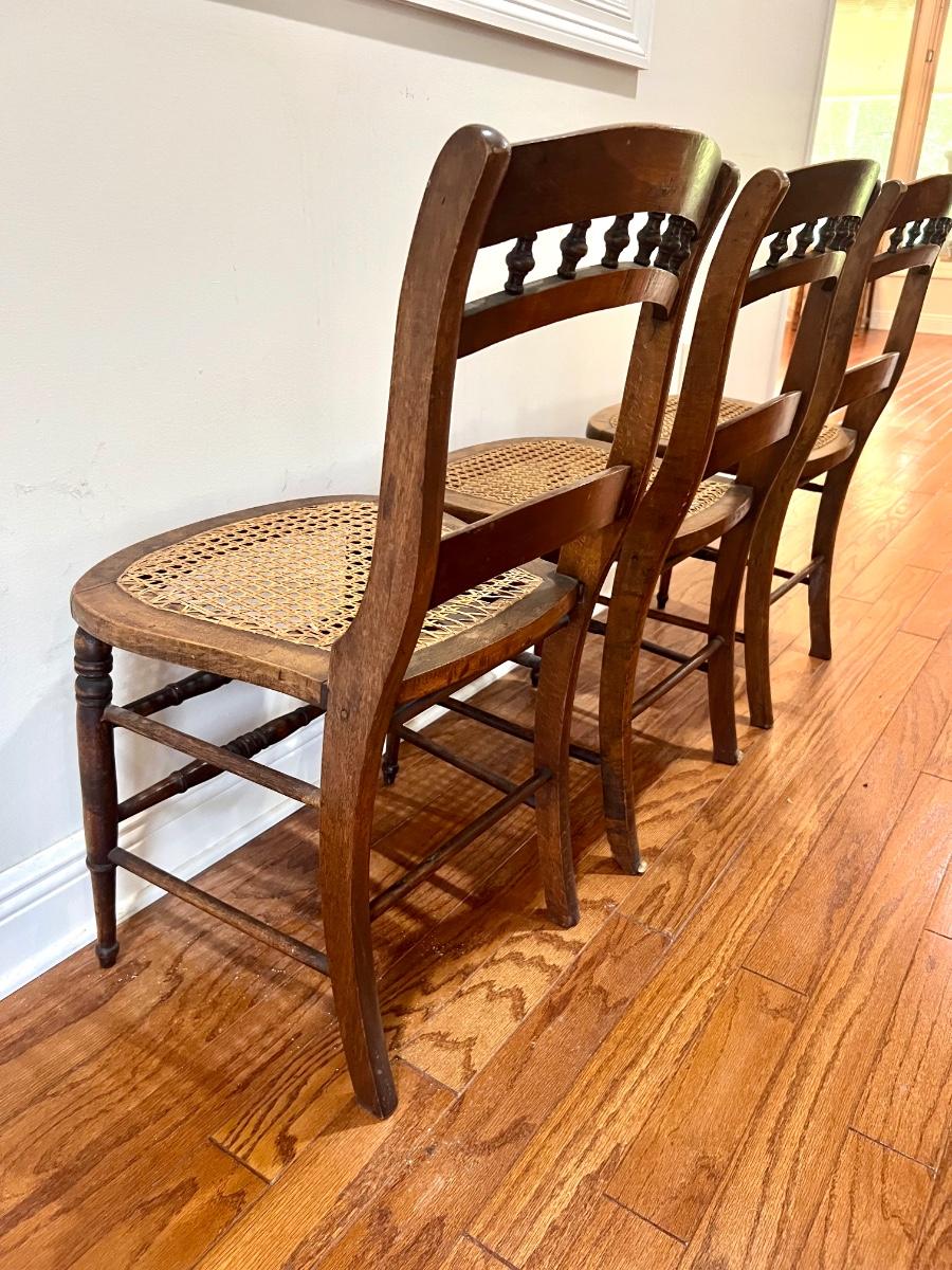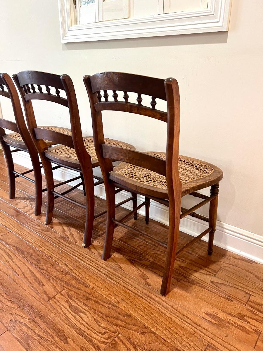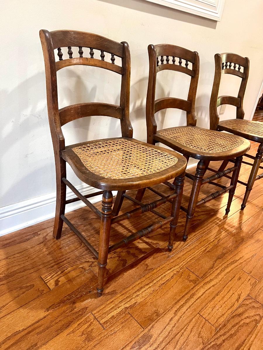 Three Maple (?) Wood Cane Bottom Chairs. Measures 32 inches tall, 16 inches deep and 17 inches wide.