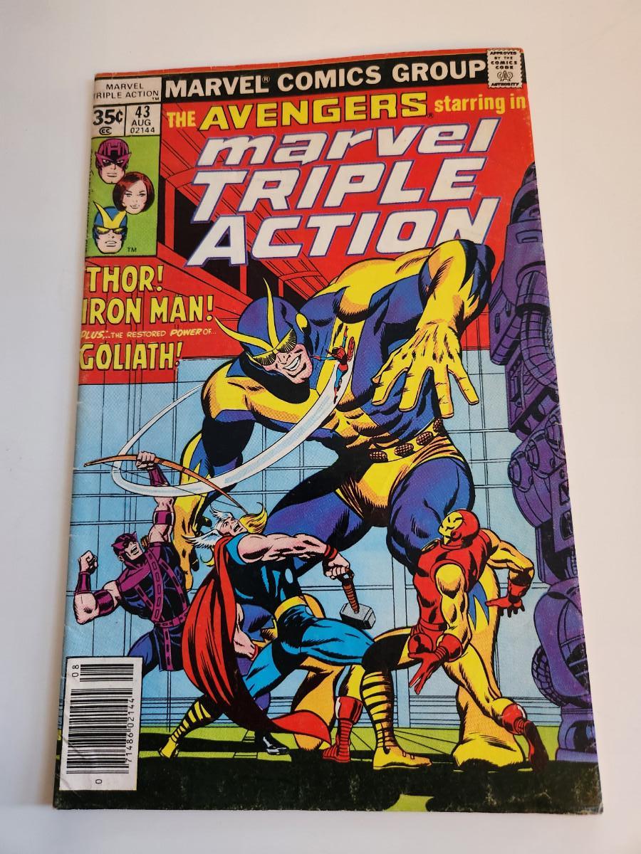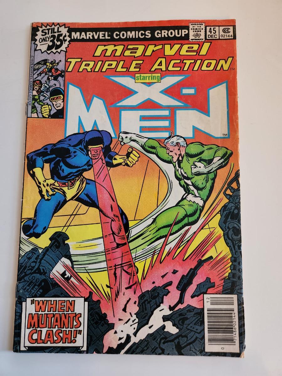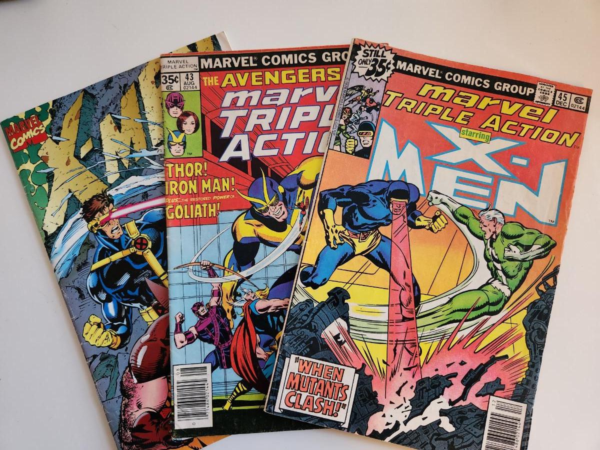 This auction lot is for Three Marvel Comics. One is a Marvel Triple Action starring X-Men, Volume 1, Number 45 dated December 1978, the second is The Avengers starring in Marvel Triple Action, Volume 1, Number 43 dated August 1978 and the third is X-Men: Special Collector's Edition, Volume 1, Number 1 dated October 1991. This comic has fold out front and back covers. The comics have been read and enjoyed but are in good condition overall, however, they are not mint. Great for most collectors.