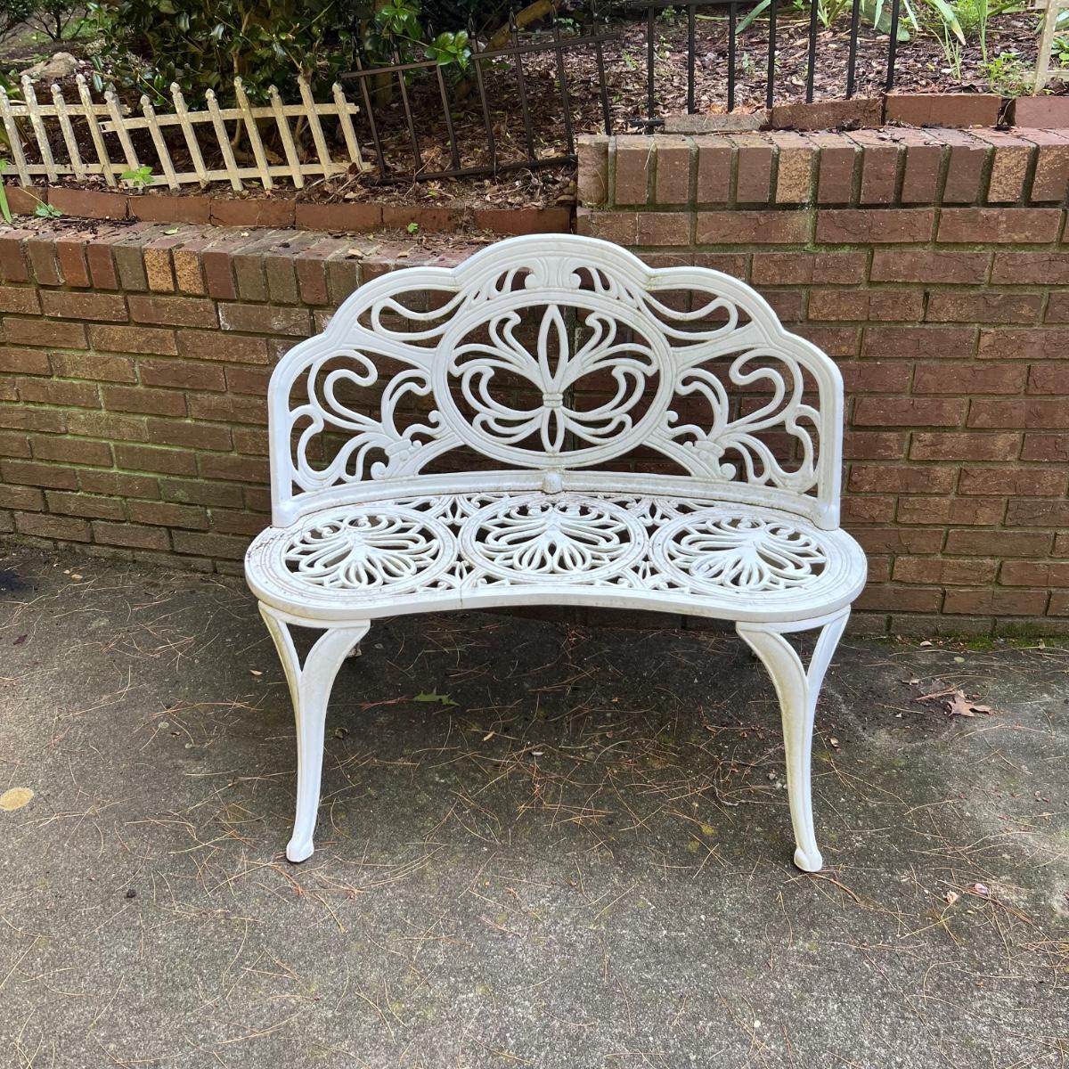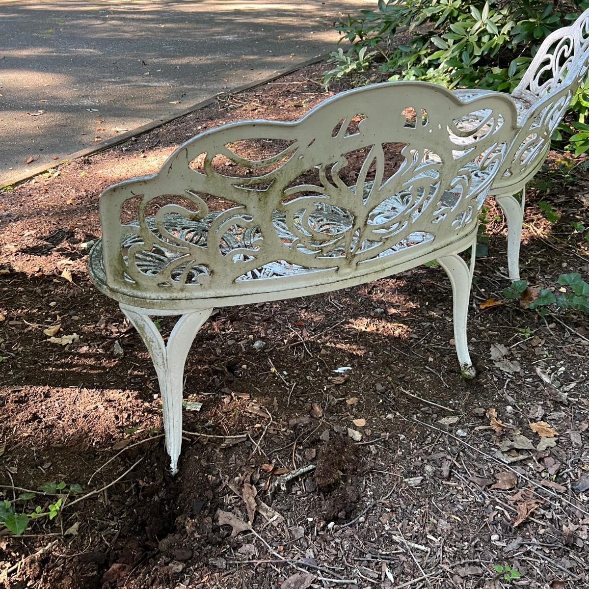 These three matching garden seats appear to be wrought iron and measure 40” x 15” x 32”H with 15” seat height. Two are dirtier having sat in a shady spot but should come clean with a good wipe down.