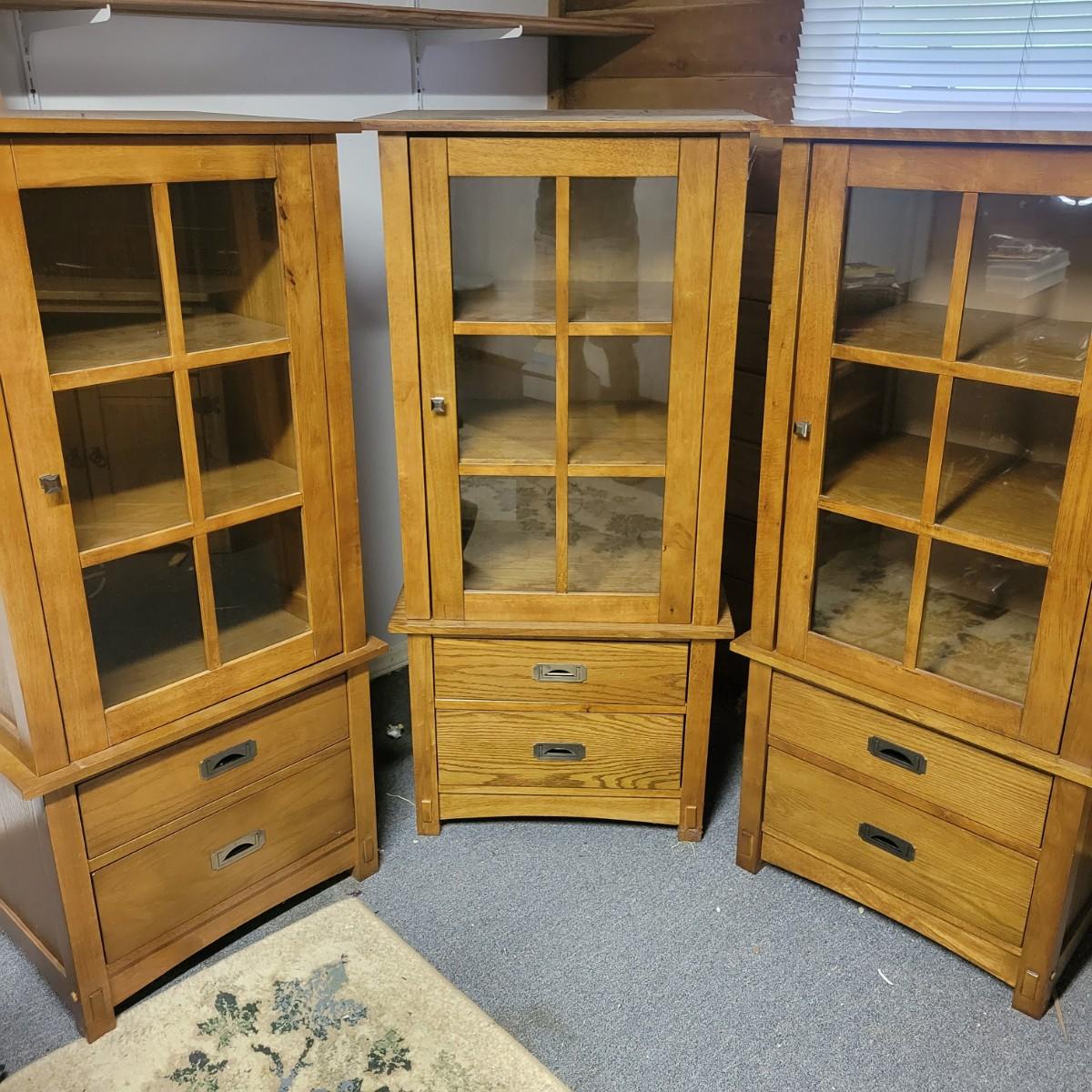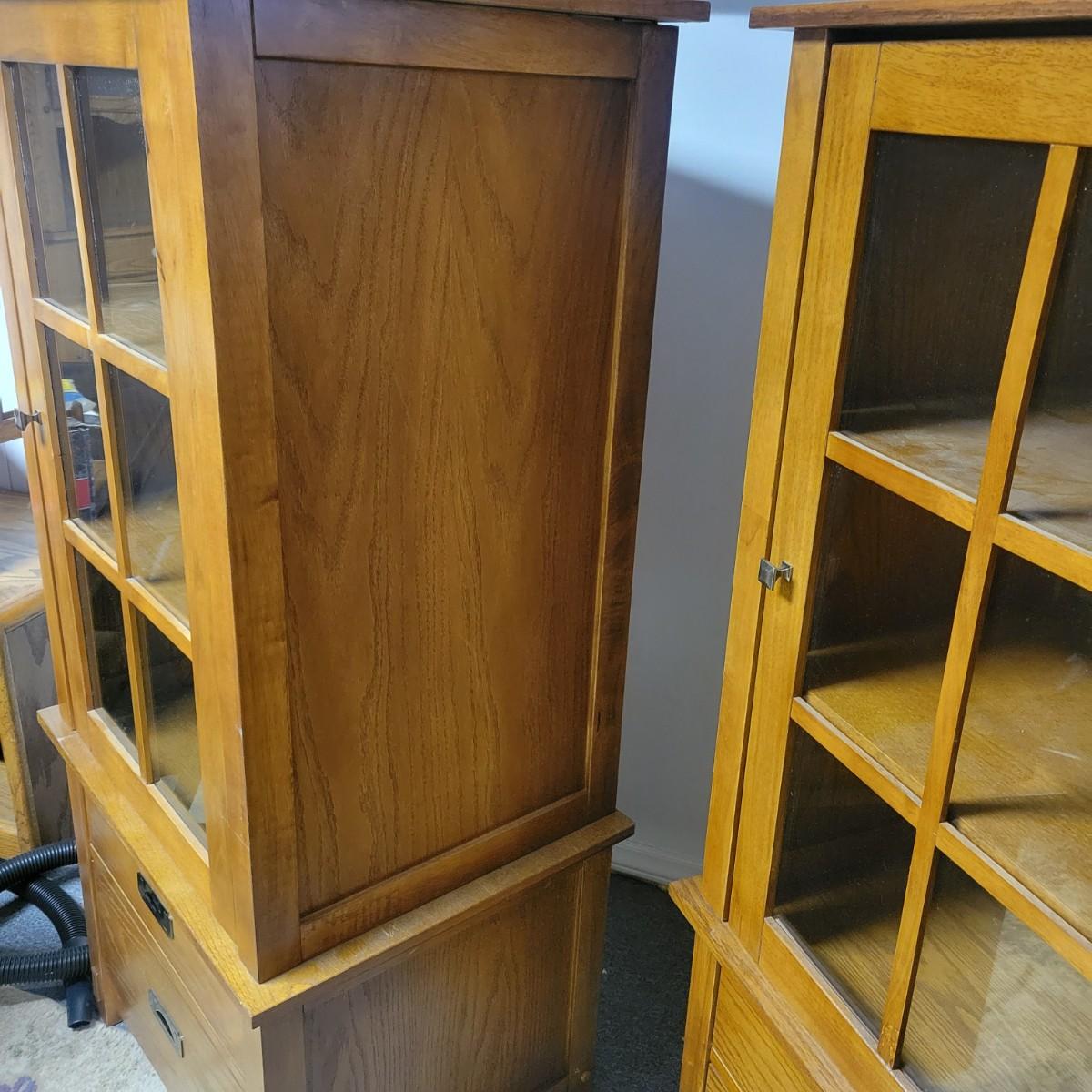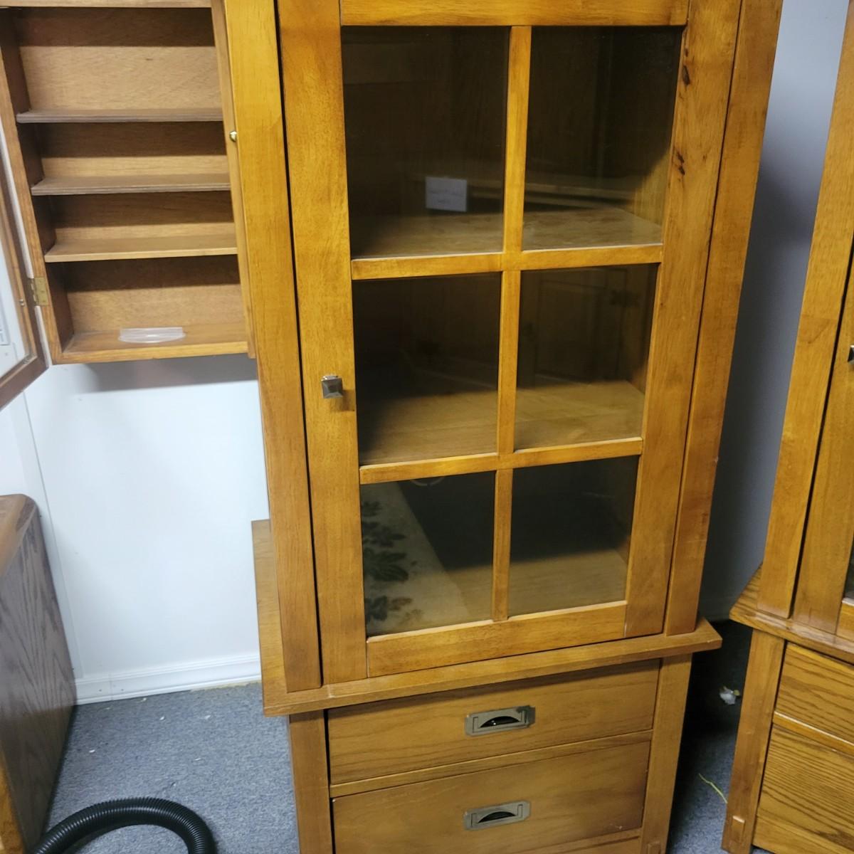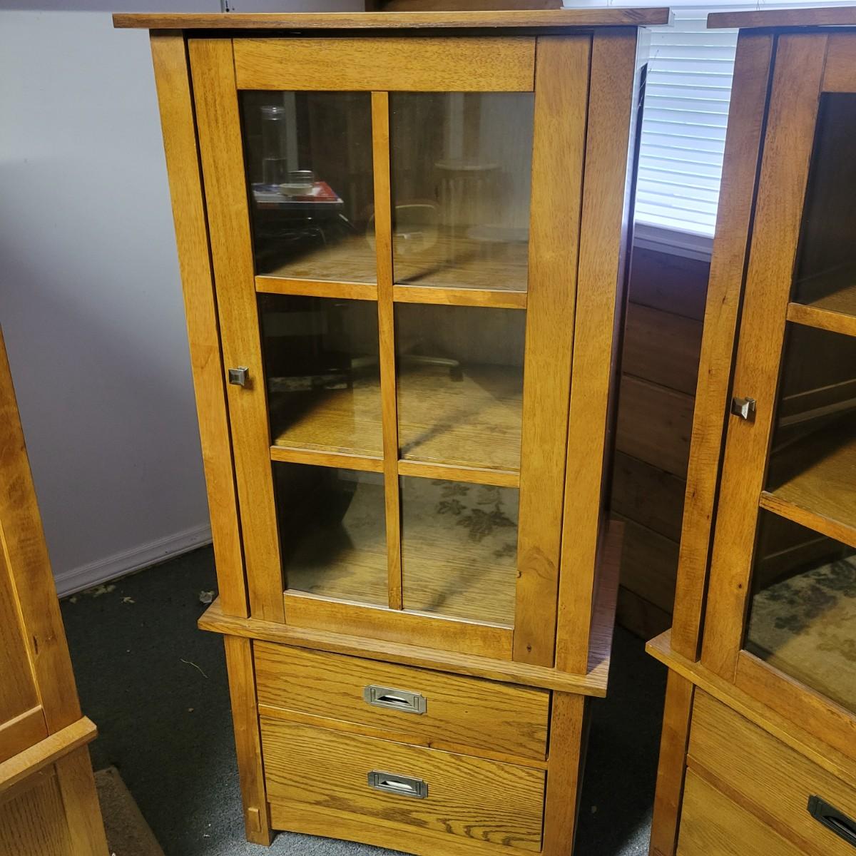 Three matching media towers that could also be used for display cabinets are constructed of veneered chipboard that are in good condition. The top of the cabinet features 3 tiers with a glass door and metal hardware. Cabinet also has two drawers on its lower half. Cabinets measure approximately 25" x 19" x 53" Local pickup only