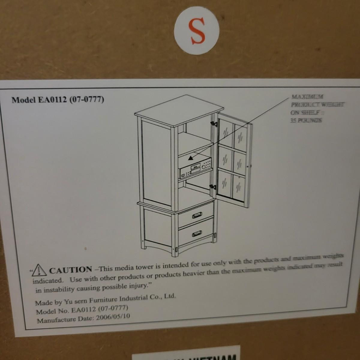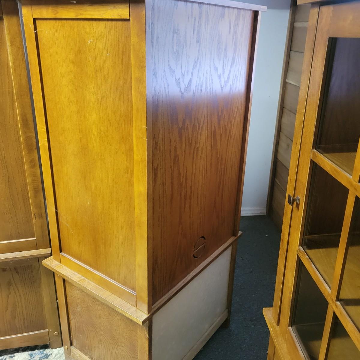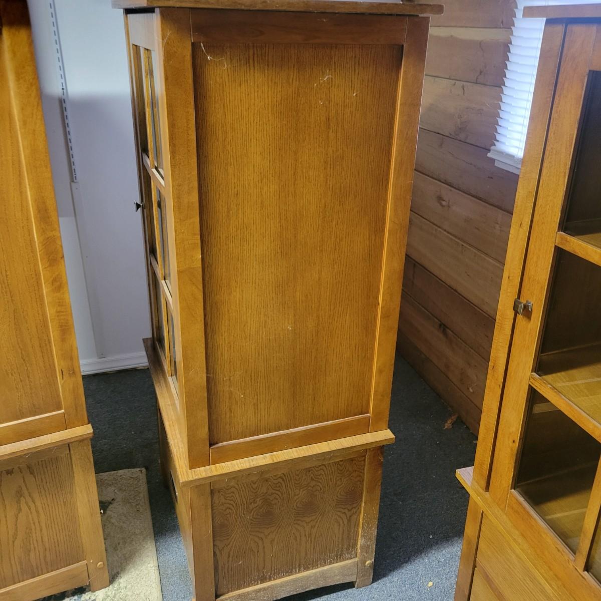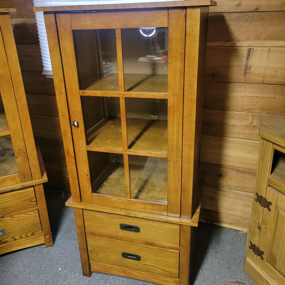 Three matching media towers that could also be used for display cabinets are constructed of veneered chipboard that are in good condition. The top of the cabinet features 3 tiers with a glass door and metal hardware. Cabinet also has two drawers on its lower half. Cabinets measure approximately 25" x 19" x 53" Local pickup only