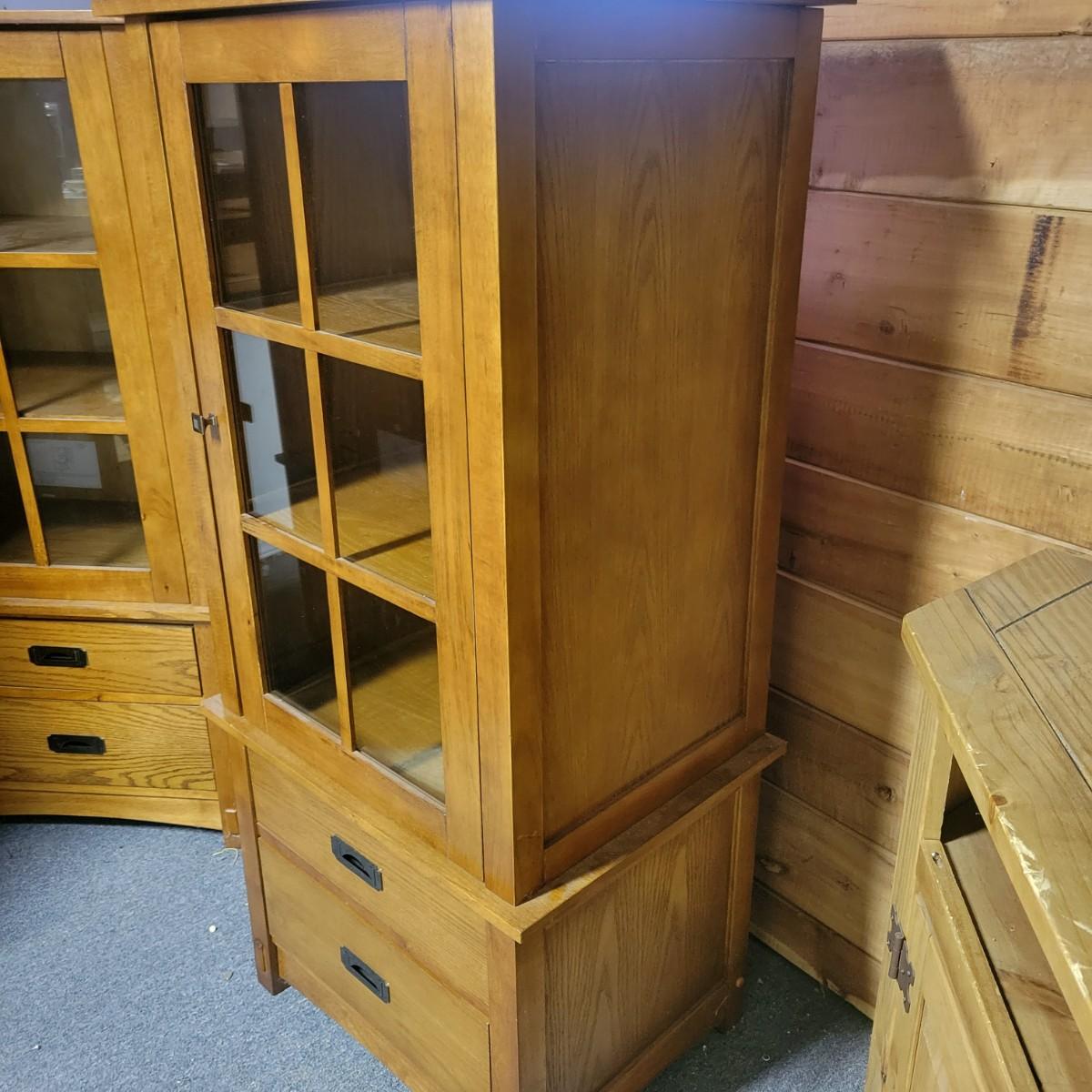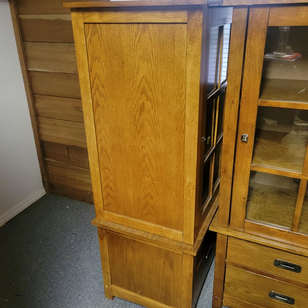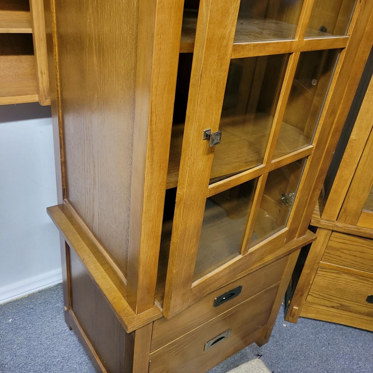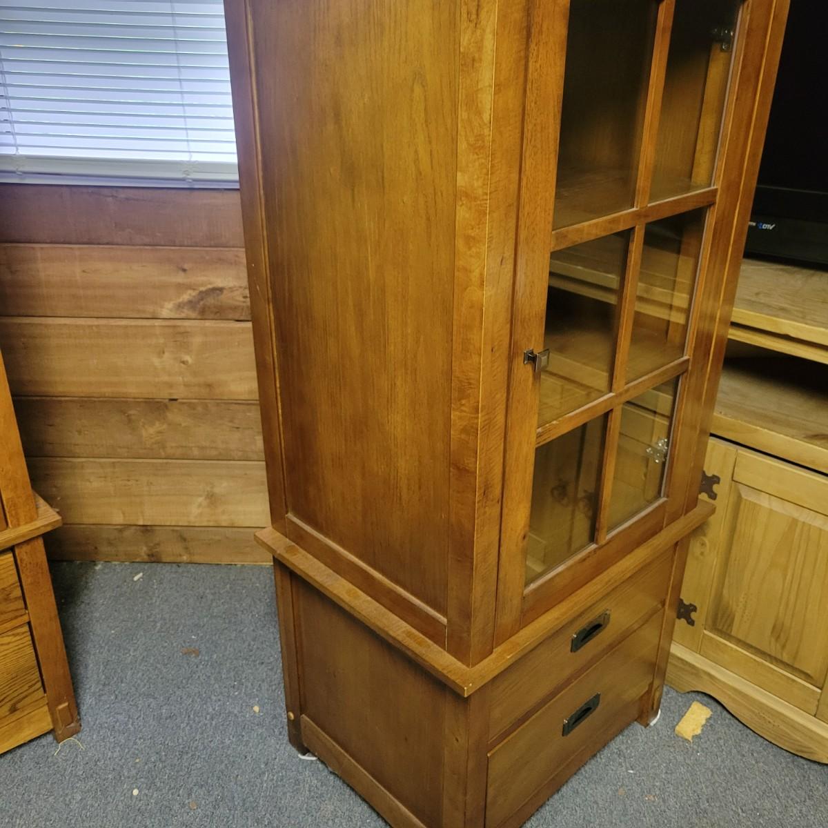 Three matching media towers that could also be used for display cabinets are constructed of veneered chipboard that are in good condition. The top of the cabinet features 3 tiers with a glass door and metal hardware. Cabinet also has two drawers on its lower half. Cabinets measure approximately 25" x 19" x 53" Local pickup only