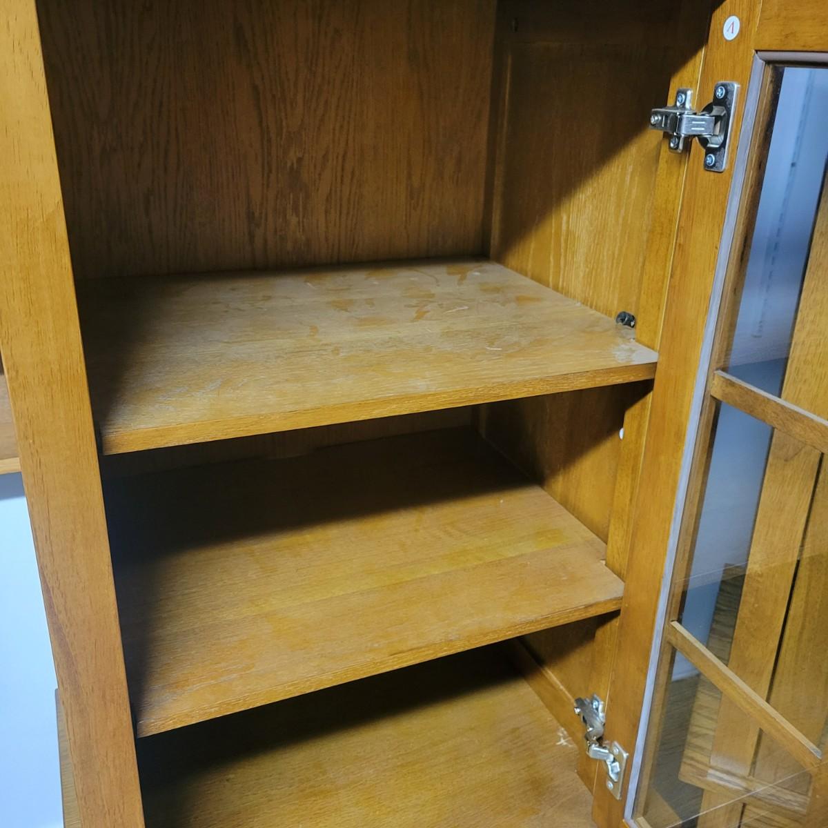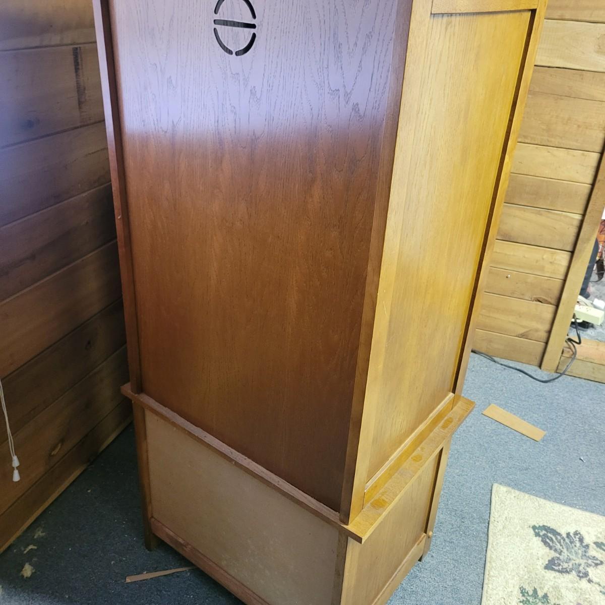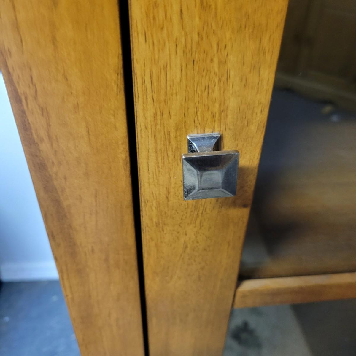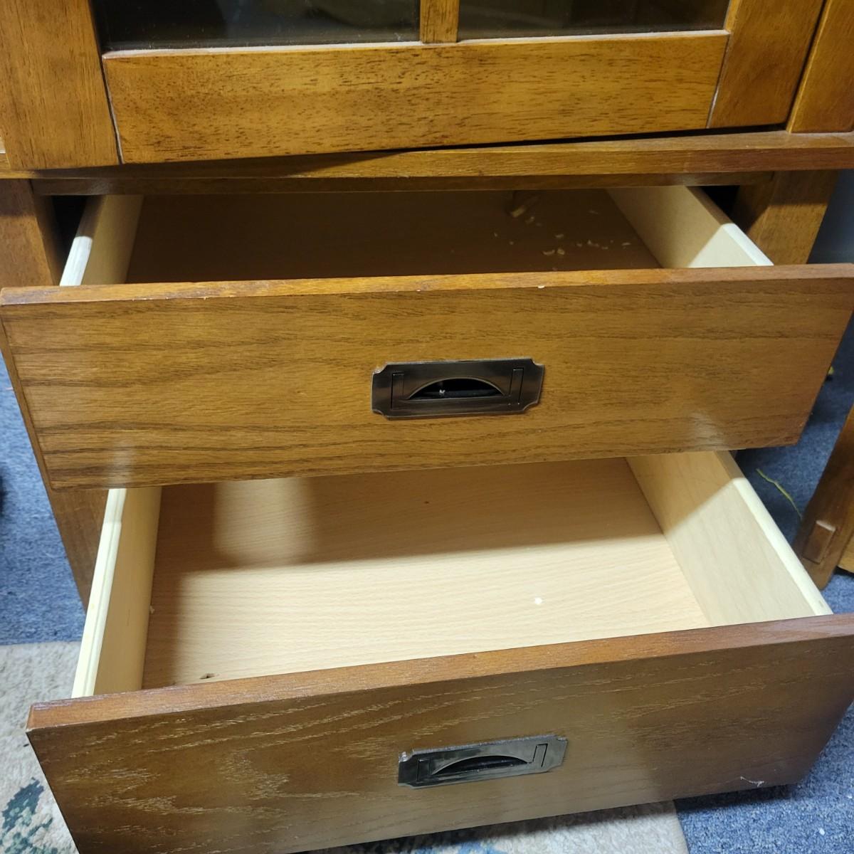 Three matching media towers that could also be used for display cabinets are constructed of veneered chipboard that are in good condition. The top of the cabinet features 3 tiers with a glass door and metal hardware. Cabinet also has two drawers on its lower half. Cabinets measure approximately 25" x 19" x 53" Local pickup only