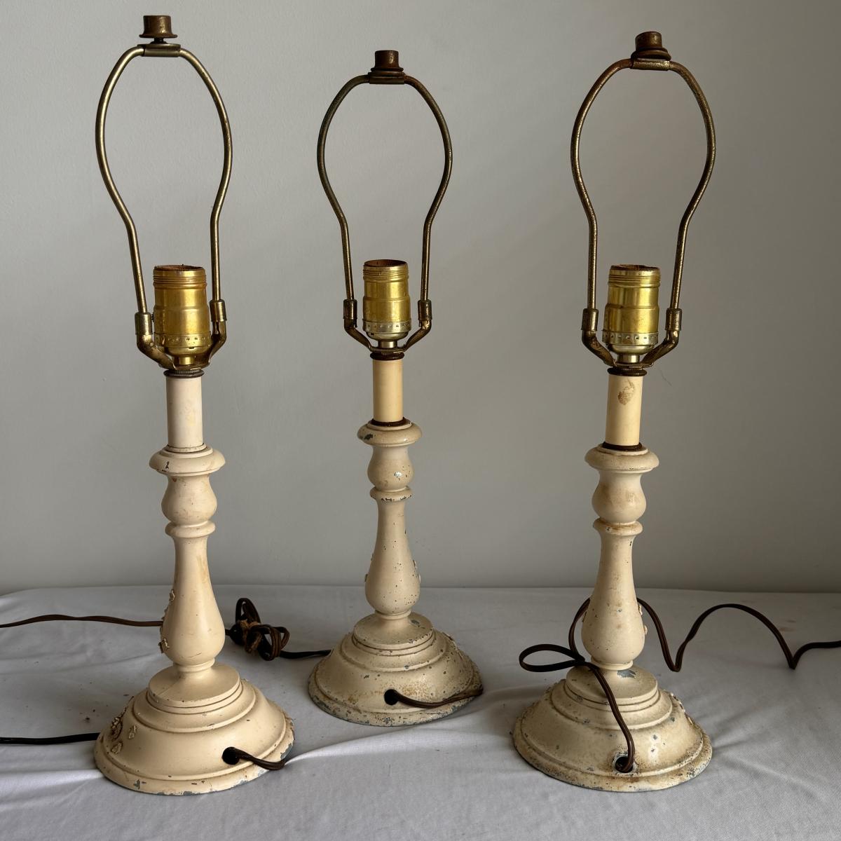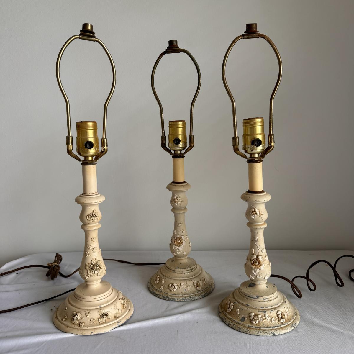 This lot includes three matching metal floral lamps. All three of the lamps individually measure 5” x 19”H. All lamps powered on when plugged in - see pictures included. Shipping available.