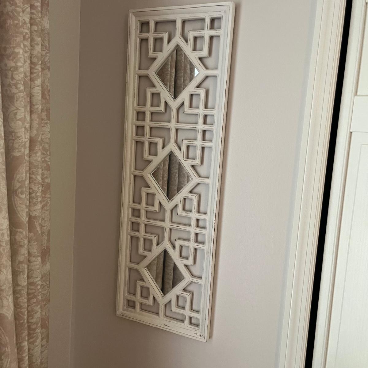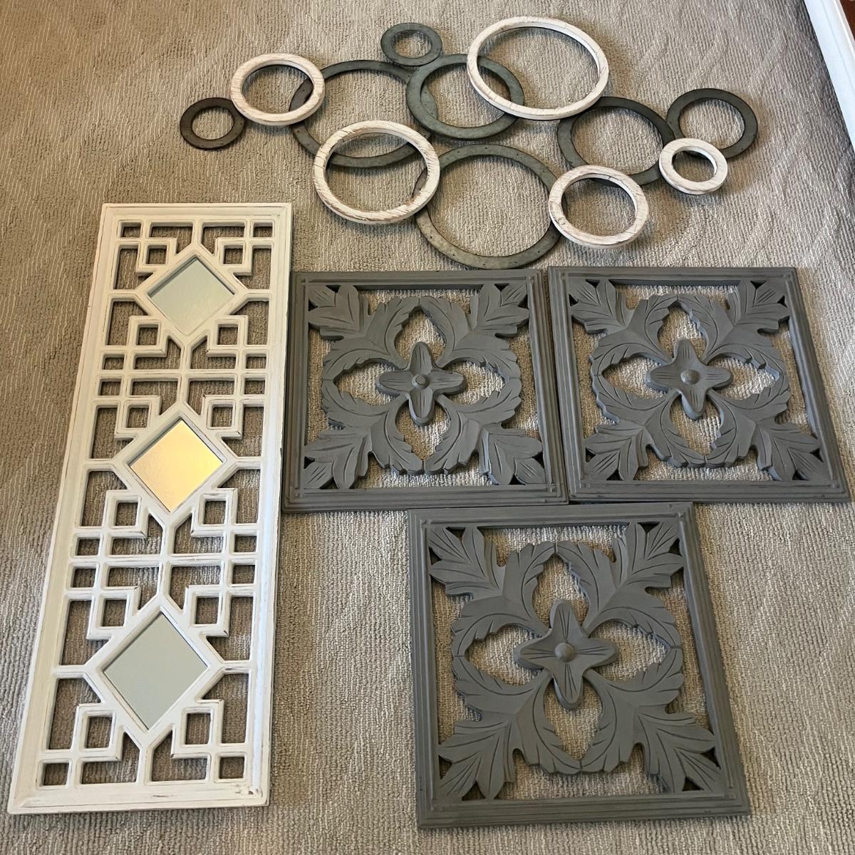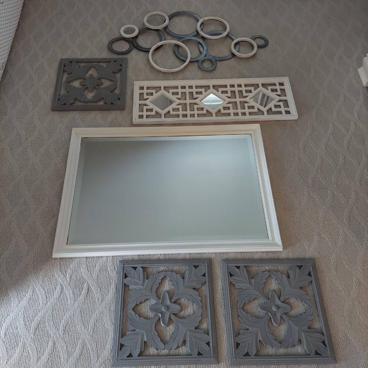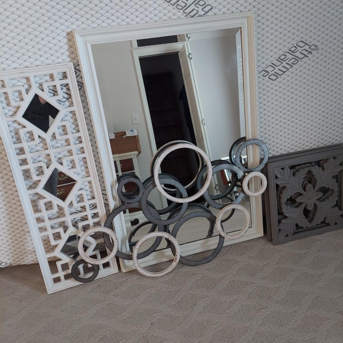 Lot includes three matching pieces of wall art that appear to be MDF with a gray weathered look. Each piece measures 16”sq. Also includes a white three diamond shaped mirrors with wooden frame that measures 12” x 35”H and a circle design wall art made from metal and wood. Plus a large mirror in a white wooden frame that measures 28" x 40"H. Shipping Available. Shipping can be costly. We suggest contacting our preferred local shipping provider, Postage Express, with dimensions and getting an estimate before bidding: (828) 670-5501 or postageexpress@yahoo.com.