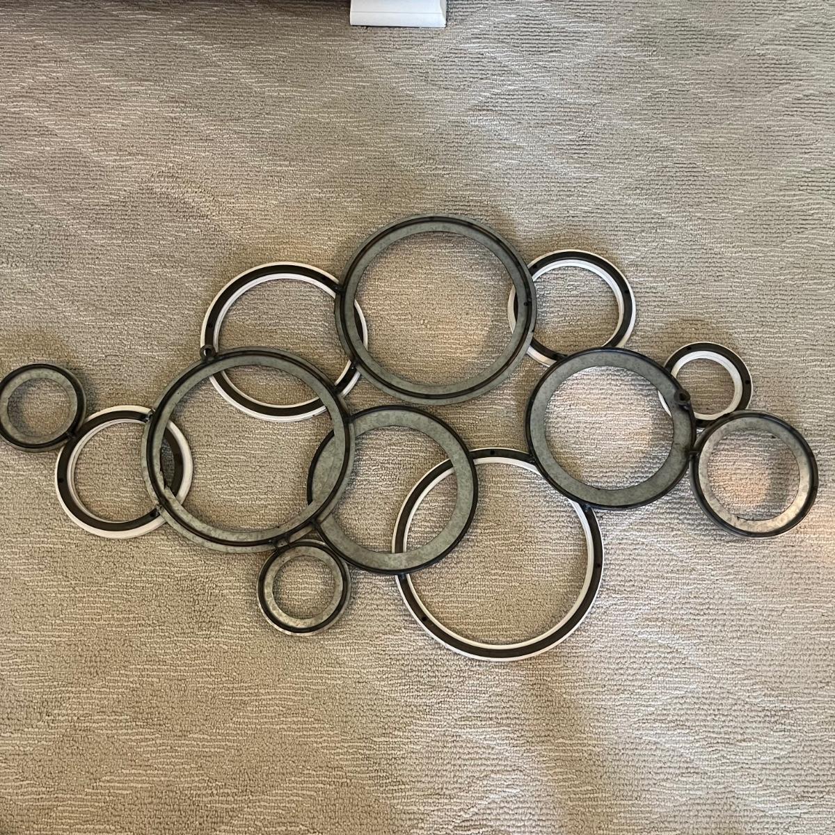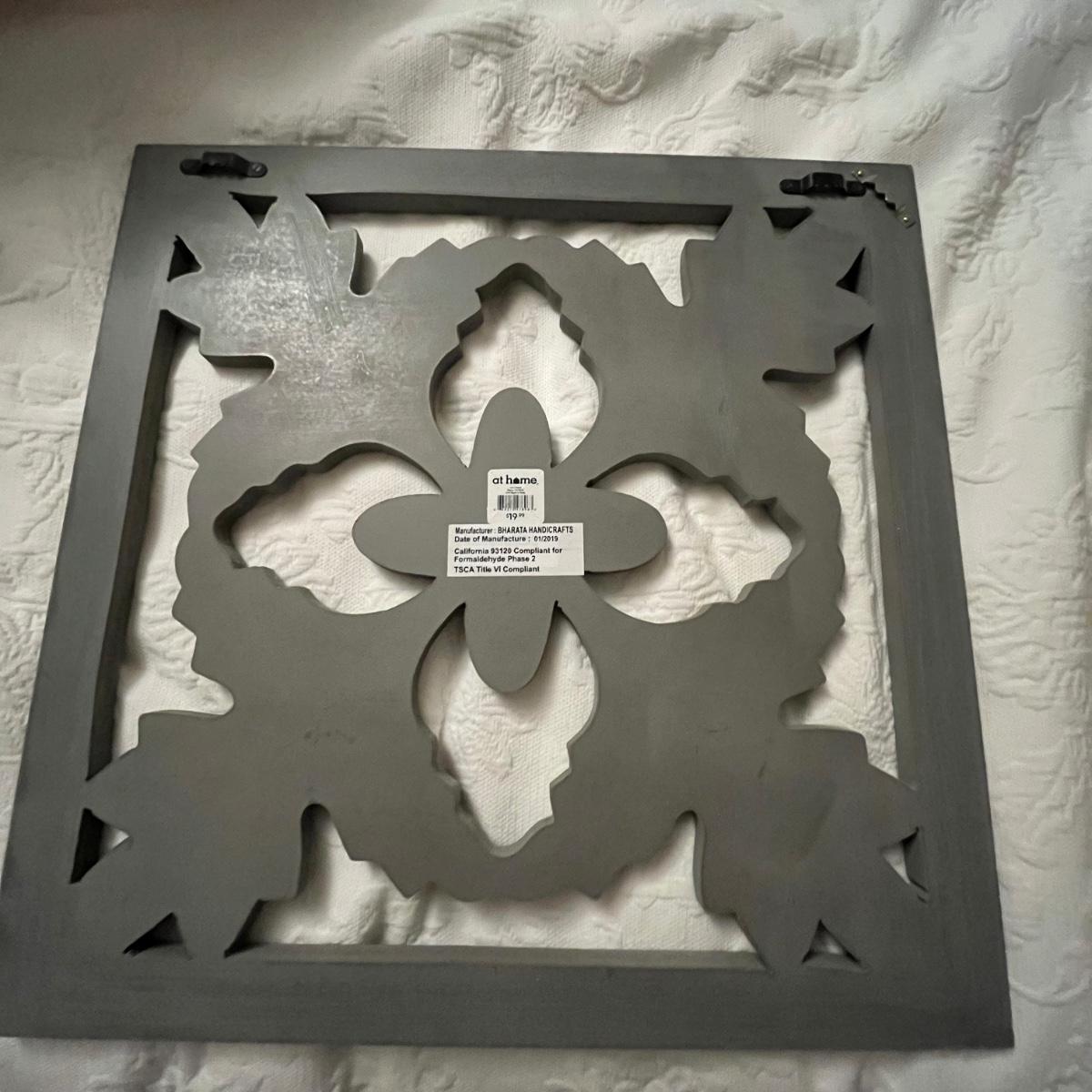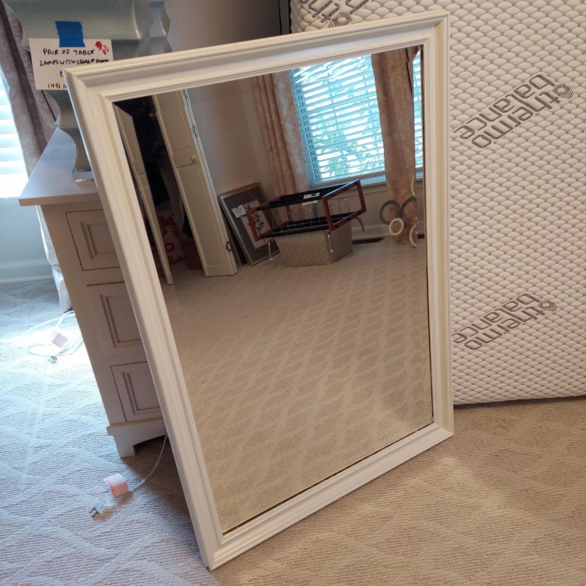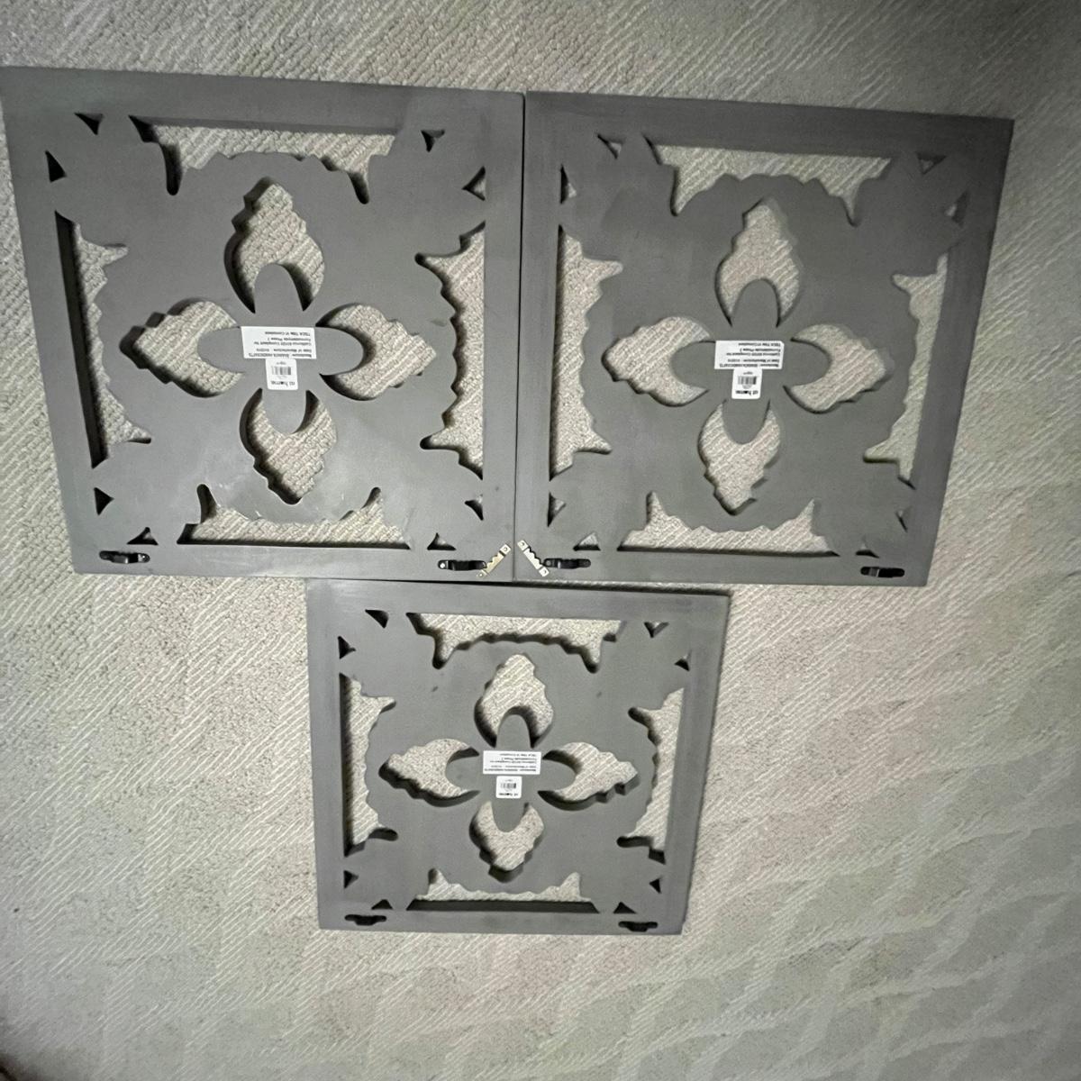 Lot includes three matching pieces of wall art that appear to be MDF with a gray weathered look. Each piece measures 16”sq. Also includes a white three diamond shaped mirrors with wooden frame that measures 12” x 35”H and a circle design wall art made from metal and wood. Plus a large mirror in a white wooden frame that measures 28" x 40"H. Shipping Available. Shipping can be costly. We suggest contacting our preferred local shipping provider, Postage Express, with dimensions and getting an estimate before bidding: (828) 670-5501 or postageexpress@yahoo.com.