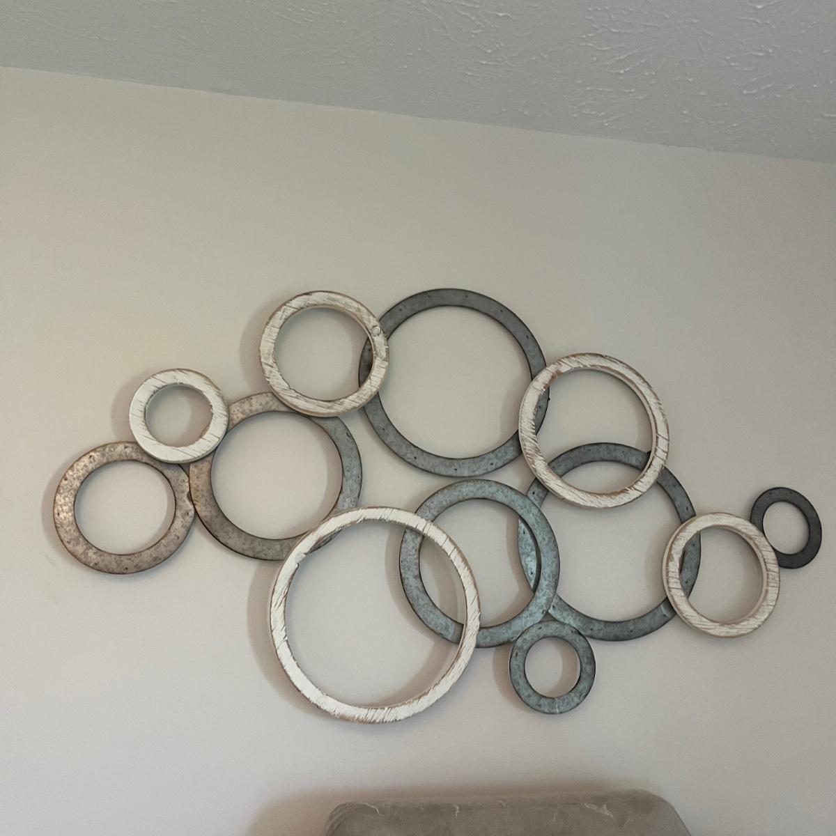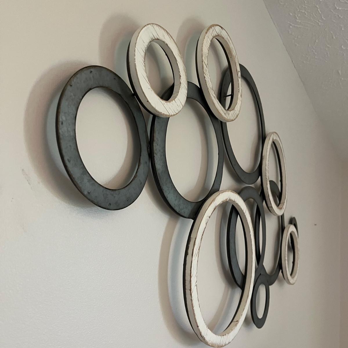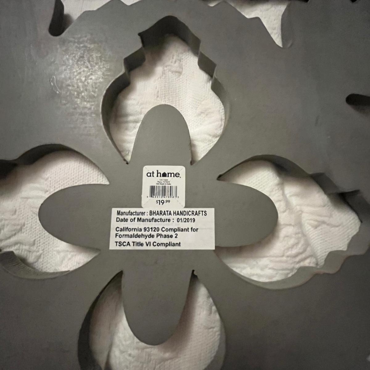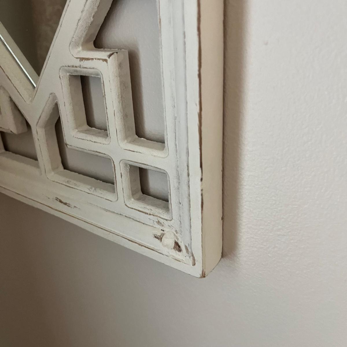 Lot includes three matching pieces of wall art that appear to be MDF with a gray weathered look. Each piece measures 16”sq. Also includes a white three diamond shaped mirrors with wooden frame that measures 12” x 35”H and a circle design wall art made from metal and wood. Plus a large mirror in a white wooden frame that measures 28" x 40"H. Shipping Available. Shipping can be costly. We suggest contacting our preferred local shipping provider, Postage Express, with dimensions and getting an estimate before bidding: (828) 670-5501 or postageexpress@yahoo.com.