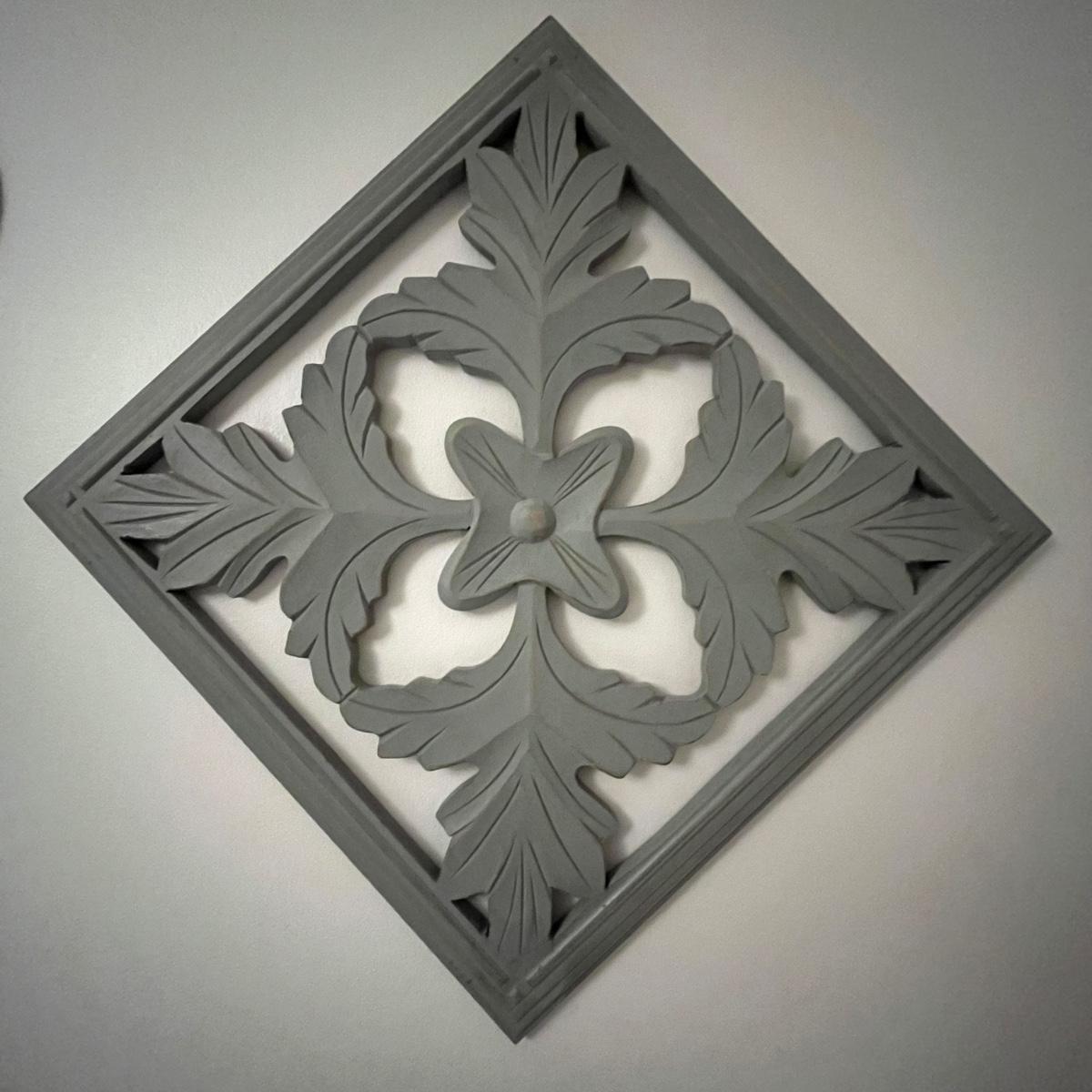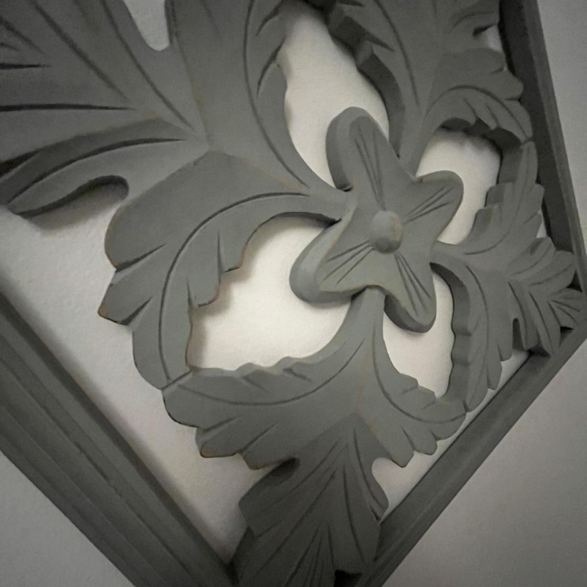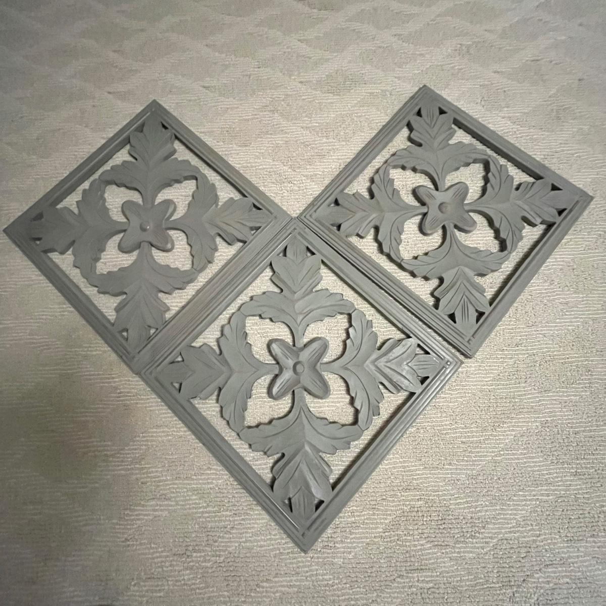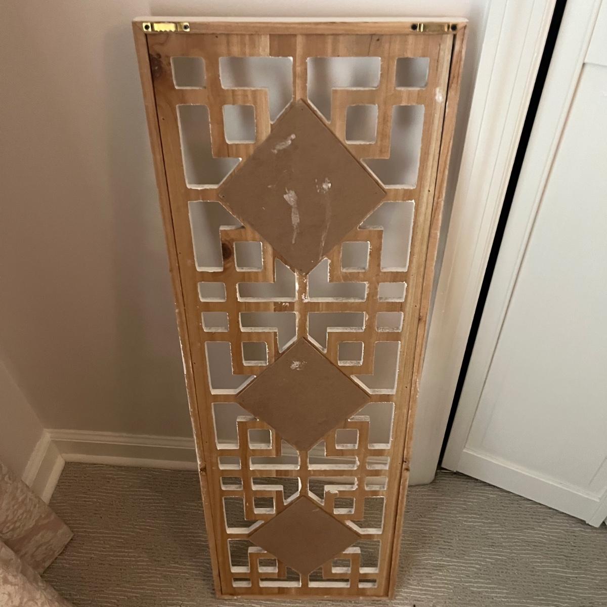 Lot includes three matching pieces of wall art that appear to be MDF with a gray weathered look. Each piece measures 16”sq. Also includes a white three diamond shaped mirrors with wooden frame that measures 12” x 35”H and a circle design wall art made from metal and wood. Plus a large mirror in a white wooden frame that measures 28" x 40"H. Shipping Available. Shipping can be costly. We suggest contacting our preferred local shipping provider, Postage Express, with dimensions and getting an estimate before bidding: (828) 670-5501 or postageexpress@yahoo.com.