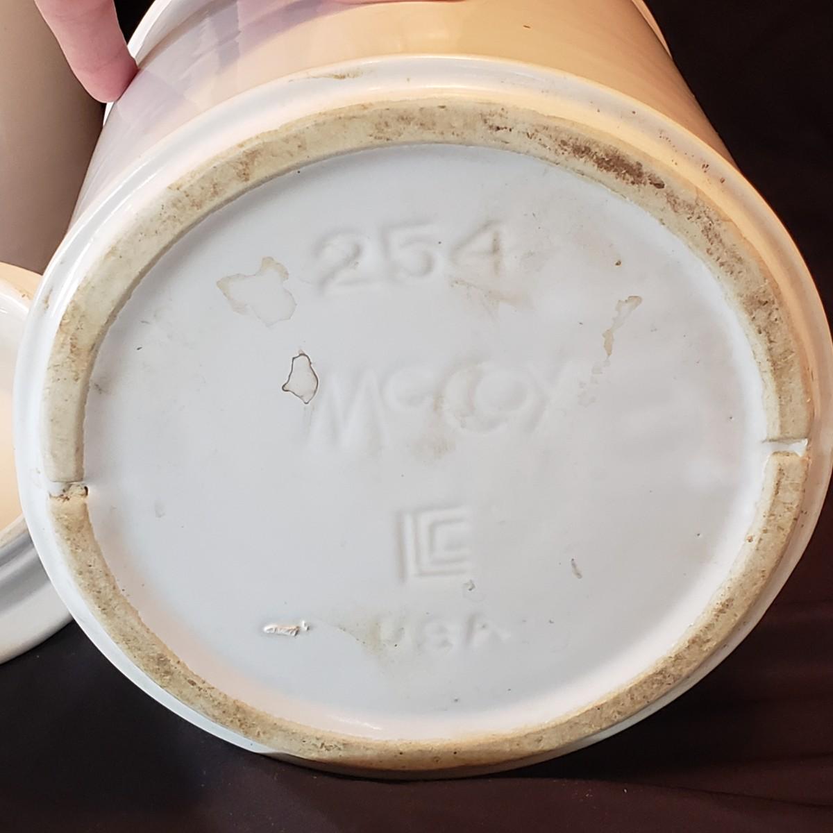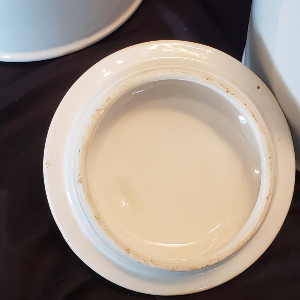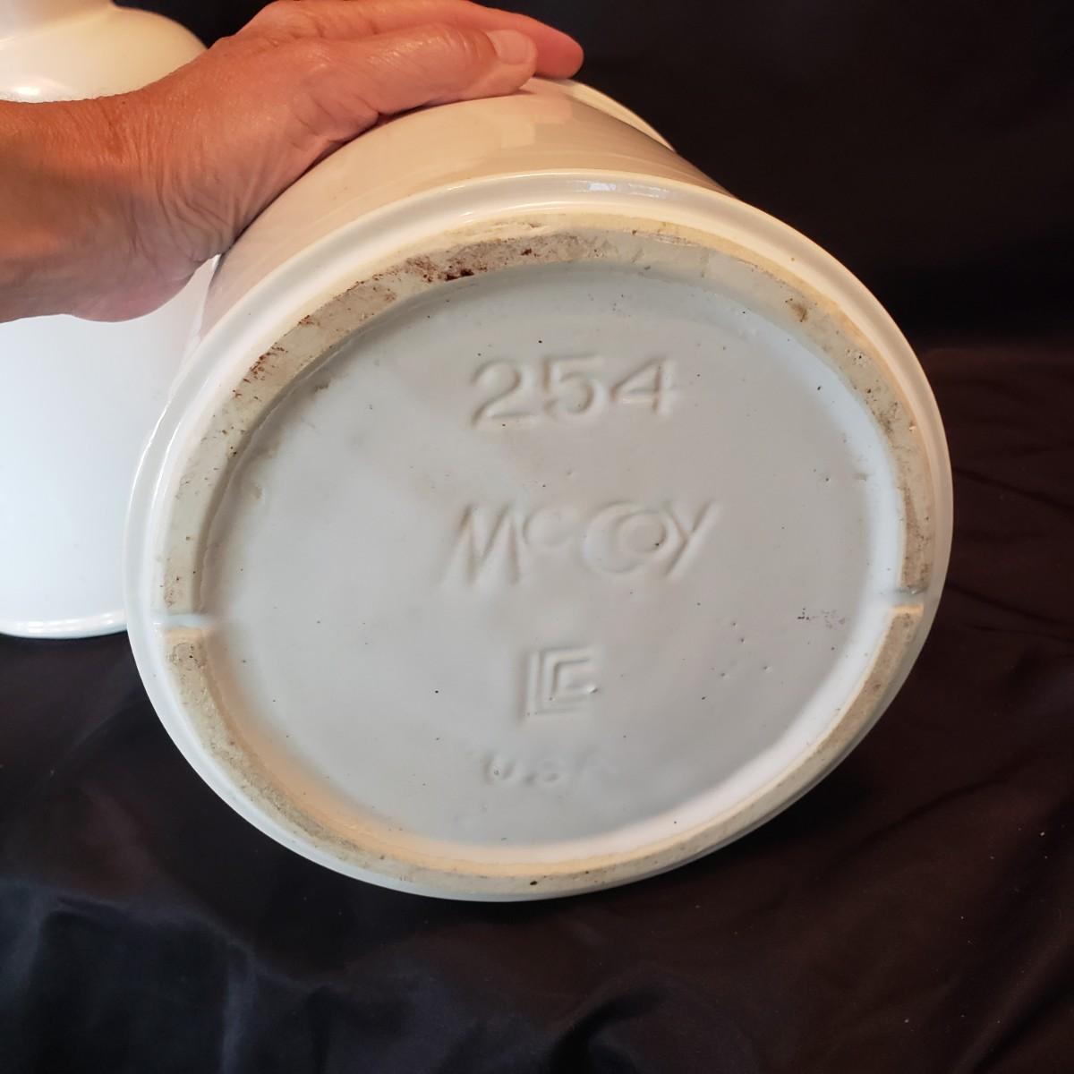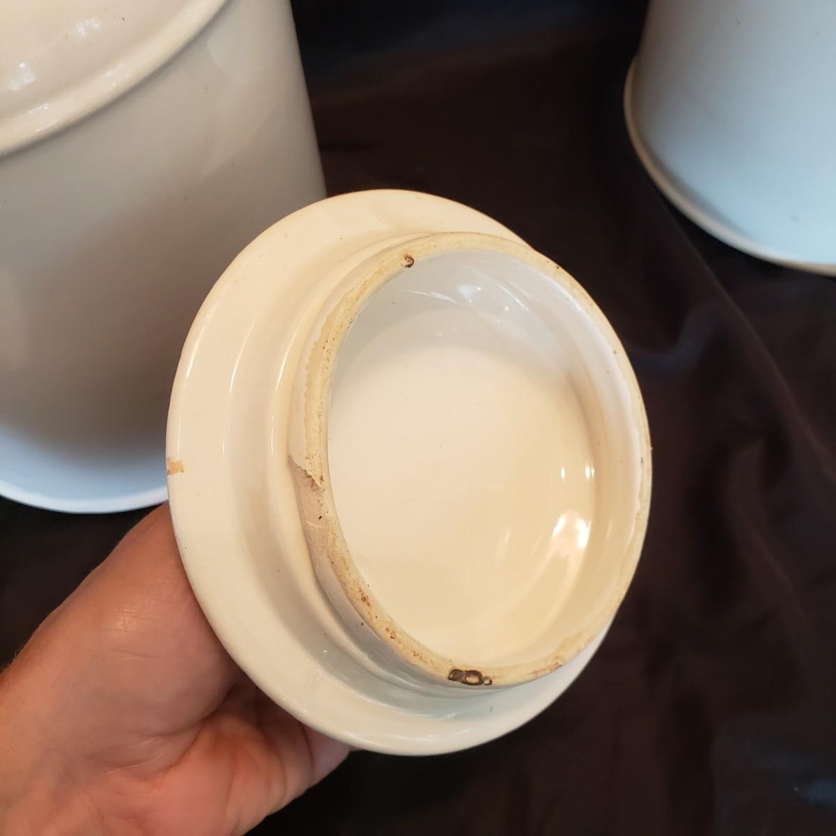 This lot features three identical white pottery McCoy cookie jars. Each jar measures 7" x 12" H. The inside bottom of each jar has a raised bumpy texture to it, which may be hard to see in the pictures. Each jar has a chip, one on the lid and the other two on the bottom rim. The pictures of this are all separate photos of different jars.