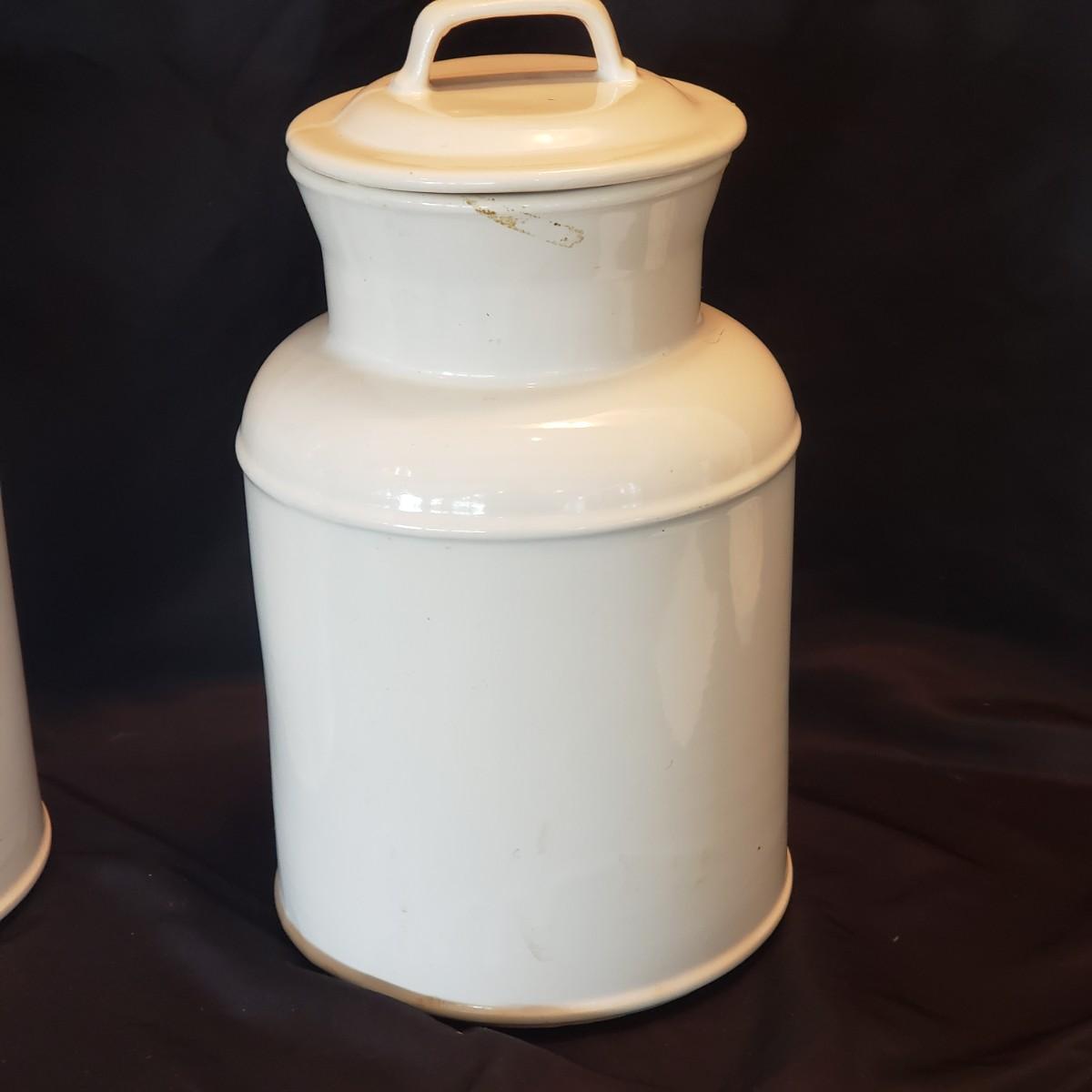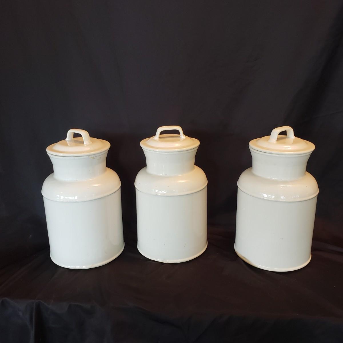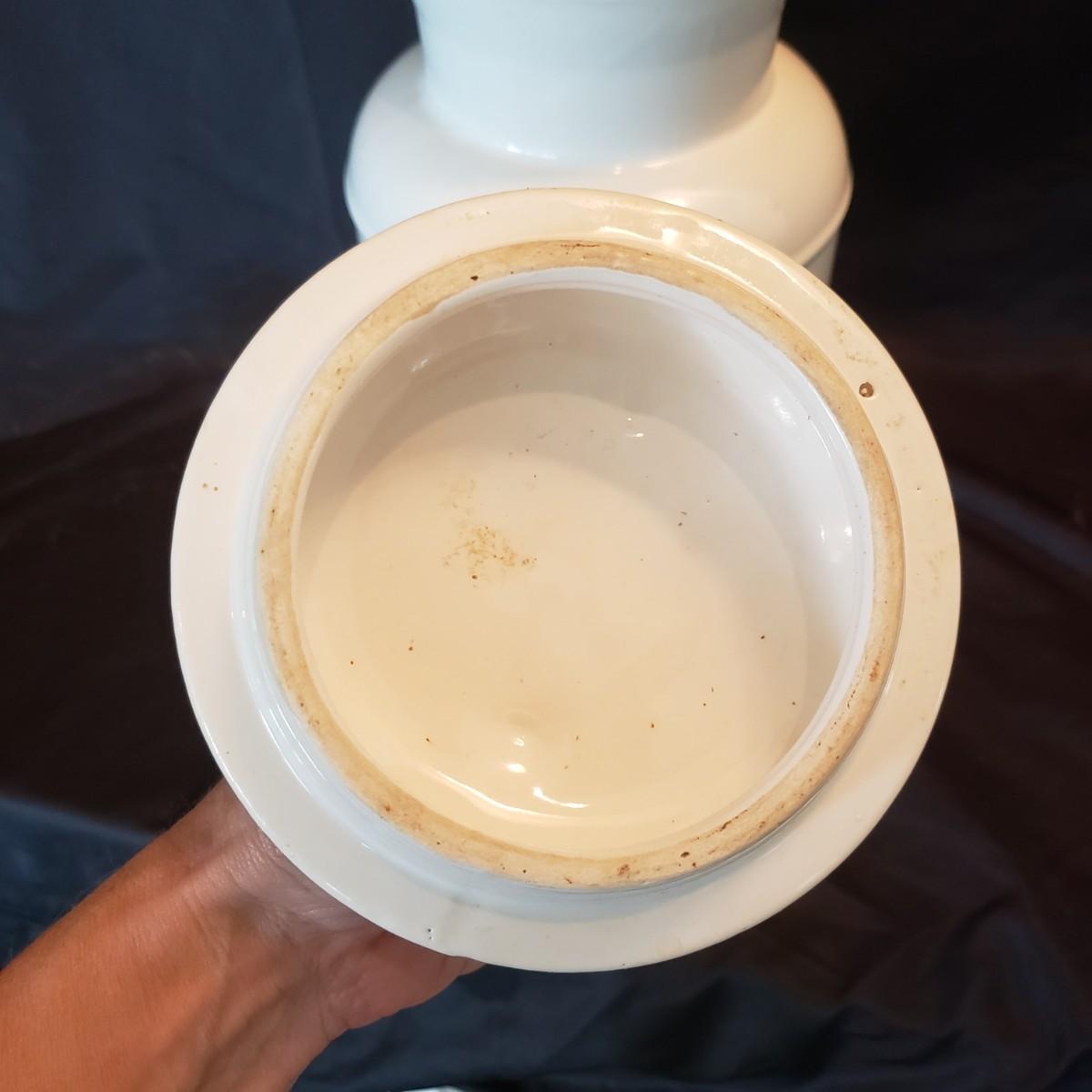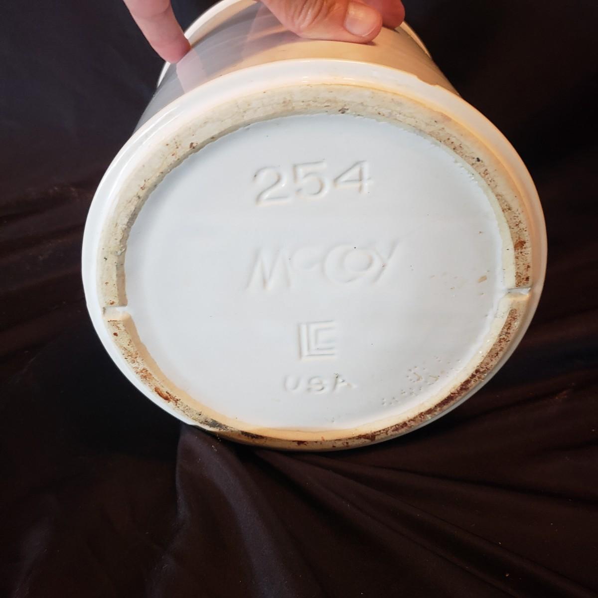 This lot features three identical white pottery McCoy cookie jars. Each jar measures 7" x 12" H. The inside bottom of each jar has a raised bumpy texture to it, which may be hard to see in the pictures. Each jar has a chip, one on the lid and the other two on the bottom rim. The pictures of this are all separate photos of different jars.