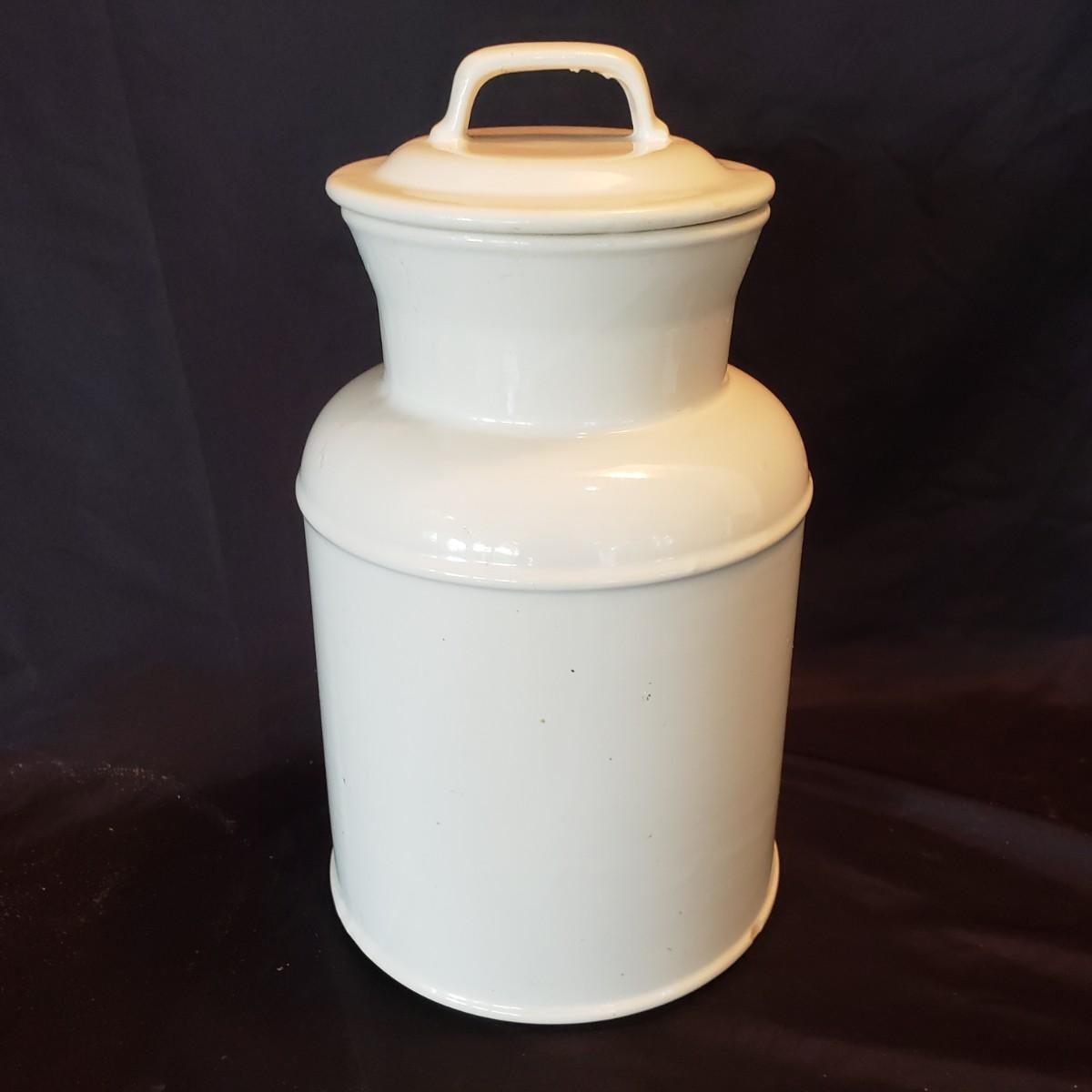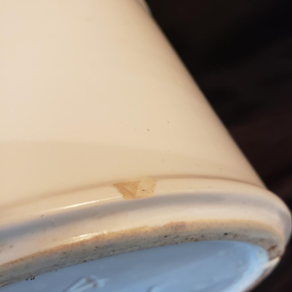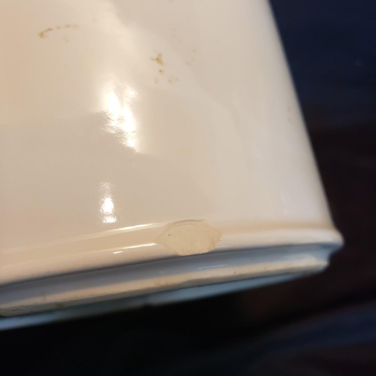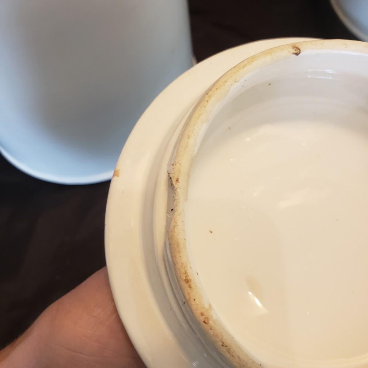 This lot features three identical white pottery McCoy cookie jars. Each jar measures 7" x 12" H. The inside bottom of each jar has a raised bumpy texture to it, which may be hard to see in the pictures. Each jar has a chip, one on the lid and the other two on the bottom rim. The pictures of this are all separate photos of different jars.
