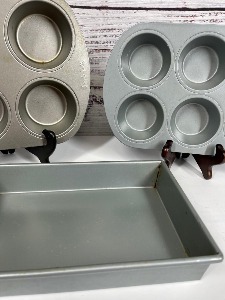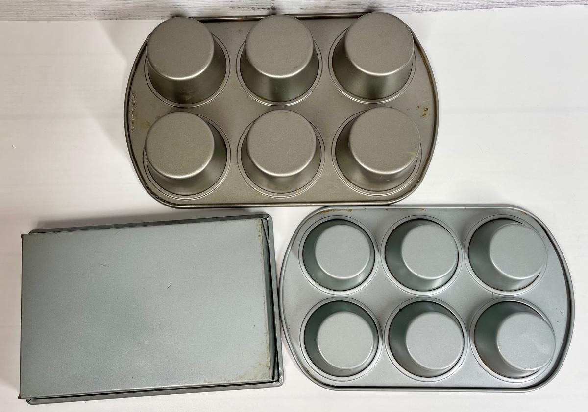 Three metal bakeware pieces: two muffin pans and one small cake pan