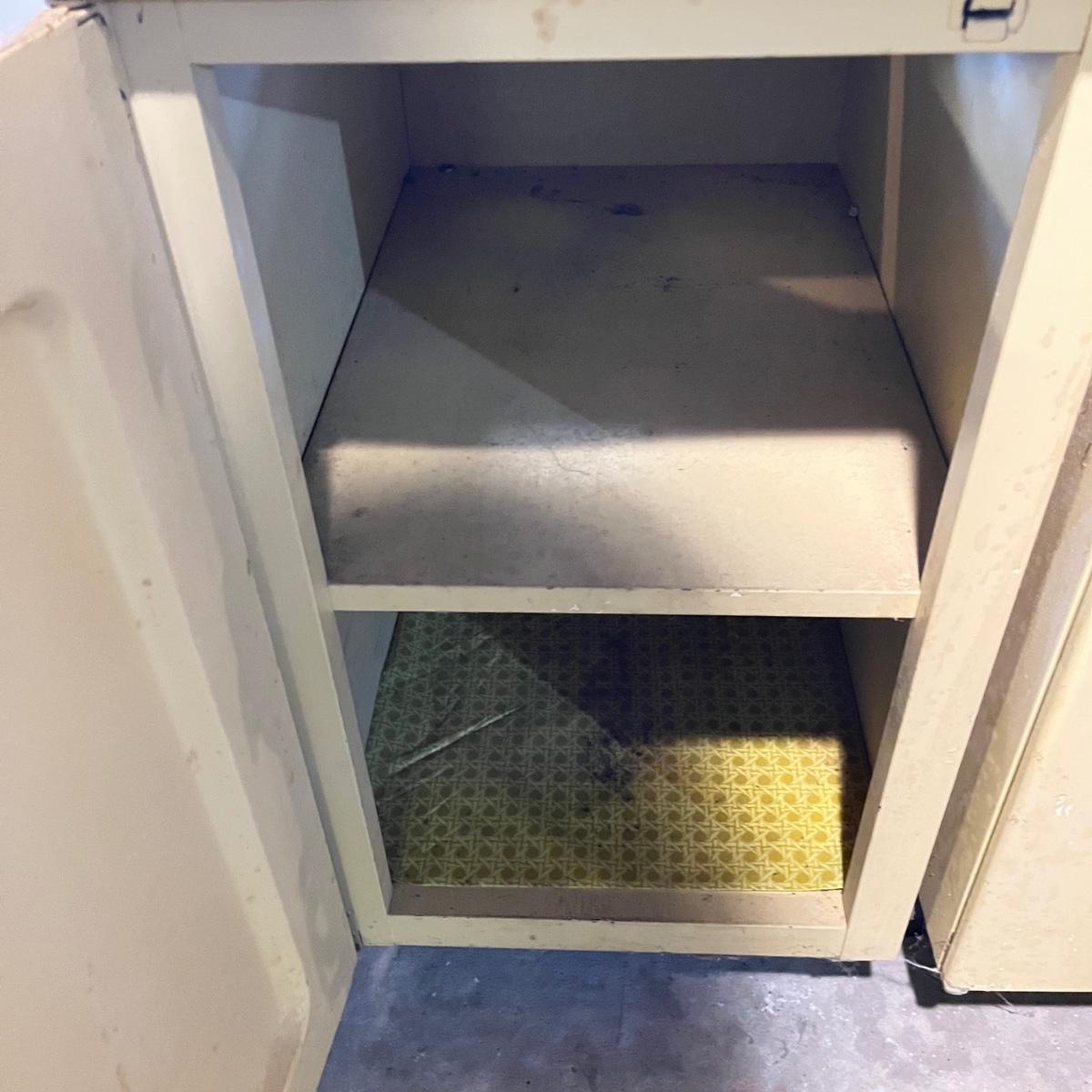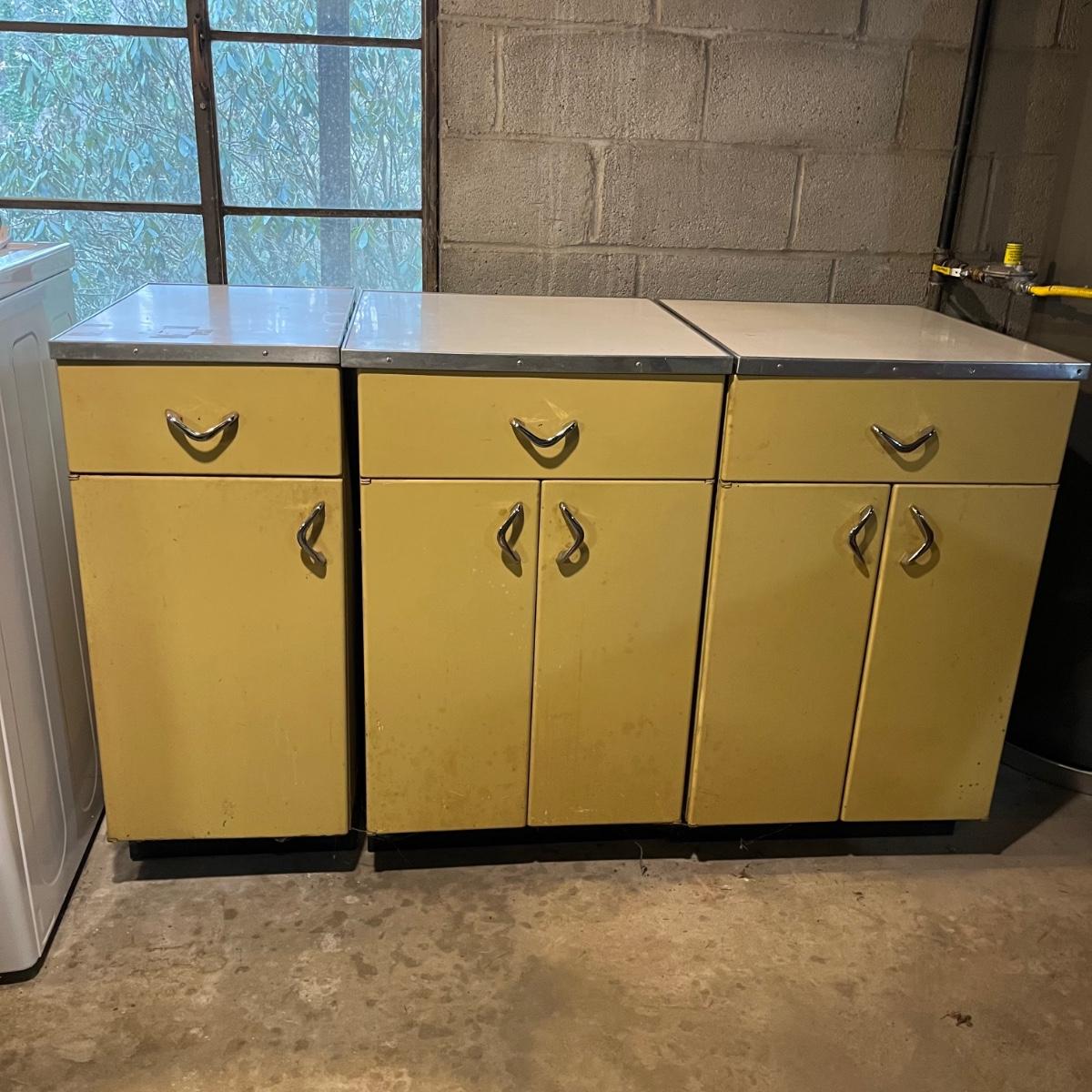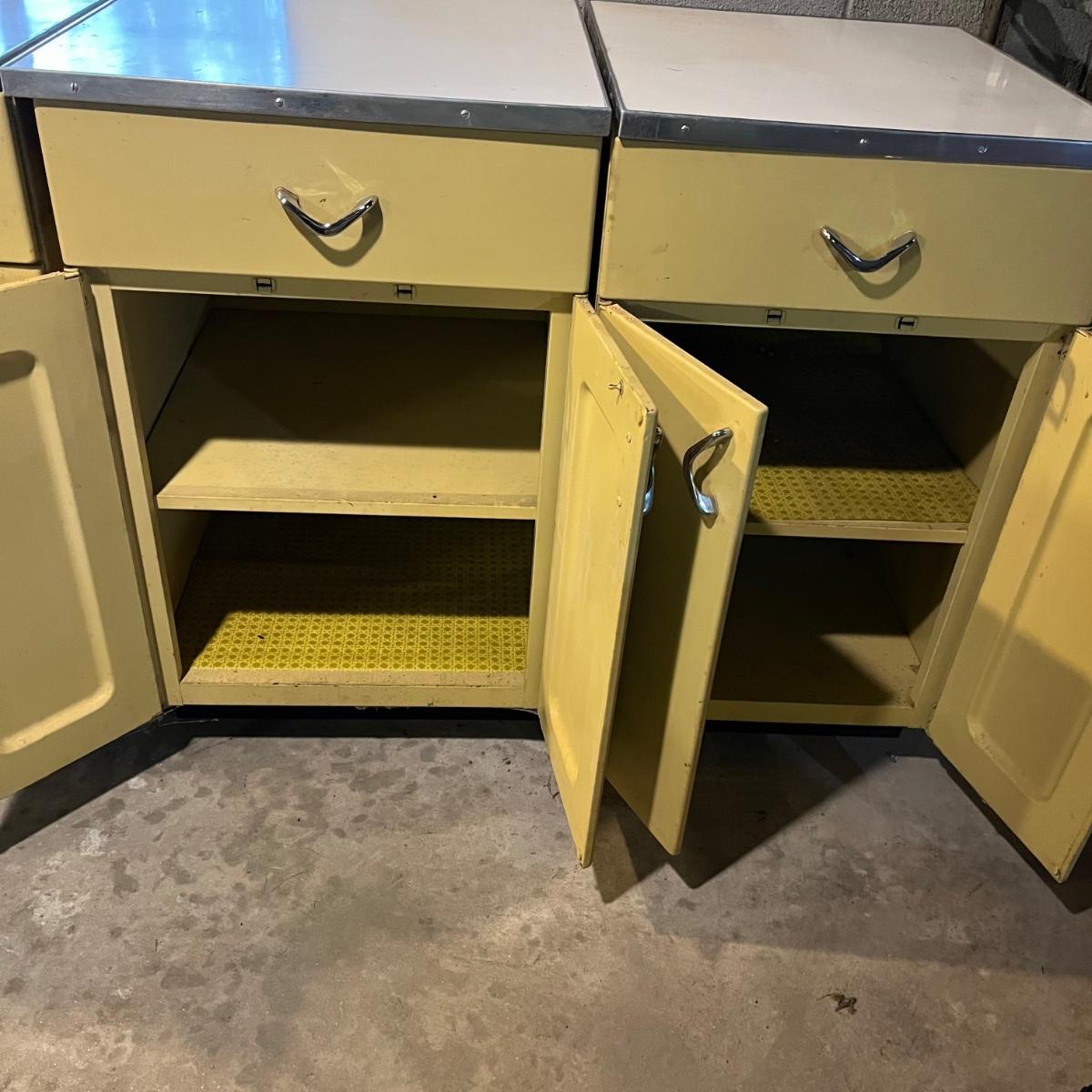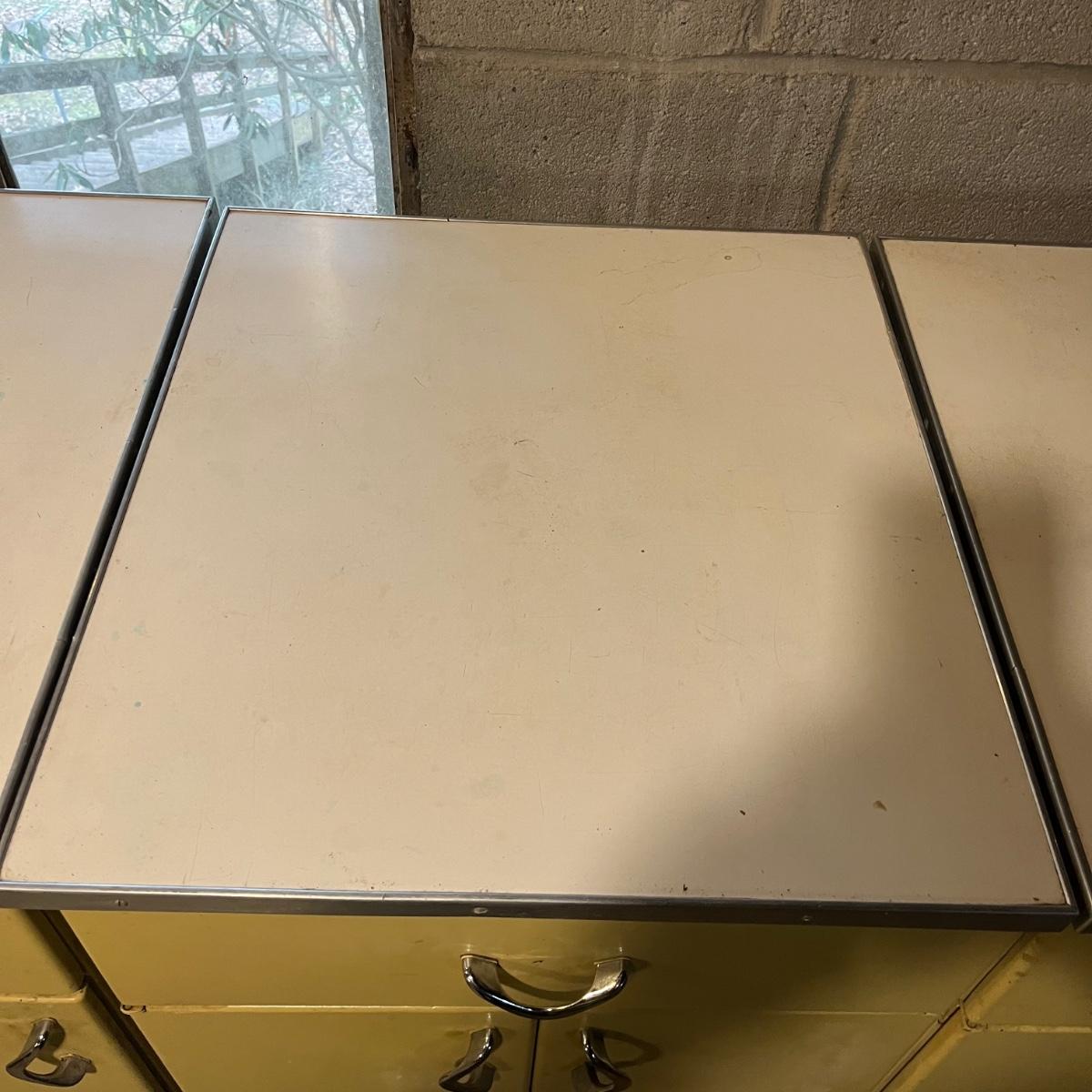 Lot includes three metal cabinets with laminate tops that are just set on top. Two cabinets have one drawer with two doors and one has drawer with one door. Two largest cabinets measure 21” x 24” x 35.75” and the smaller cabinet measures 15” x 24” x 35.75”.
