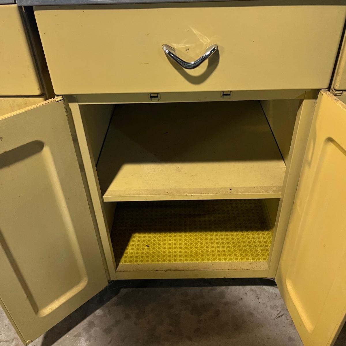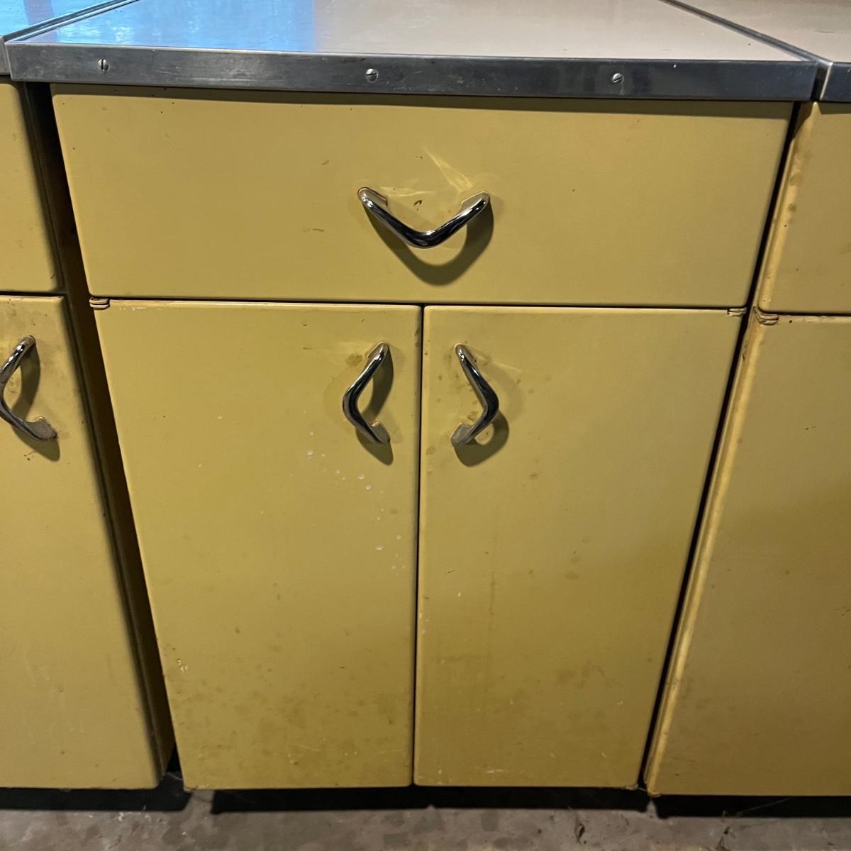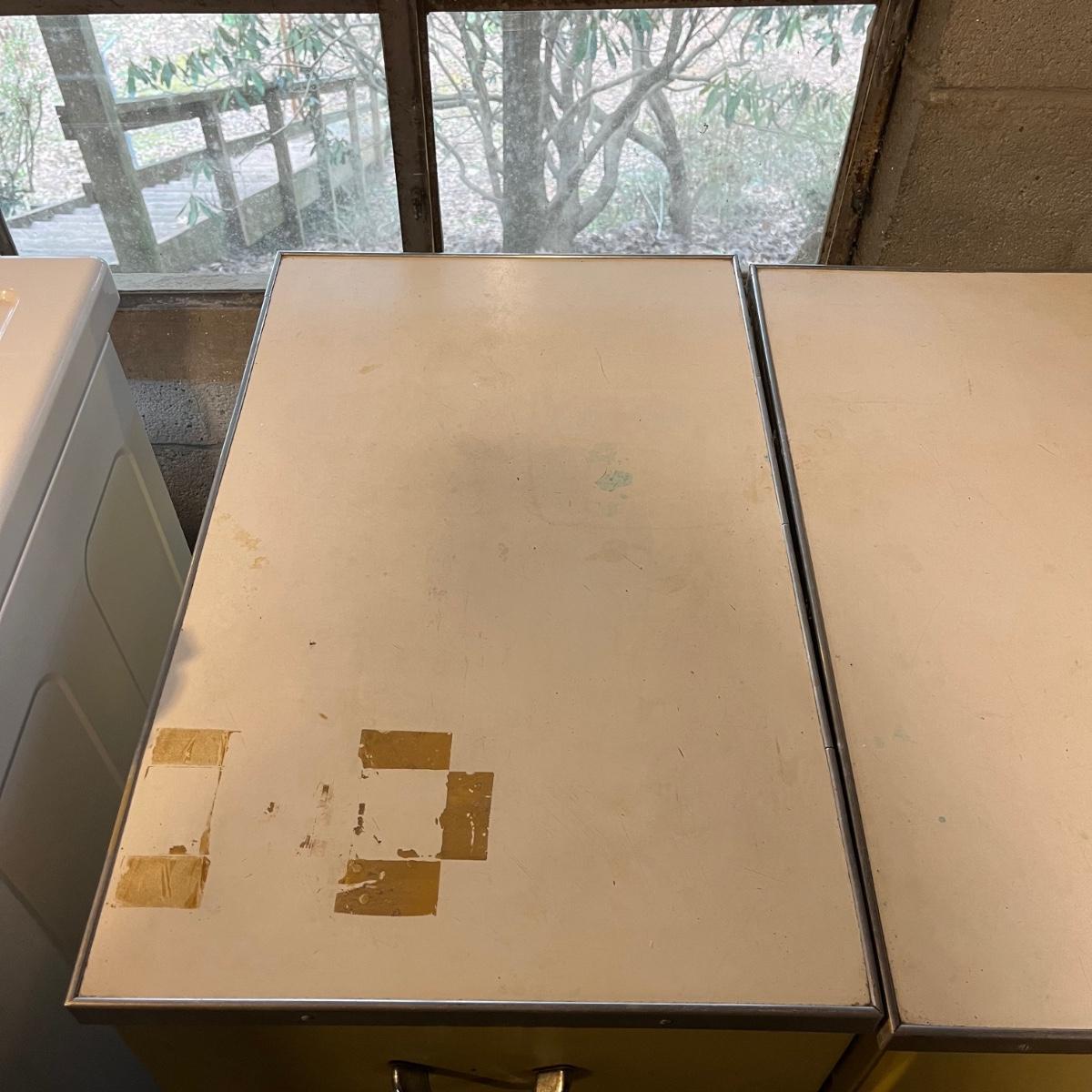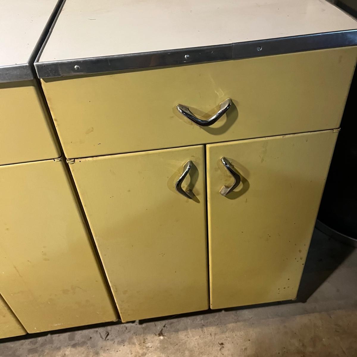 Lot includes three metal cabinets with laminate tops that are just set on top. Two cabinets have one drawer with two doors and one has drawer with one door. Two largest cabinets measure 21” x 24” x 35.75” and the smaller cabinet measures 15” x 24” x 35.75”.