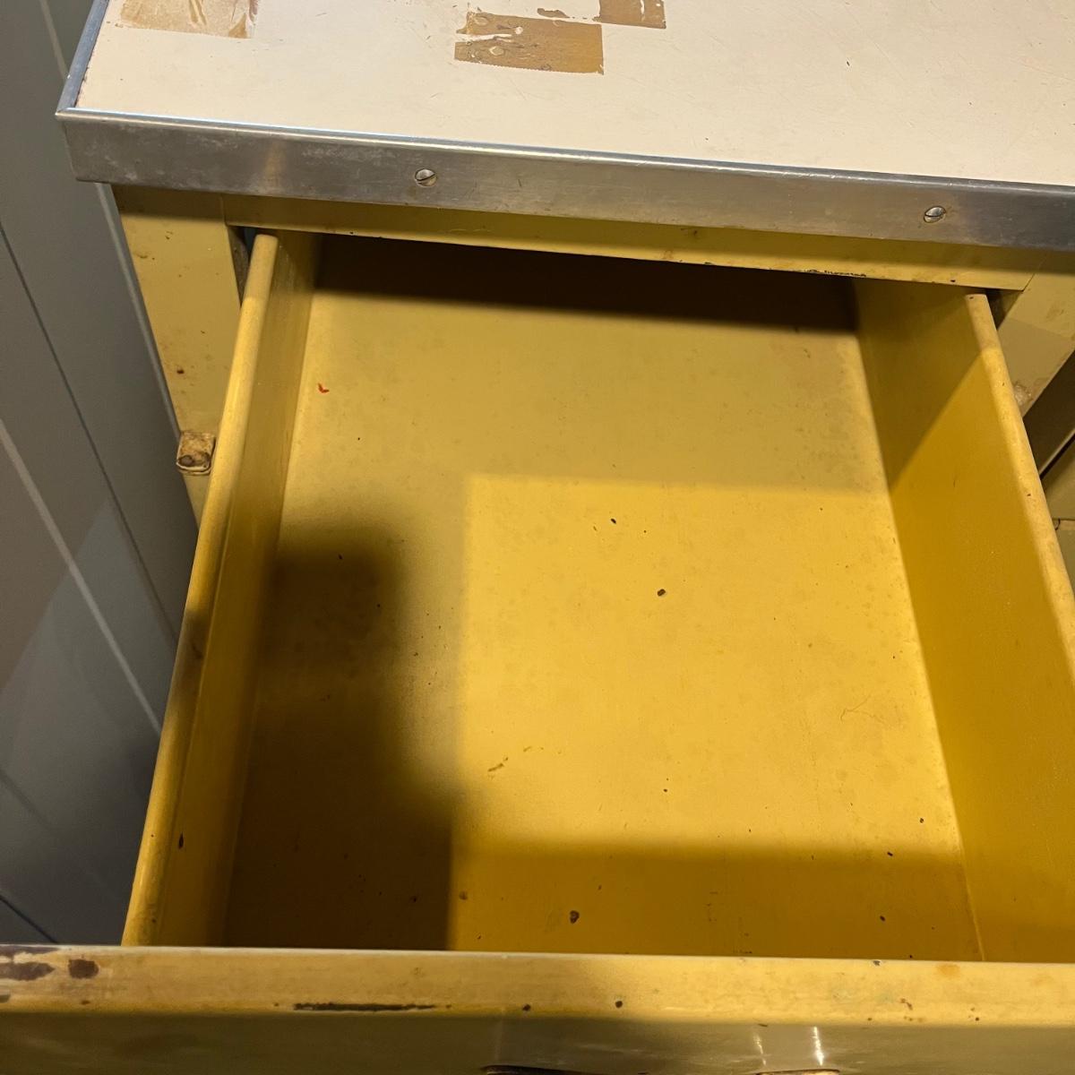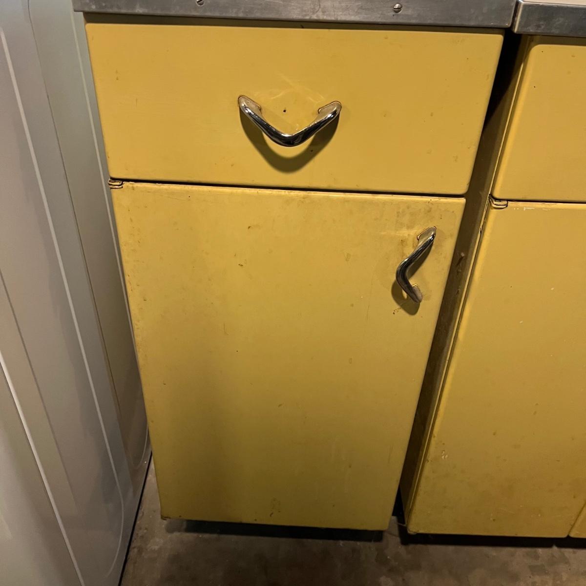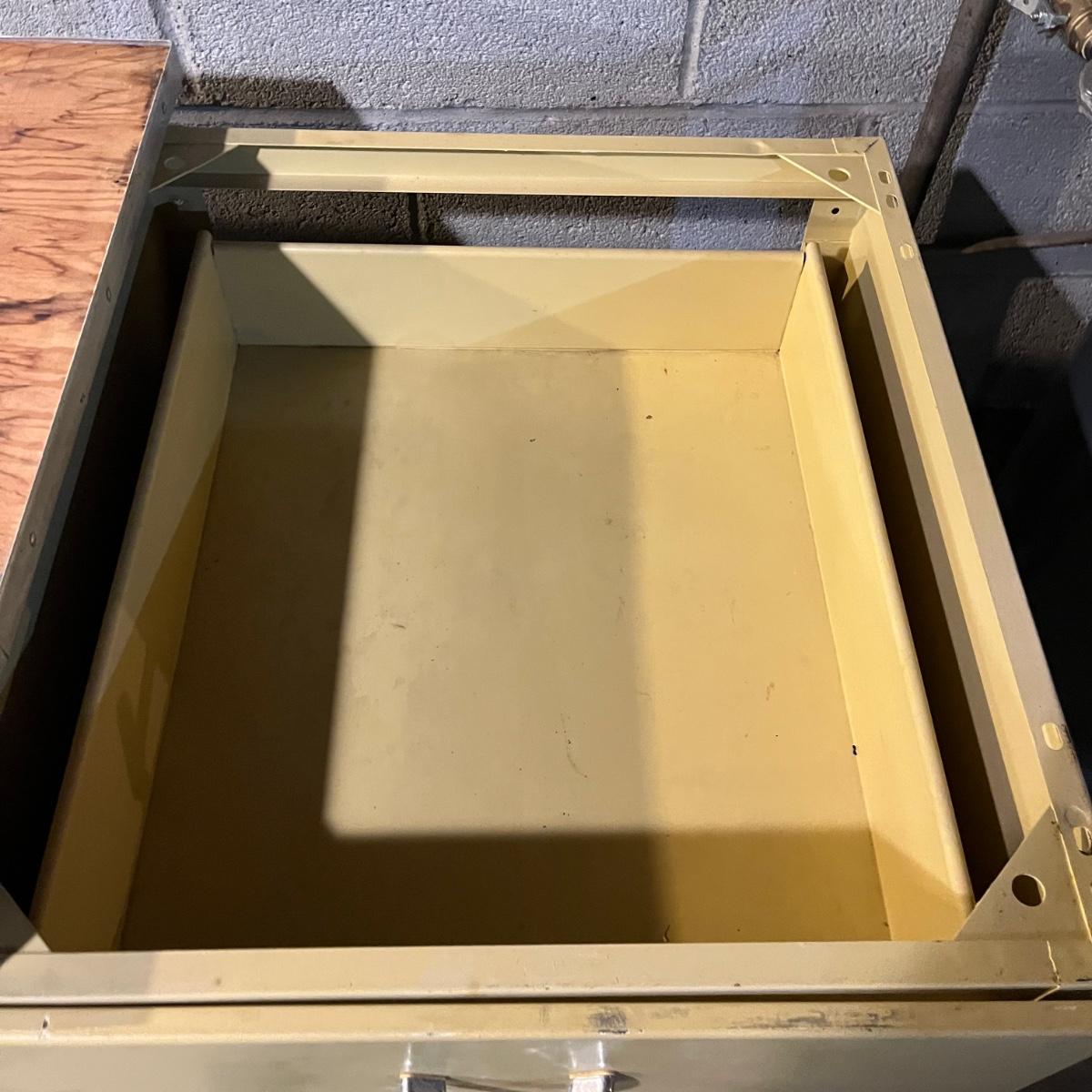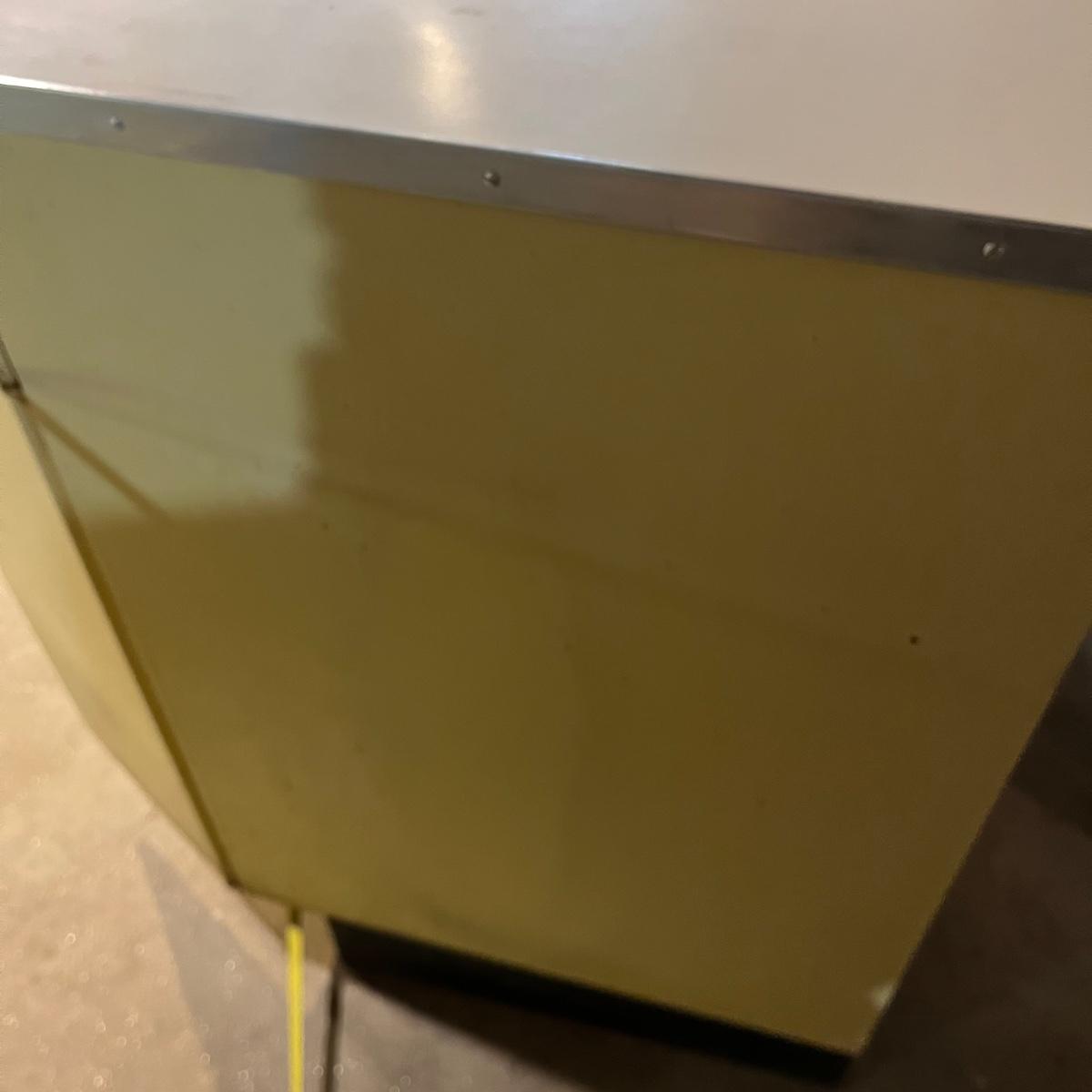 Lot includes three metal cabinets with laminate tops that are just set on top. Two cabinets have one drawer with two doors and one has drawer with one door. Two largest cabinets measure 21” x 24” x 35.75” and the smaller cabinet measures 15” x 24” x 35.75”.
