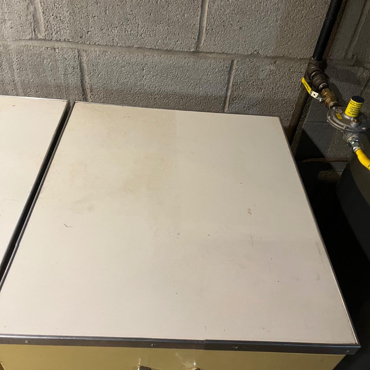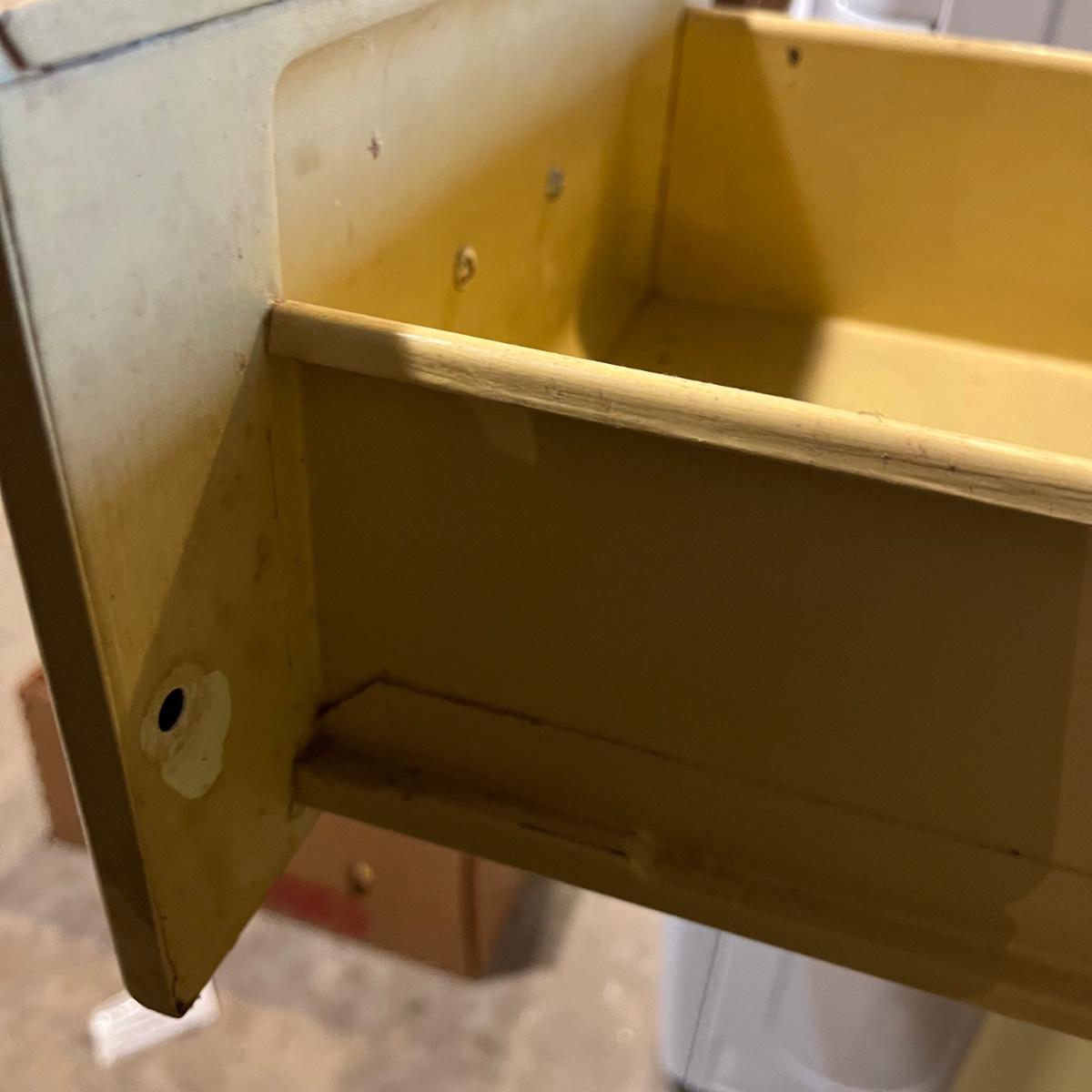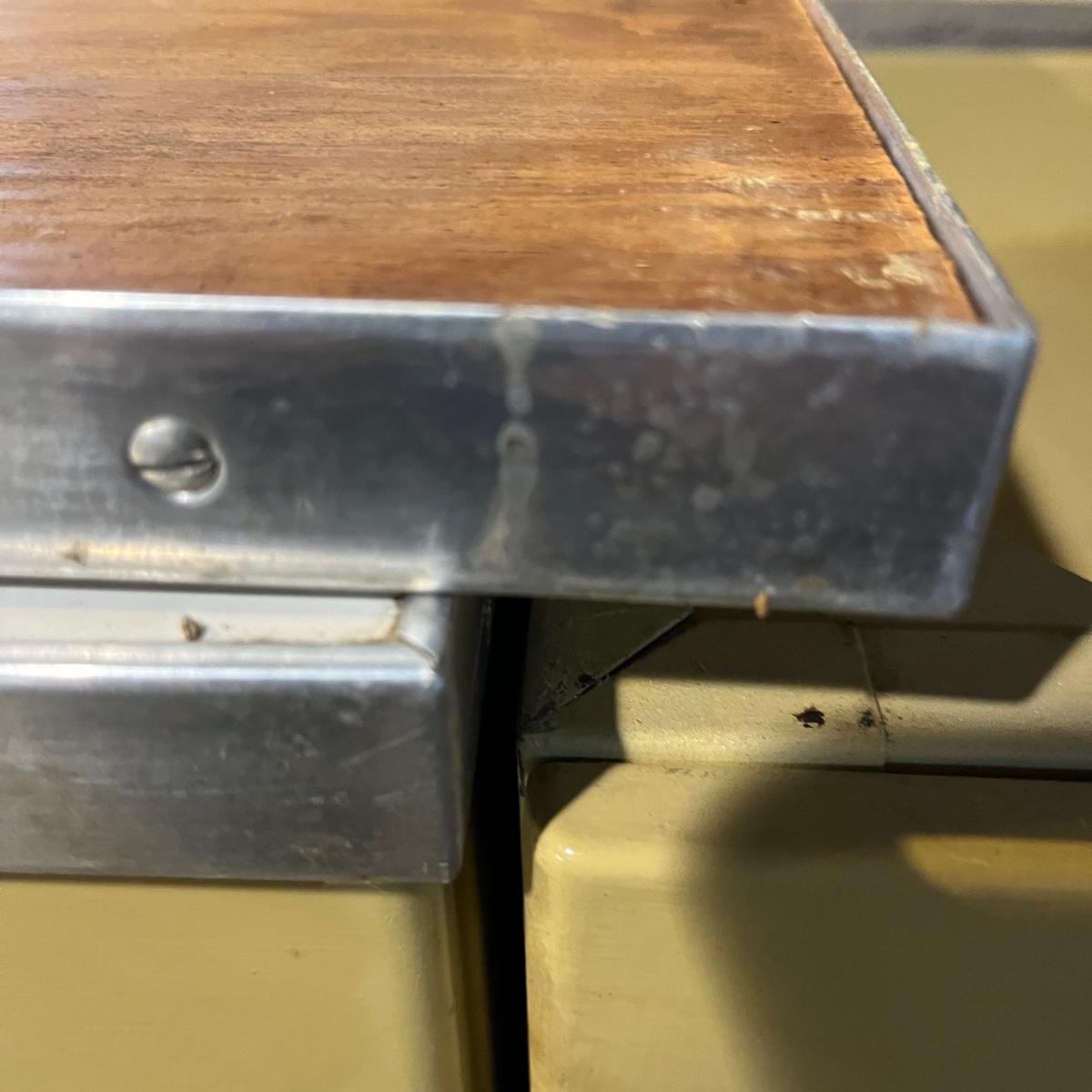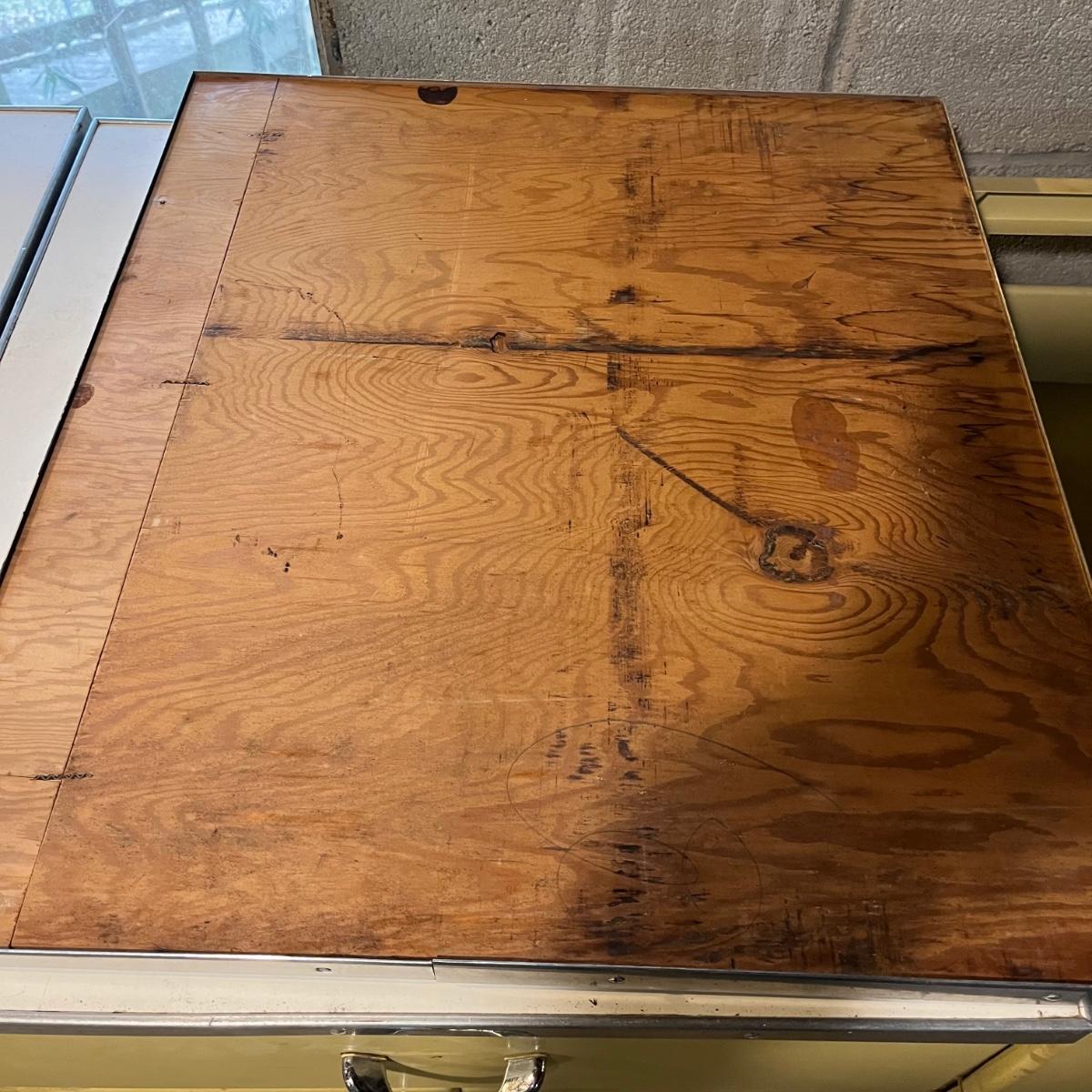 Lot includes three metal cabinets with laminate tops that are just set on top. Two cabinets have one drawer with two doors and one has drawer with one door. Two largest cabinets measure 21” x 24” x 35.75” and the smaller cabinet measures 15” x 24” x 35.75”.