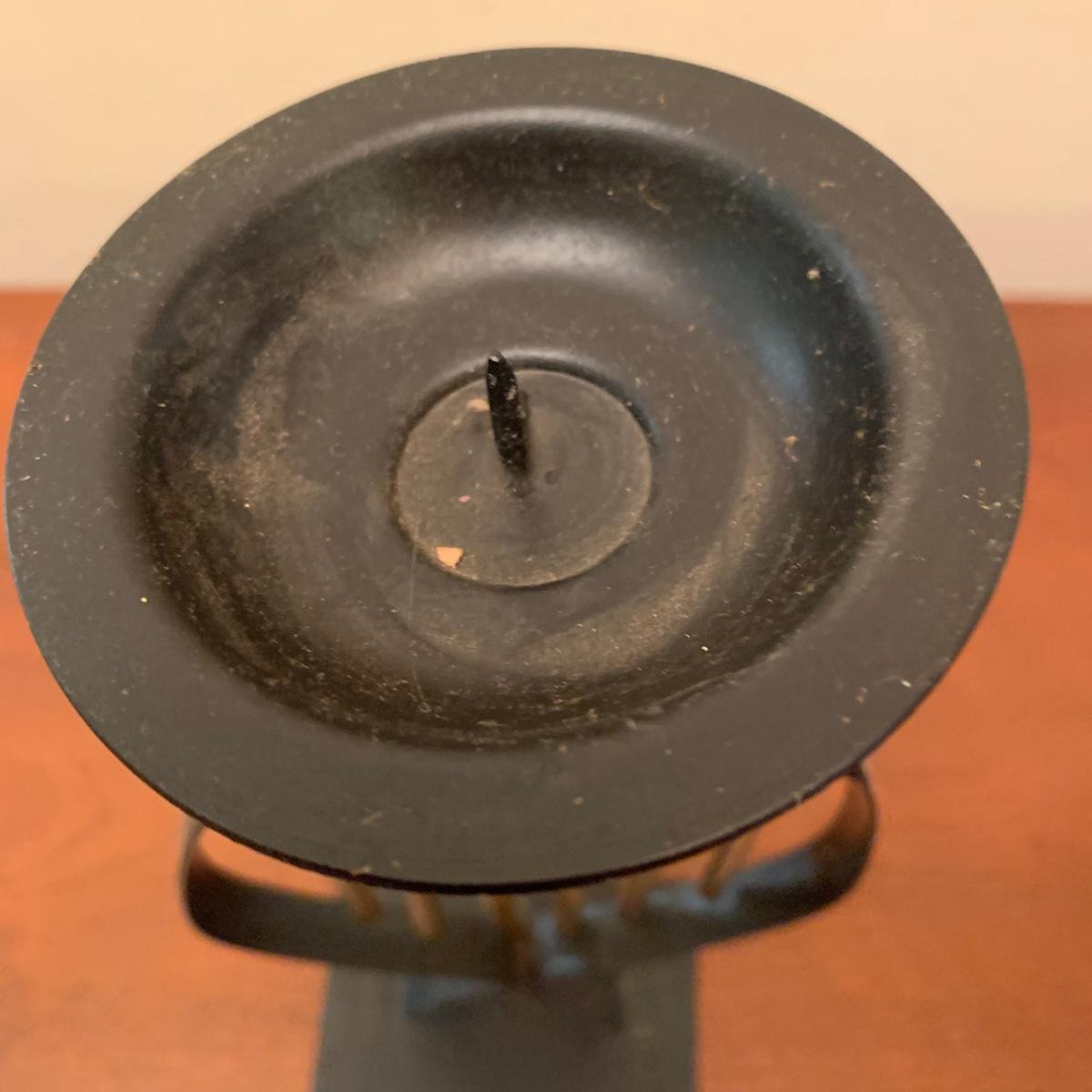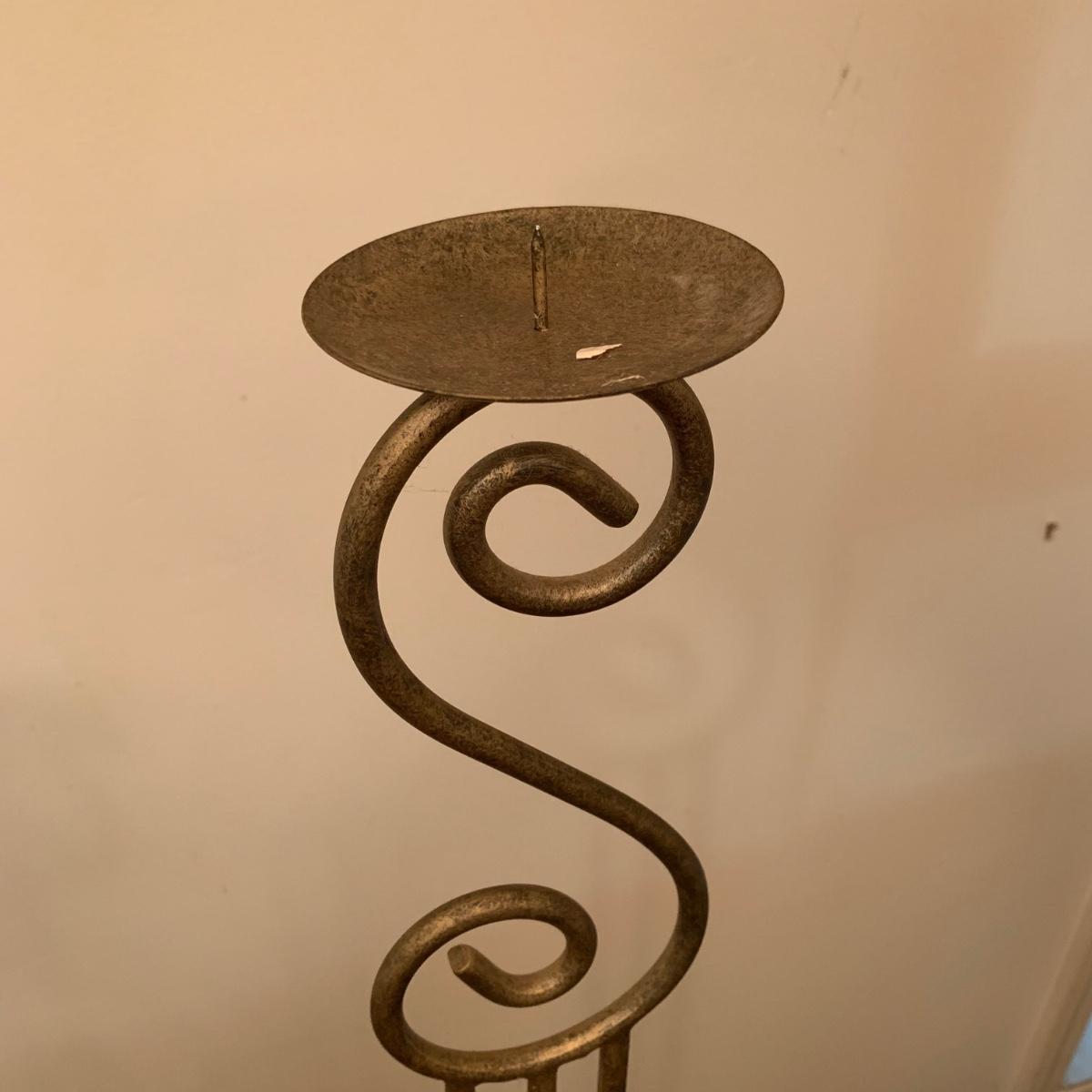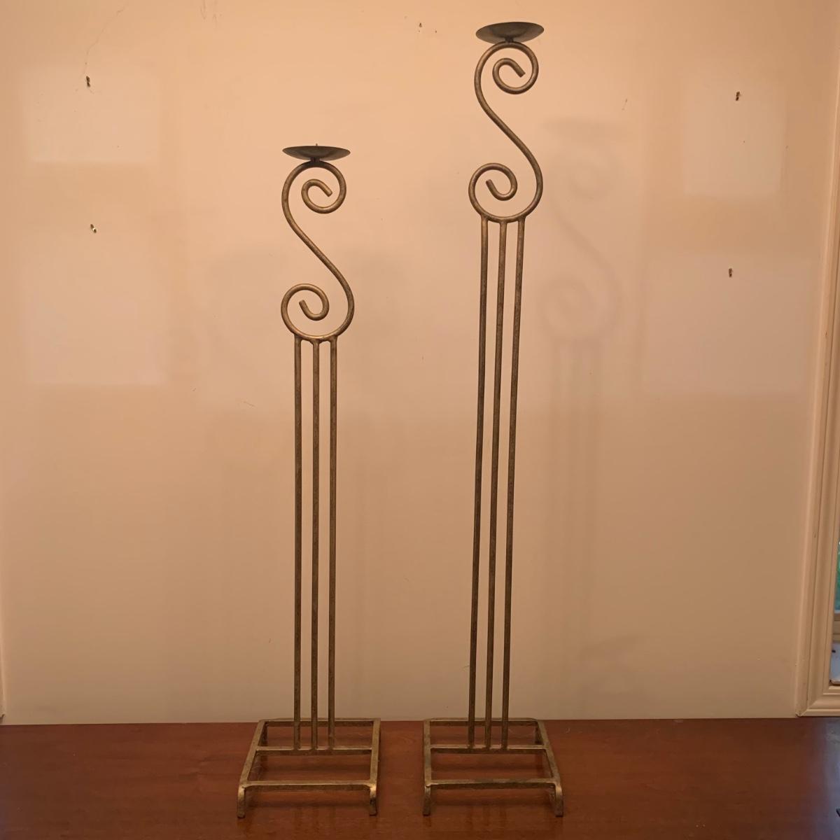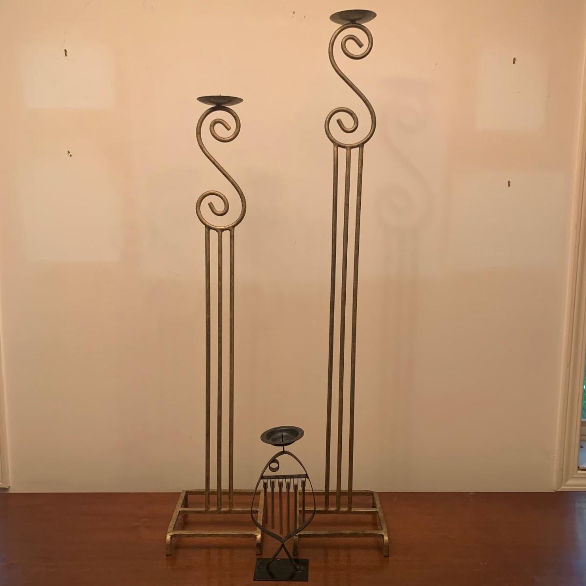Three metal candle holders. Two are tall floor candle holders that have a distressed gold appearance. The tallest measures 8” x 9” x 45”. The smallest candle holder has dangling musical chimes. It is black metal and 11.5” tall. All are in good condition, but do need to be cleaned.