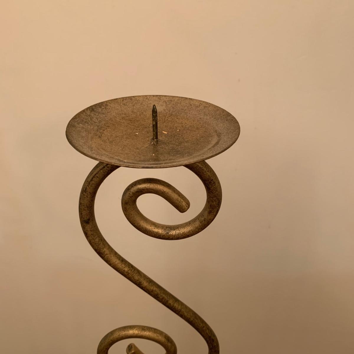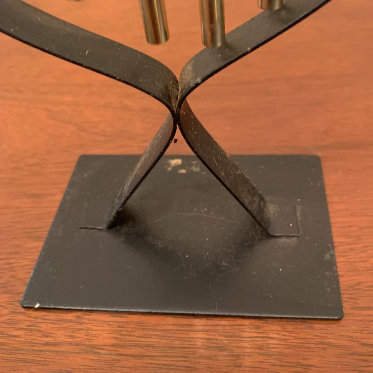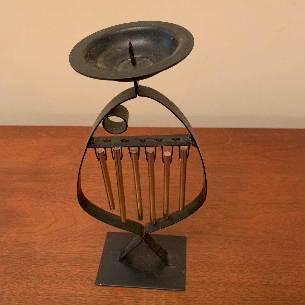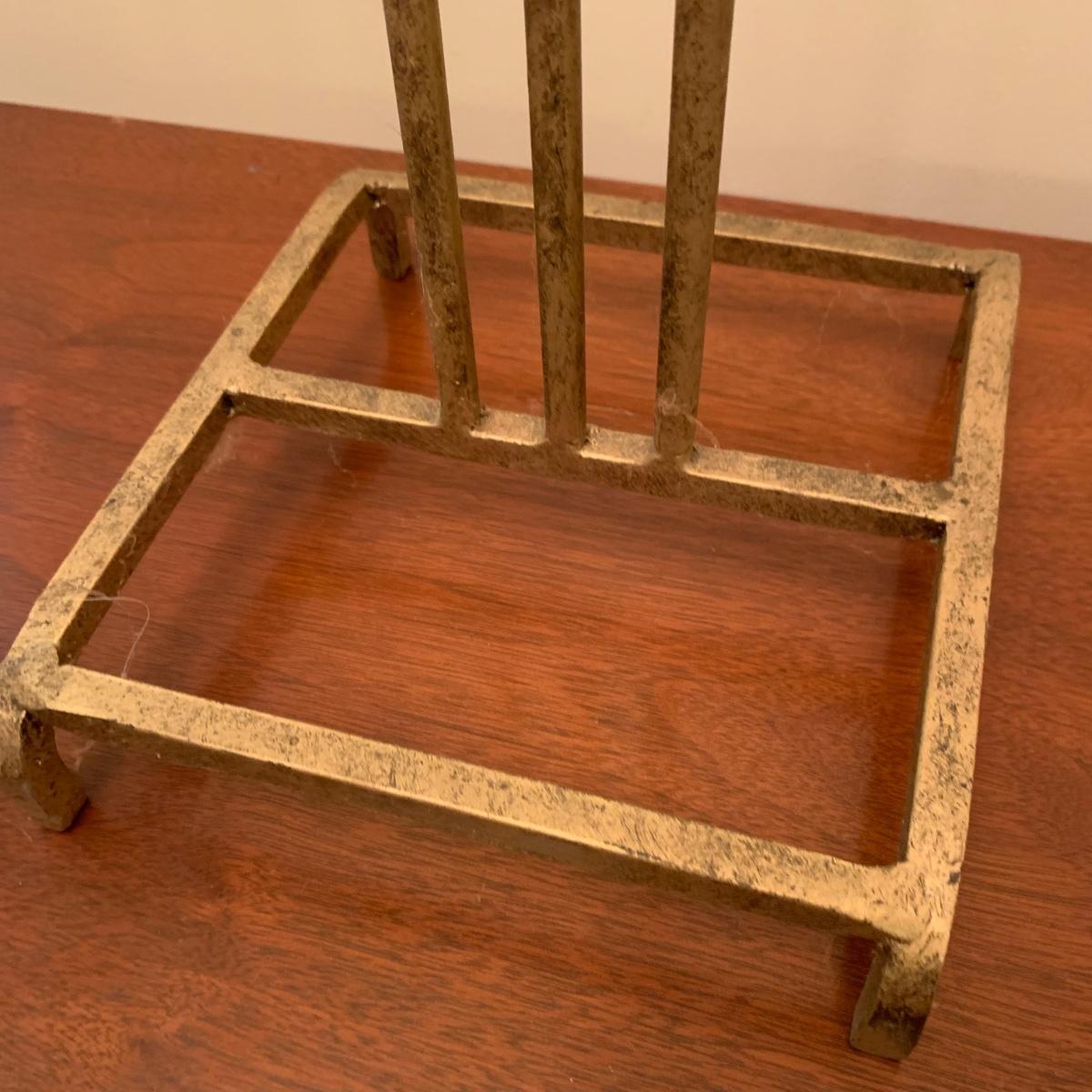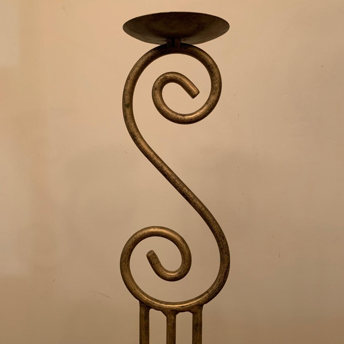 Three metal candle holders. Two are tall floor candle holders that have a distressed gold appearance. The tallest measures 8” x 9” x 45”. The smallest candle holder has dangling musical chimes. It is black metal and 11.5” tall. All are in good condition, but do need to be cleaned.
