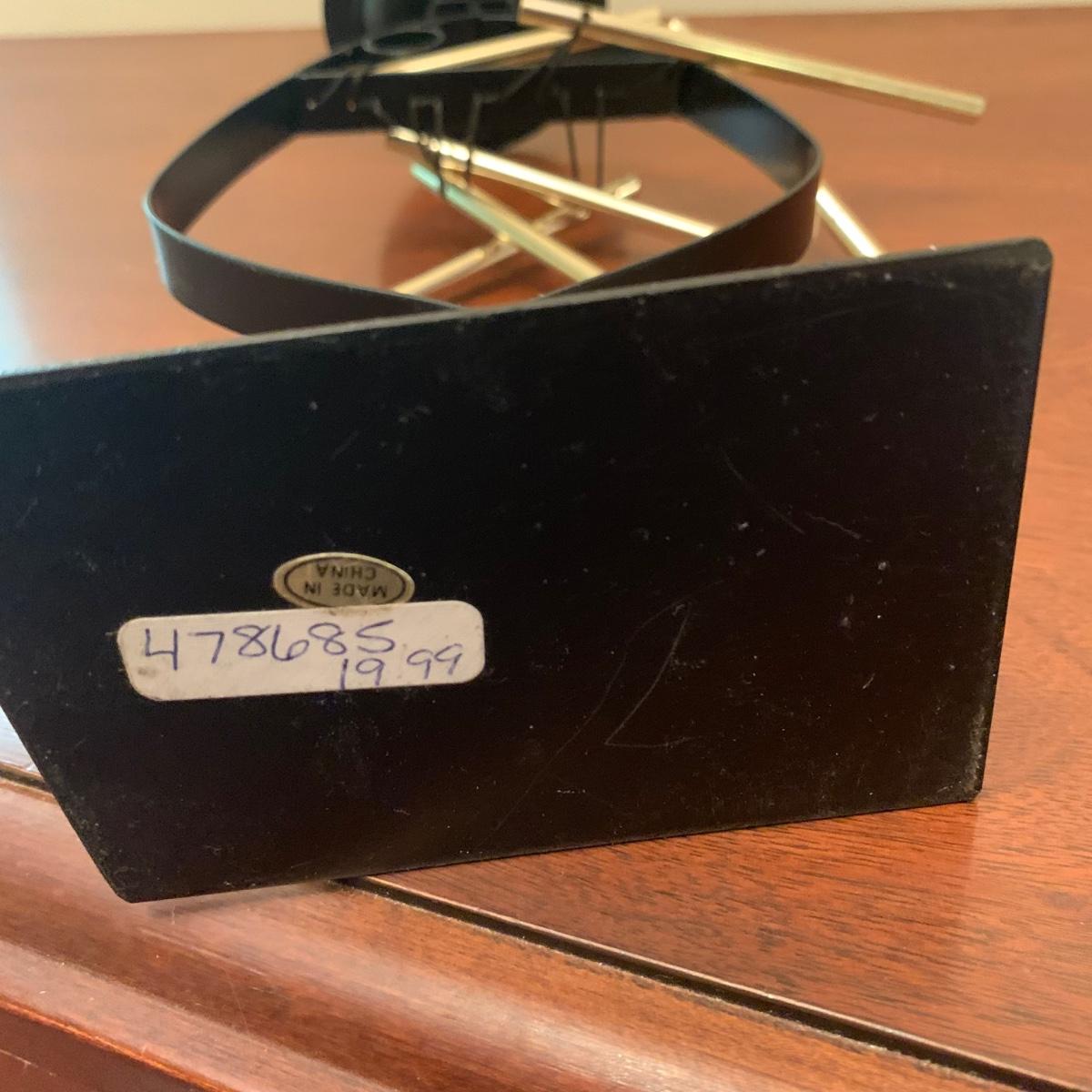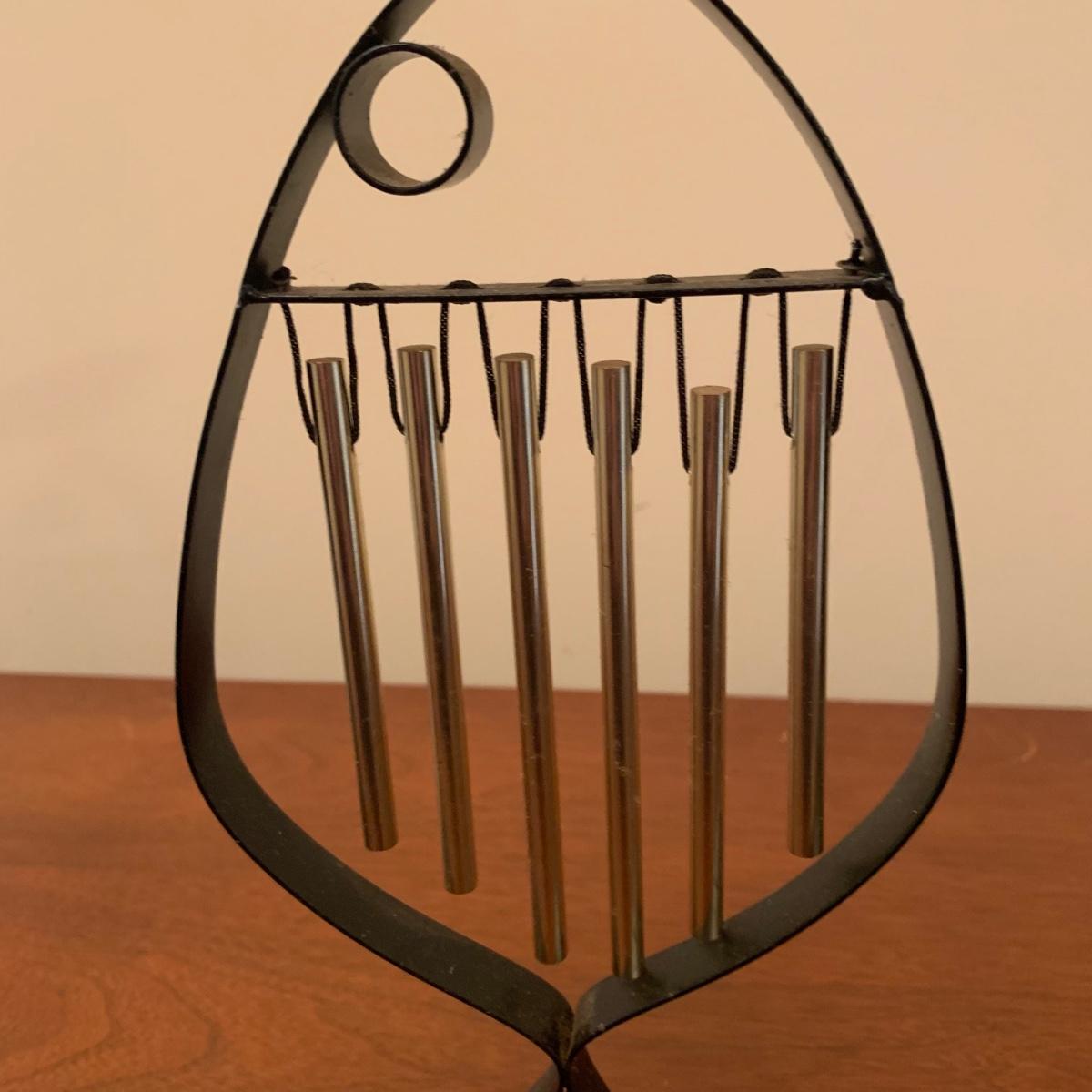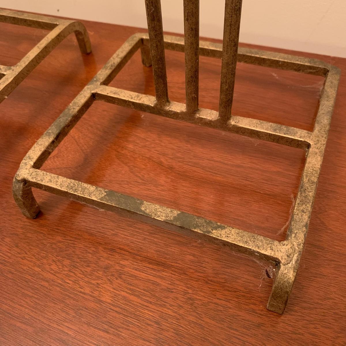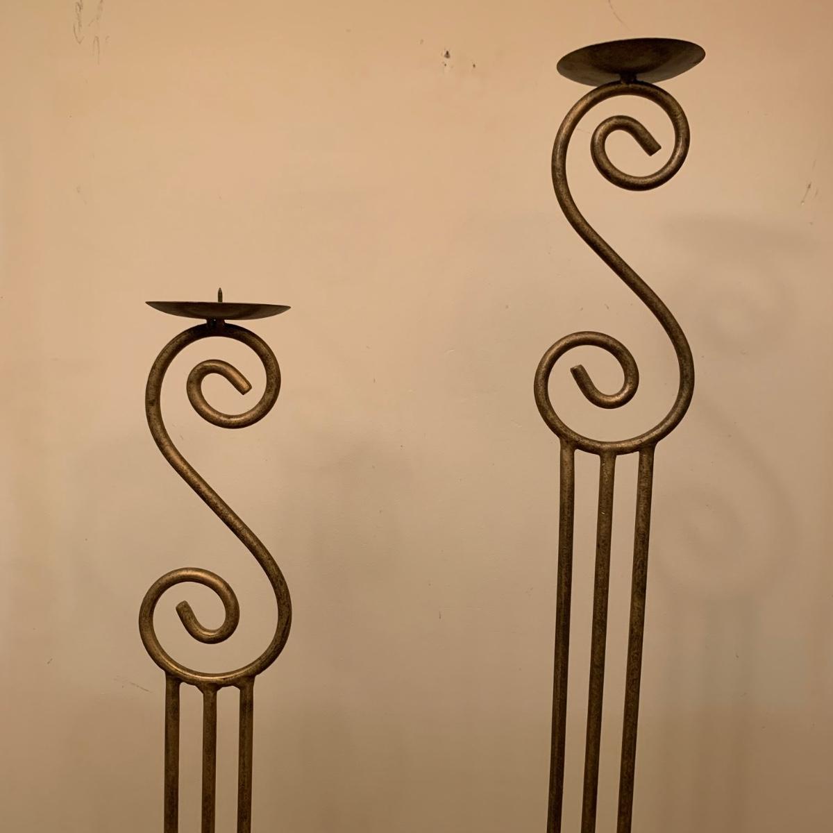 Three metal candle holders. Two are tall floor candle holders that have a distressed gold appearance. The tallest measures 8” x 9” x 45”. The smallest candle holder has dangling musical chimes. It is black metal and 11.5” tall. All are in good condition, but do need to be cleaned.