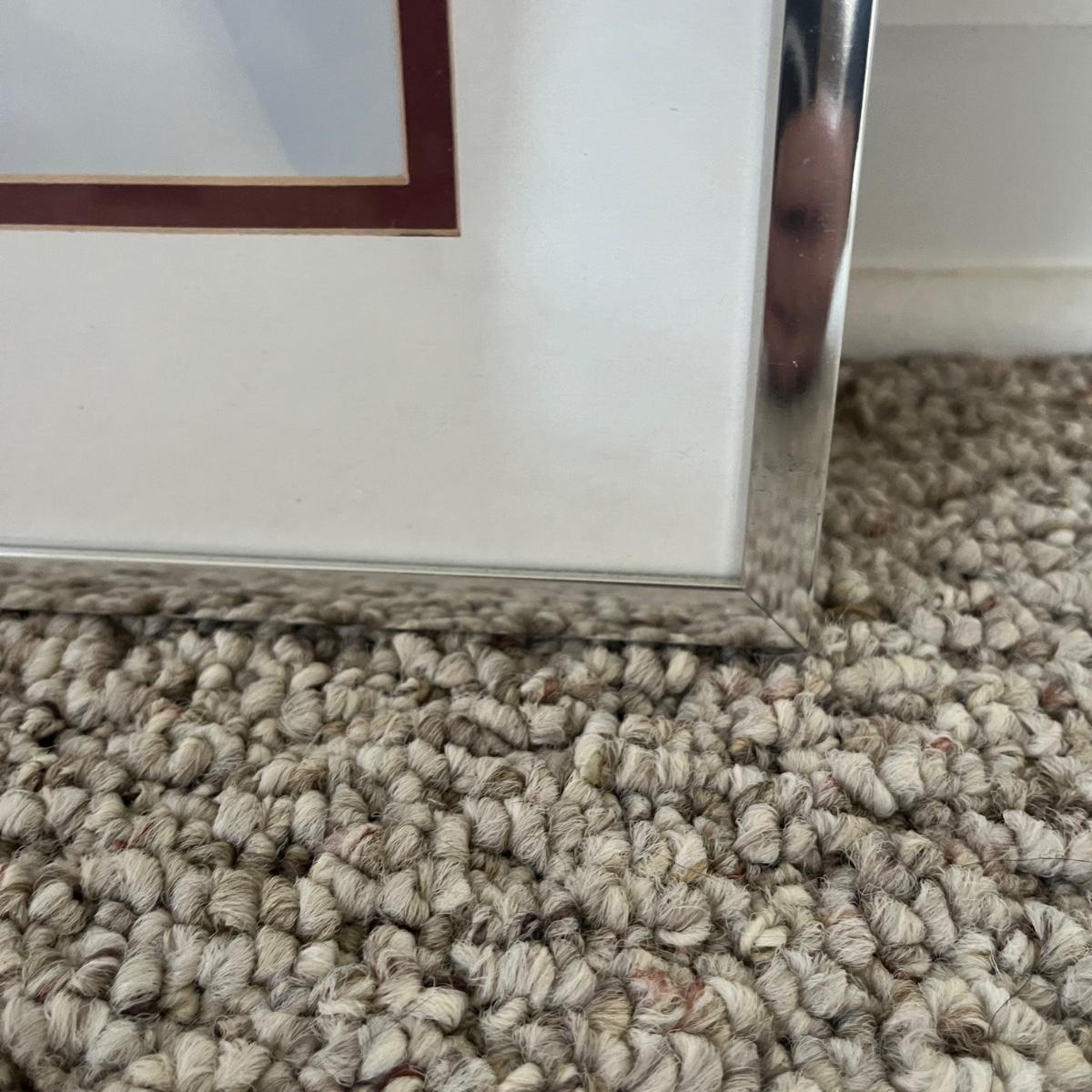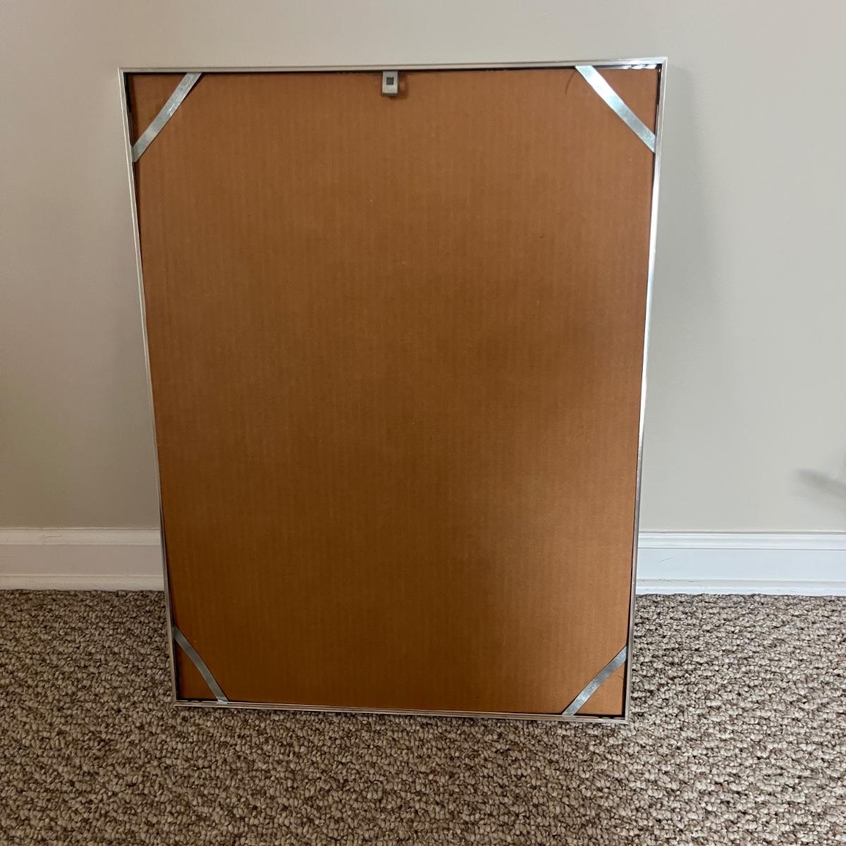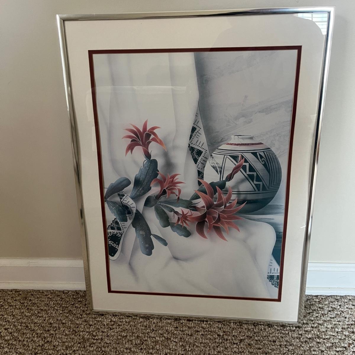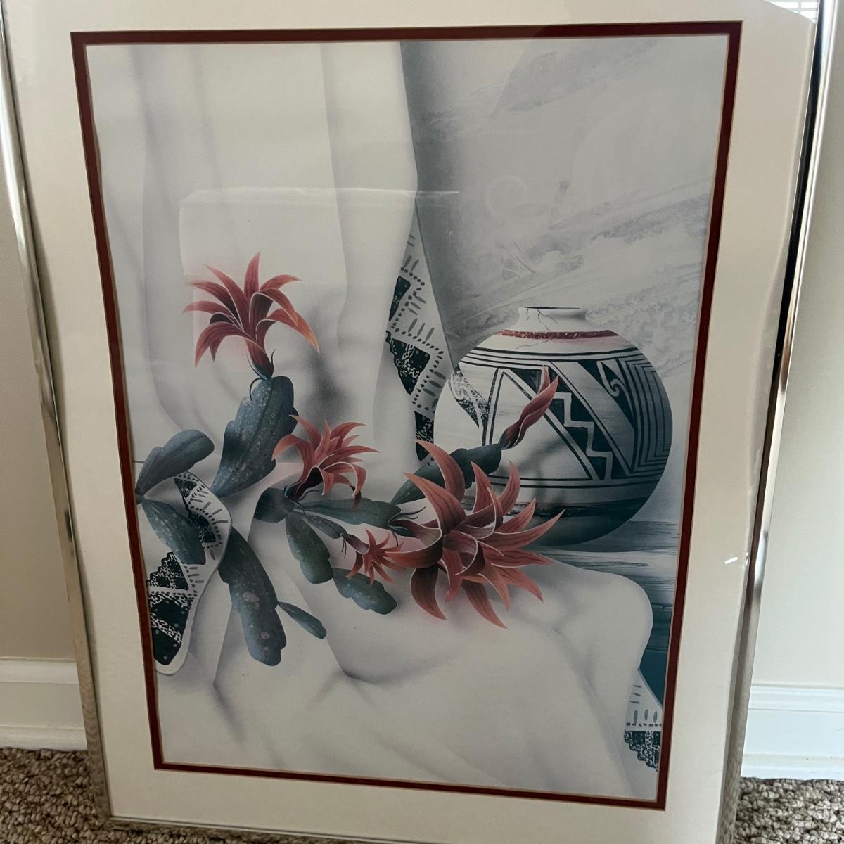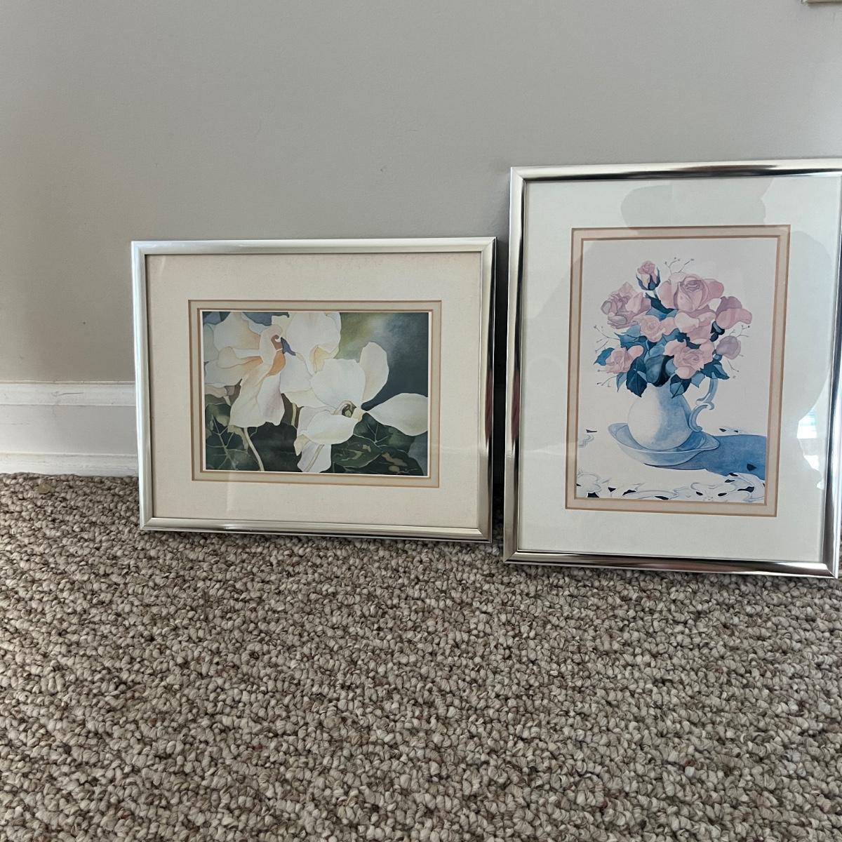 Lot includes three metal framed and matted pieces of art under glass. Largest frame measures 18.5” x 25”H.