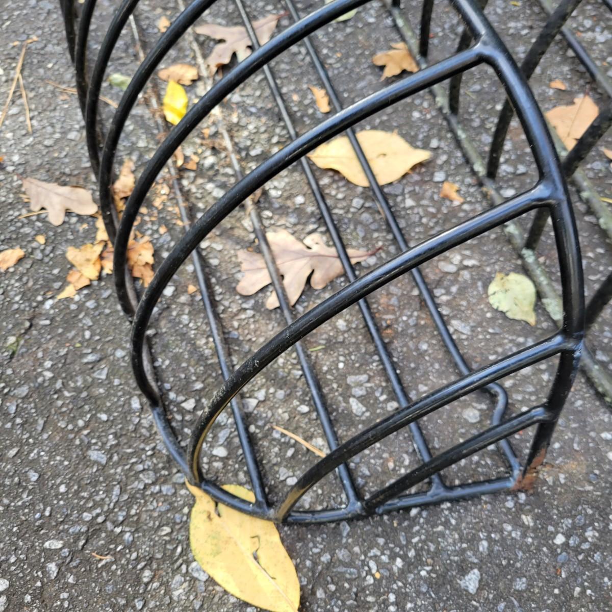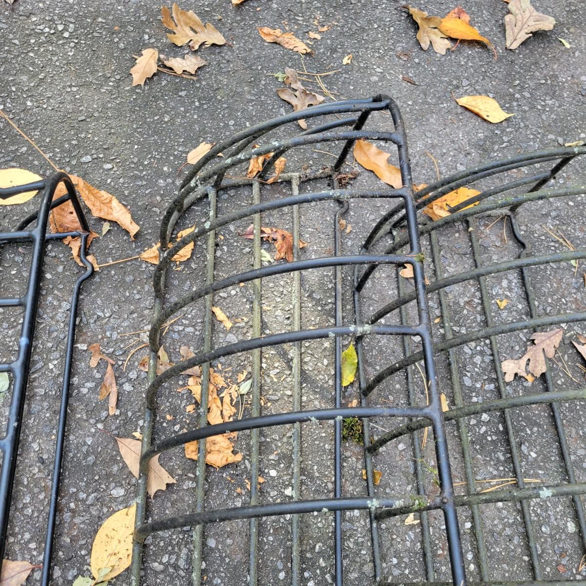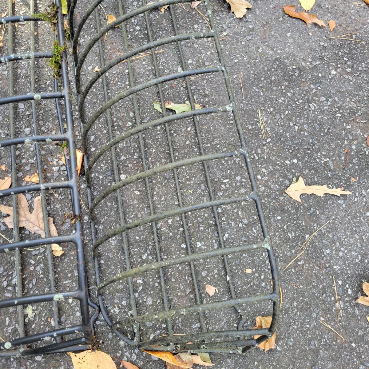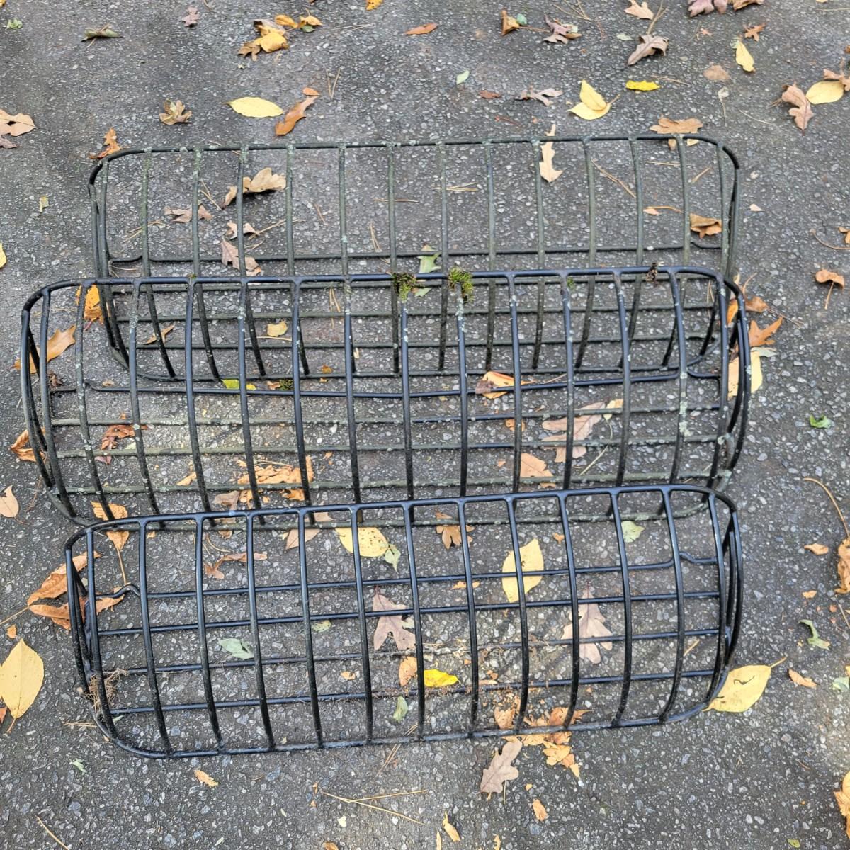 A collection of three metal wall hanging planters. Two match in size and one is slightly smaller. The larger planters measure approximately 44" x 11" x 10"H. Local pickup only