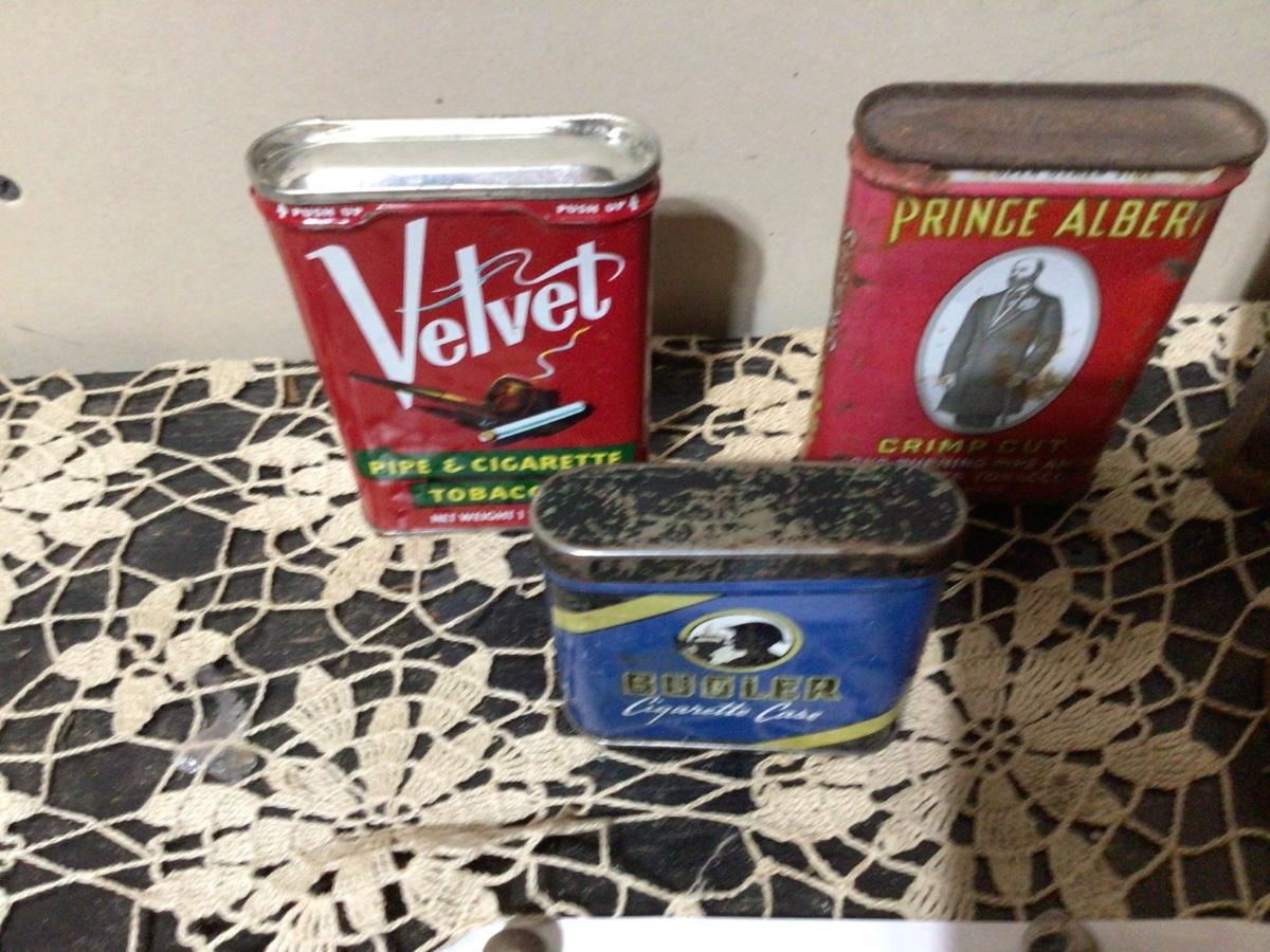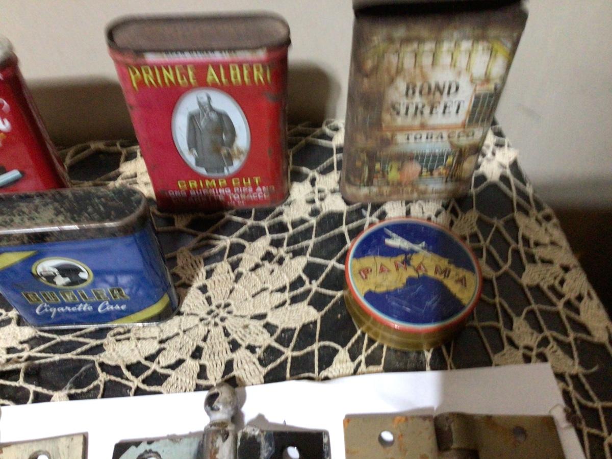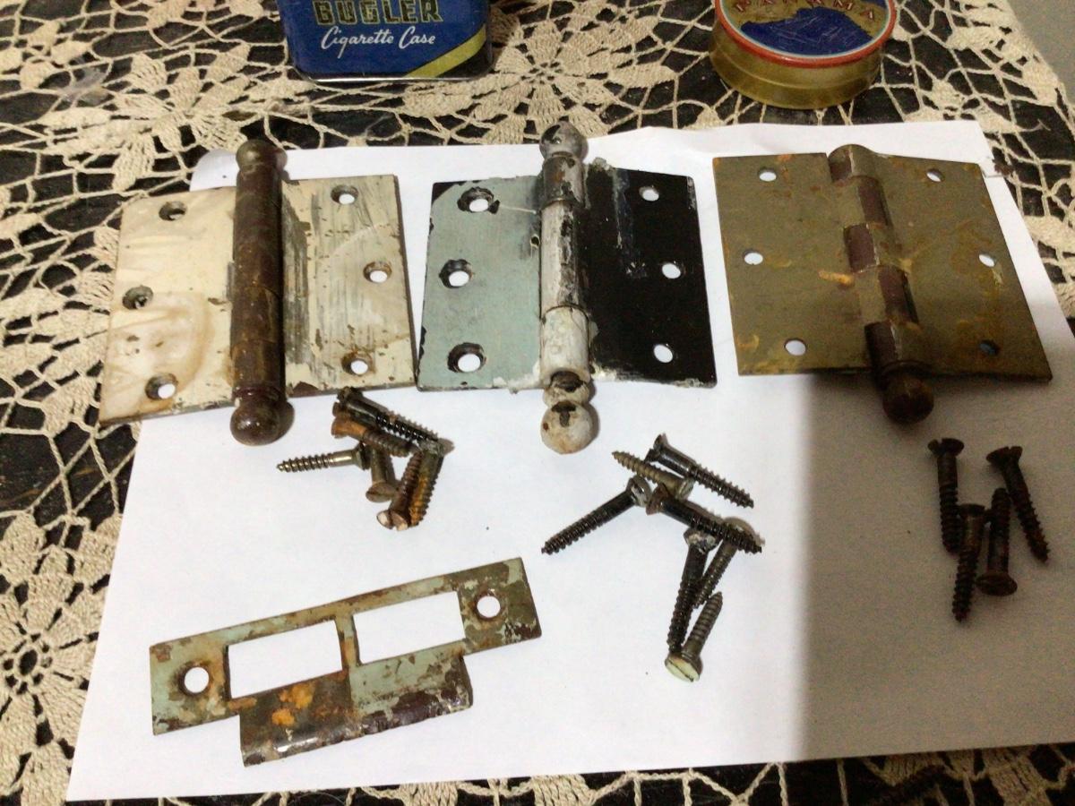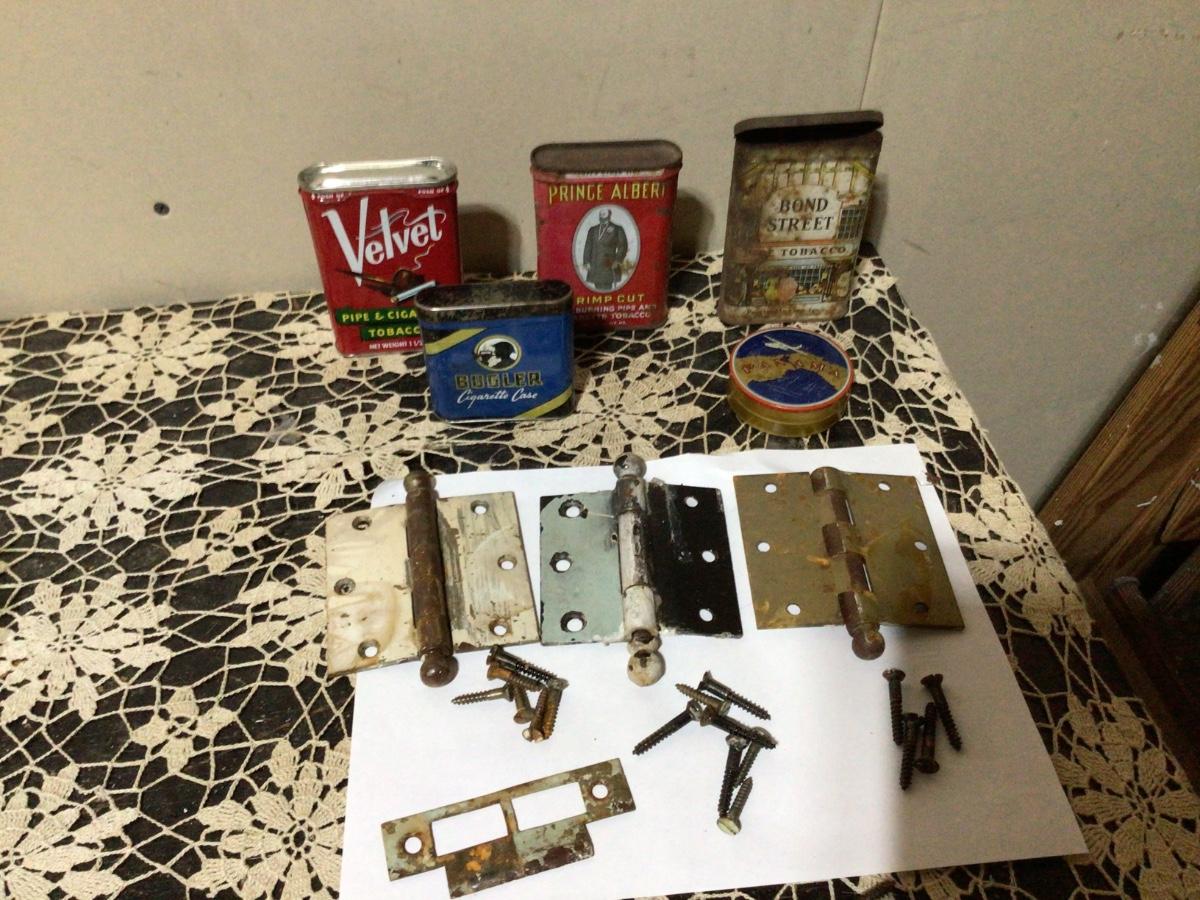 You get three individual large metal hinges with hardware. You also get5 tobacco tins (Velvet, Prince Albert, Bugler, and Bond Street