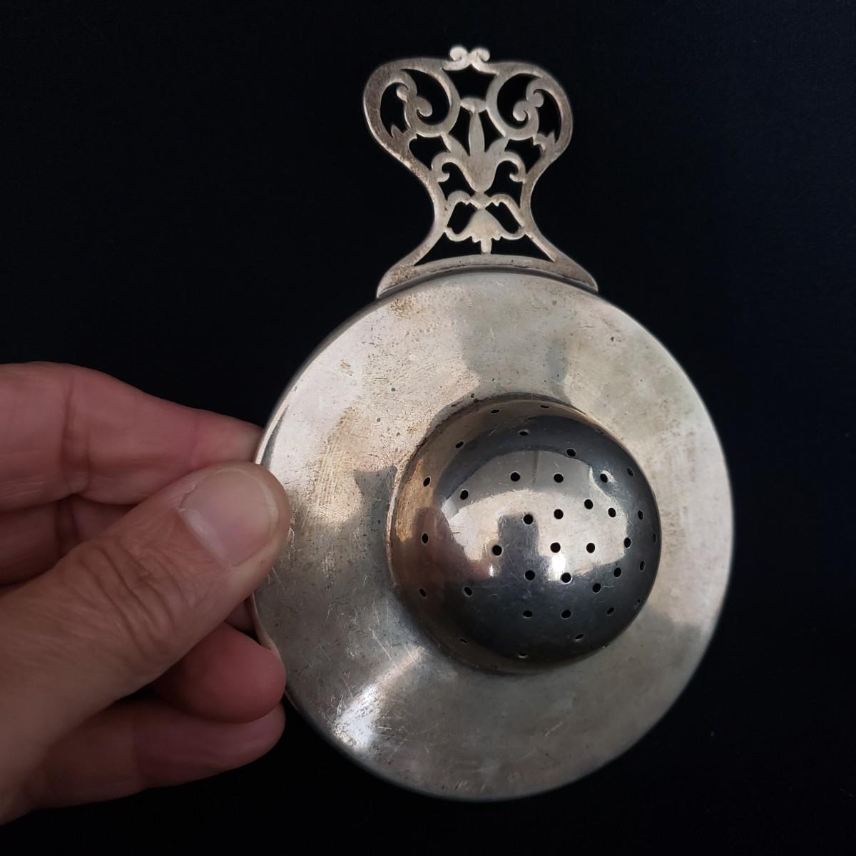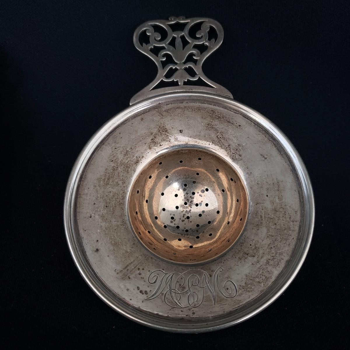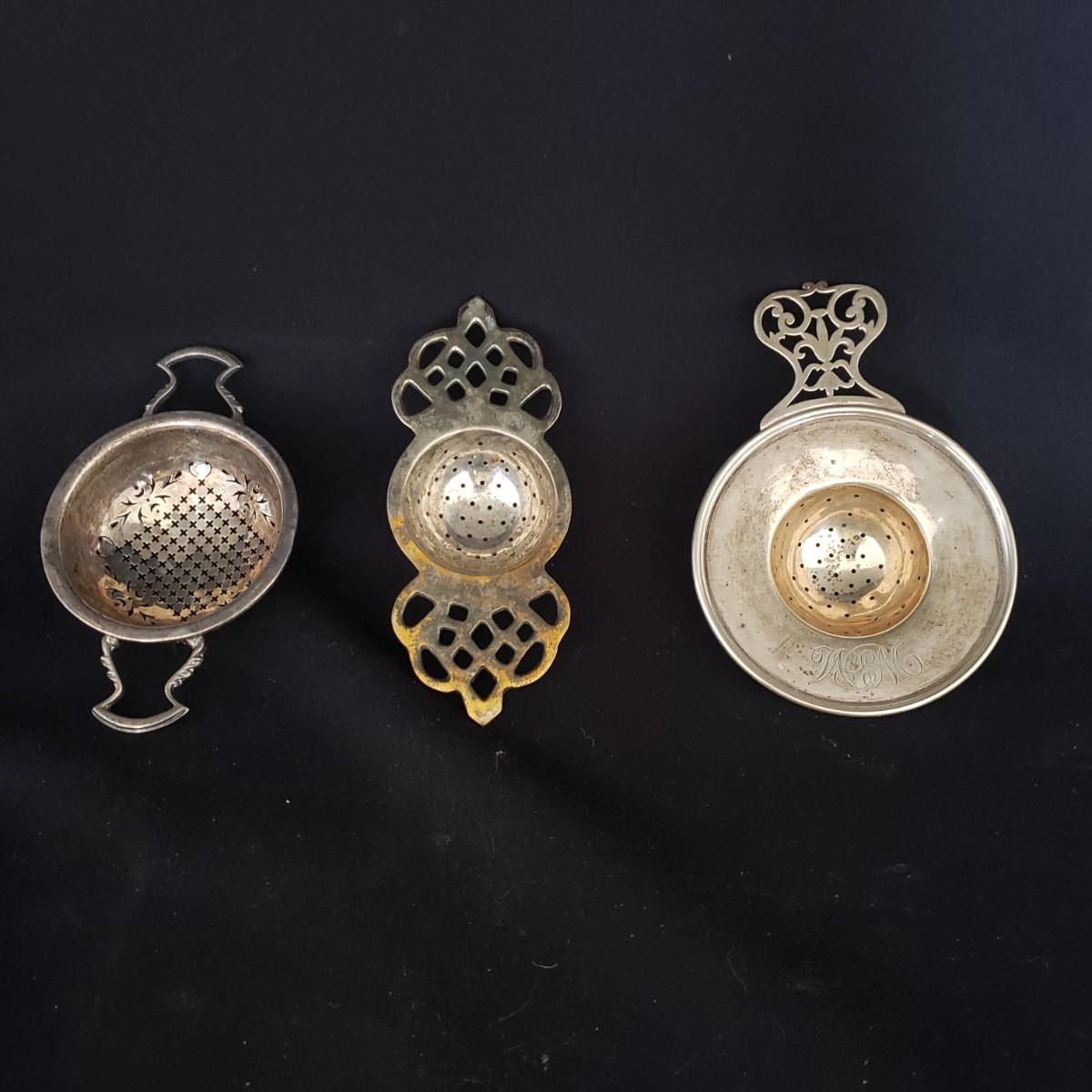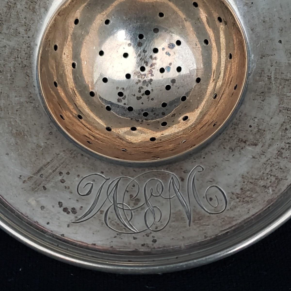 These three loose tea strainers measure approximately 3" x 5". The solid rimmed strainer has an engraved monogram "WSM". The last one pictured has a small dent, which is shown, but may be difficult to see in the last two pictures.