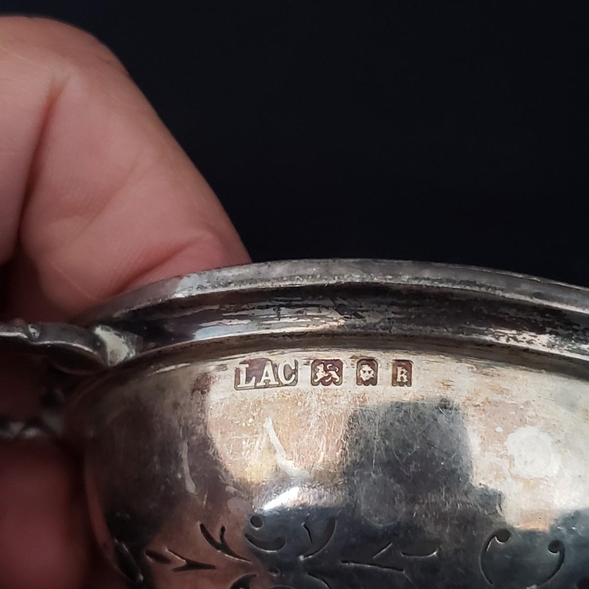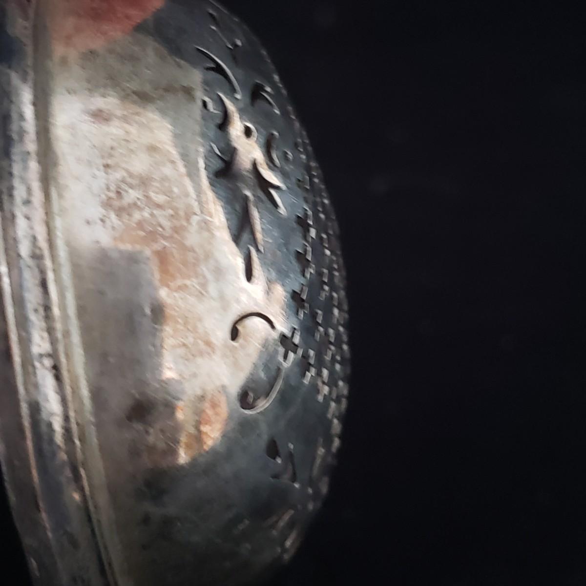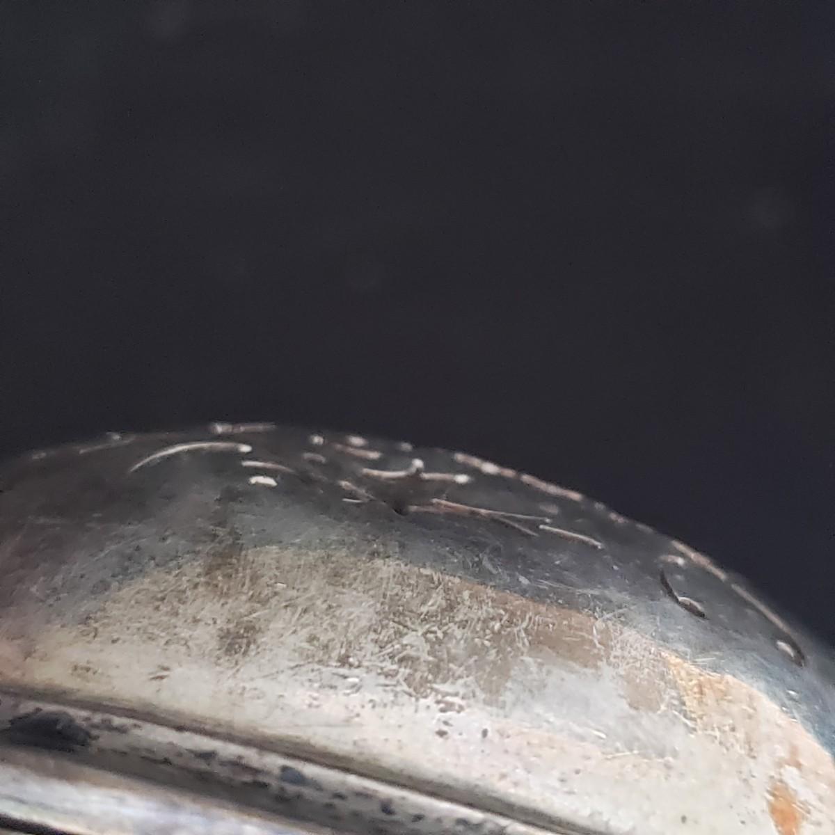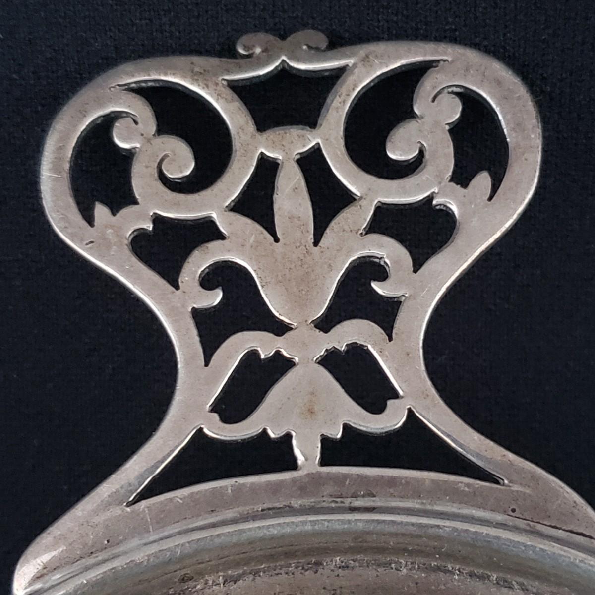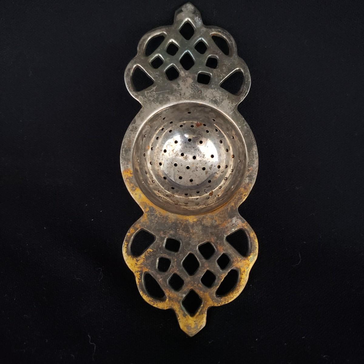 These three loose tea strainers measure approximately 3" x 5". The solid rimmed strainer has an engraved monogram "WSM". The last one pictured has a small dent, which is shown, but may be difficult to see in the last two pictures.