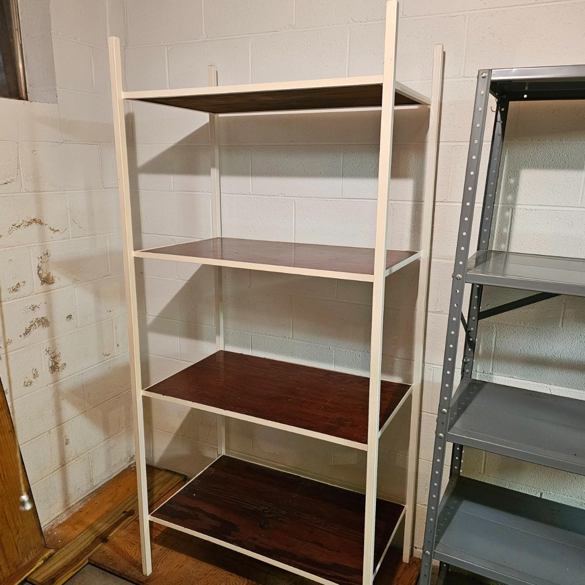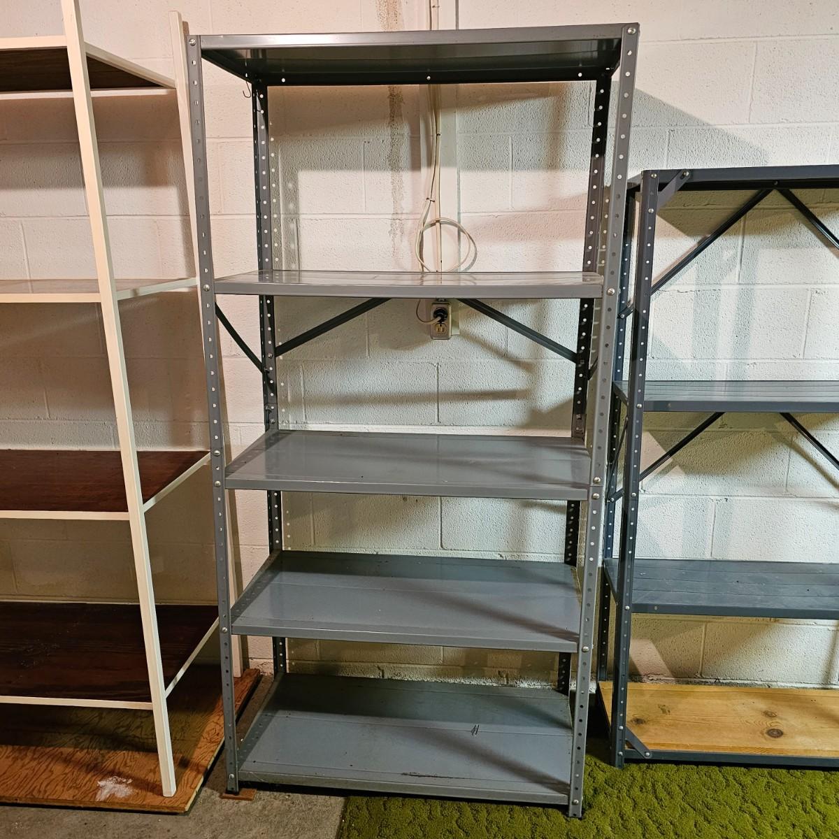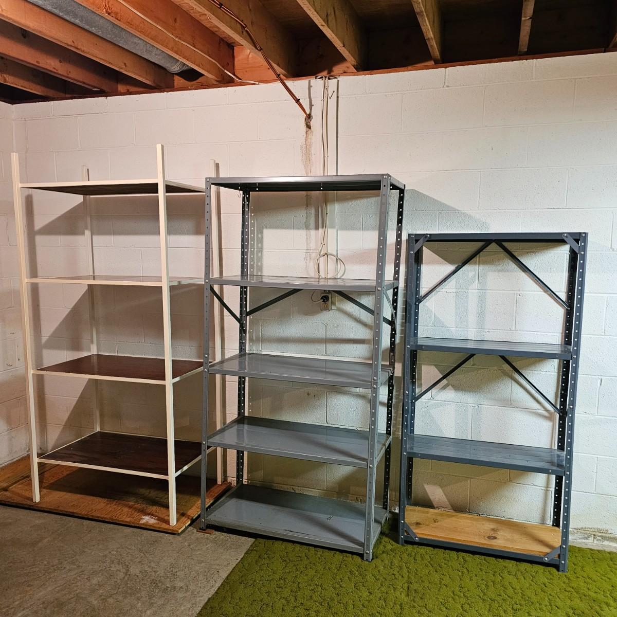 Three shelves for storage or other. All metal with some wood in one unit. White set is 36" x 22" x 76" H, has plywood insert shelves. This unit does not come apart. Middle tall grey unit is 36" x 18" x 72"H, has five shelves. Smaller unit is 30" x 12" x 61"H. See photos for details. Local pickup only.