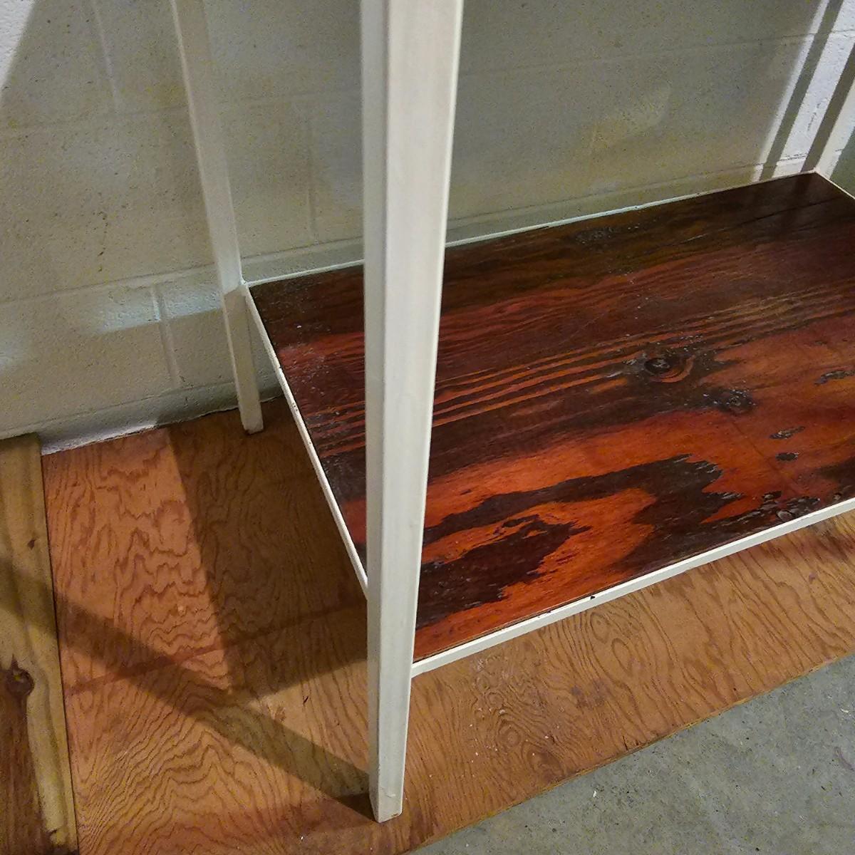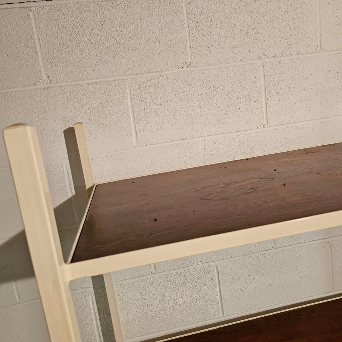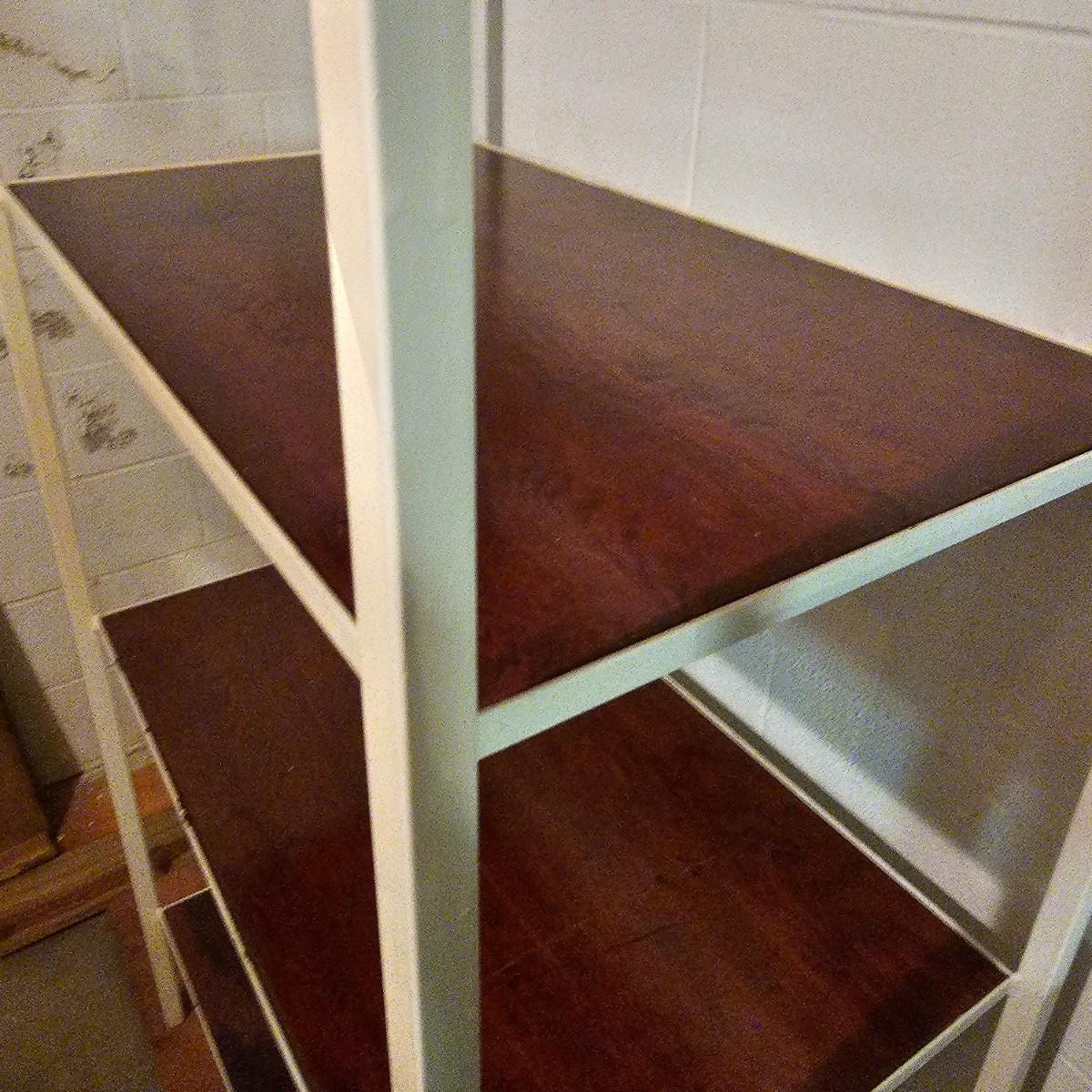 Three shelves for storage or other. All metal with some wood in one unit. White set is 36" x 22" x 76" H, has plywood insert shelves. This unit does not come apart. Middle tall grey unit is 36" x 18" x 72"H, has five shelves. Smaller unit is 30" x 12" x 61"H. See photos for details. Local pickup only.