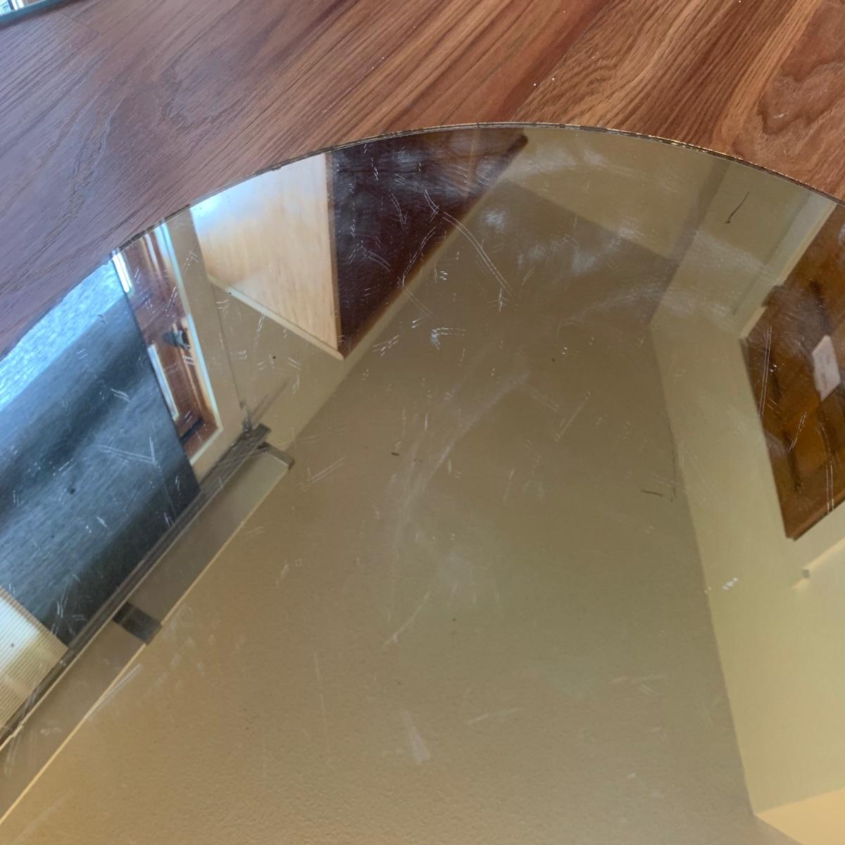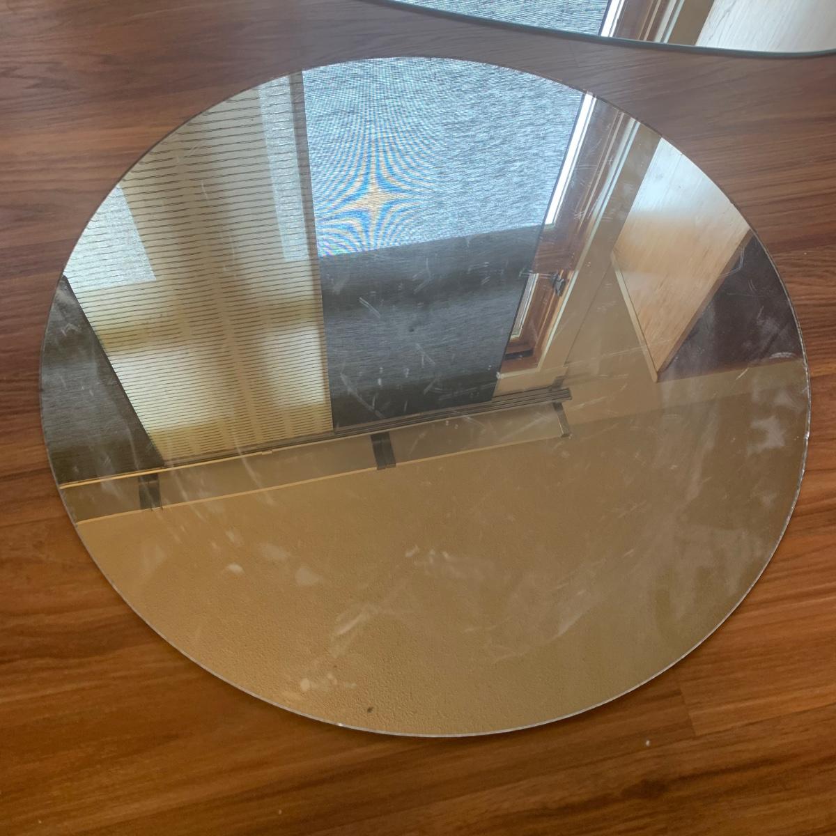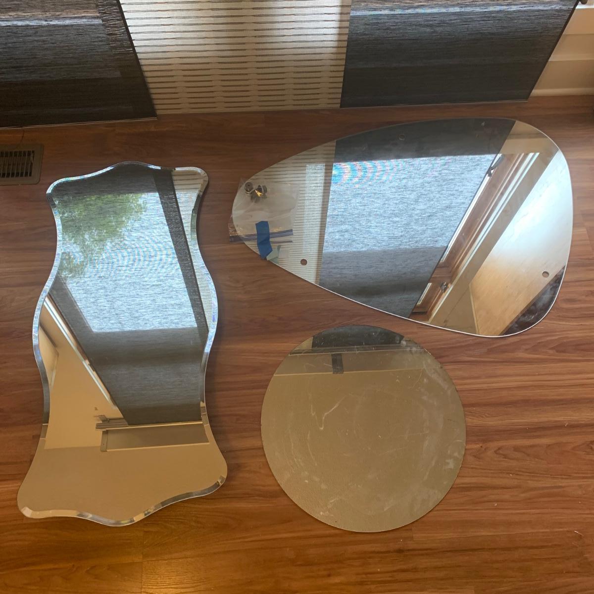 Two unique shaped IKEA mirrors and a circular one. The circular mirror shows some wear around the edges and is scratched on the surface. It is 19.5”D. The rectangular mirror is beveled and measures approximately 18” x 39.5”. Both IKEA mirrors have some hardware included.