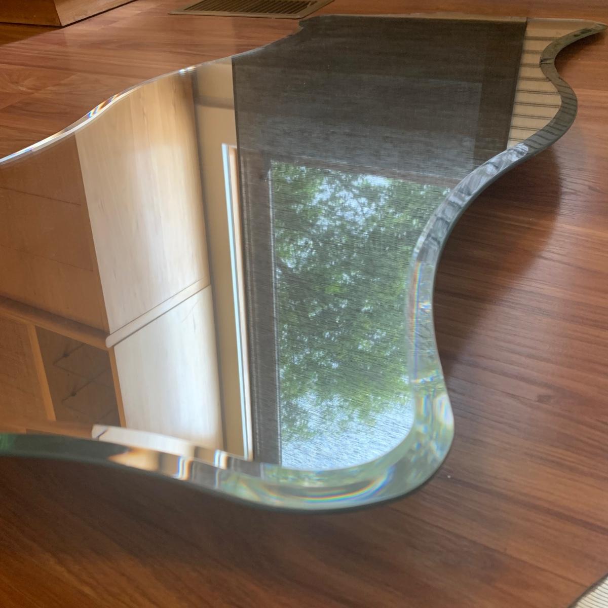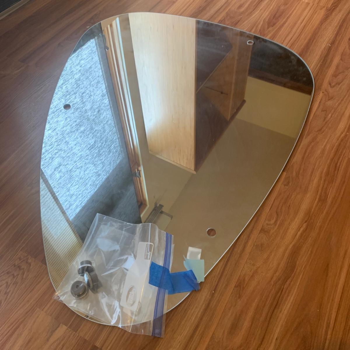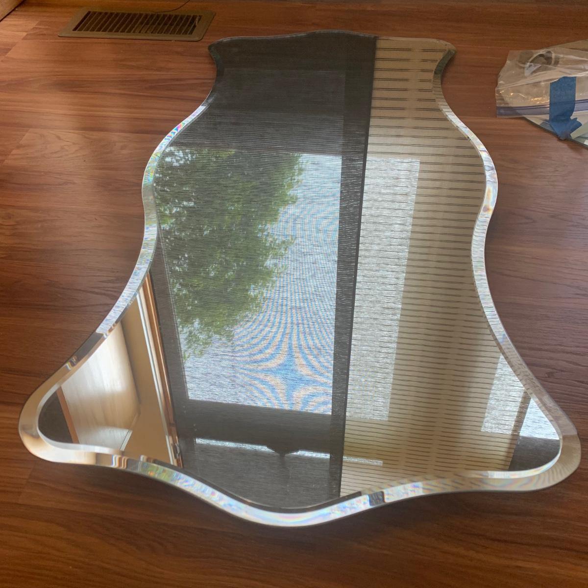 Two unique shaped IKEA mirrors and a circular one. The circular mirror shows some wear around the edges and is scratched on the surface. It is 19.5”D. The rectangular mirror is beveled and measures approximately 18” x 39.5”. Both IKEA mirrors have some hardware included.